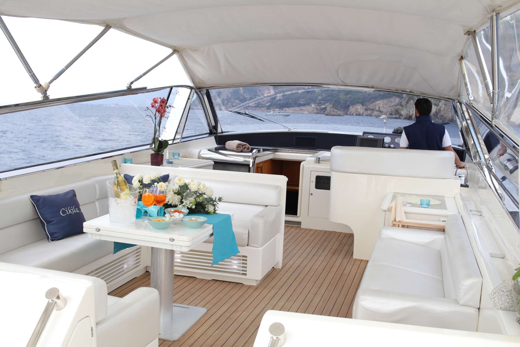 Cikila is a Leopard 23 Open Yacht, built in 2000 and fully refitted in 2022. She accomodates up t 8 guests in 3 comfortable cabins: a cosy full beam master cabin and two twins with an additional pullman bed. The beautiful main salon is classically decorated and features plenty of glossy wood finishes and soft cream leather upholstery. The dining area includes an innovative descending table, allowing the space to be transformed into a lounge area where guests can watch TV or simply relax while sipping a cool cocktail. The sun deck is equipped with a TV screen, a dining area with a drop-down table and a large sofa where you can relax with a drink. Guests will also find two comfortable sundecks, one at the bow and one at the stern, both equipped with cushions.