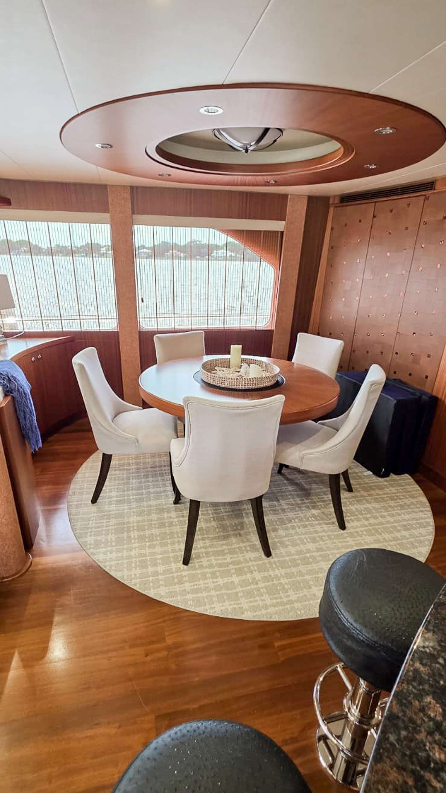 The vessel accommodates up to 4 guests across 2 private cabins, each with its own bathroom: a Master suite and a VIP stateroom. Located midship on the lower deck, the Master suite features a double bed facing a large TV screen. A desk/vanity area is positioned to the right, while a sofa sits to the left. Extensive wardrobe space flanks both sides of the bed. The en-suite bathroom, situated aft, includes a sink, toilet, and shower. The VIP stateroom also offers a double bed with an adjacent widescreen TV. It provides ample closet space and a private bathroom equipped with a sink, toilet, and shower. A professional crew of 3 ensures top-notch service throughout your journey.