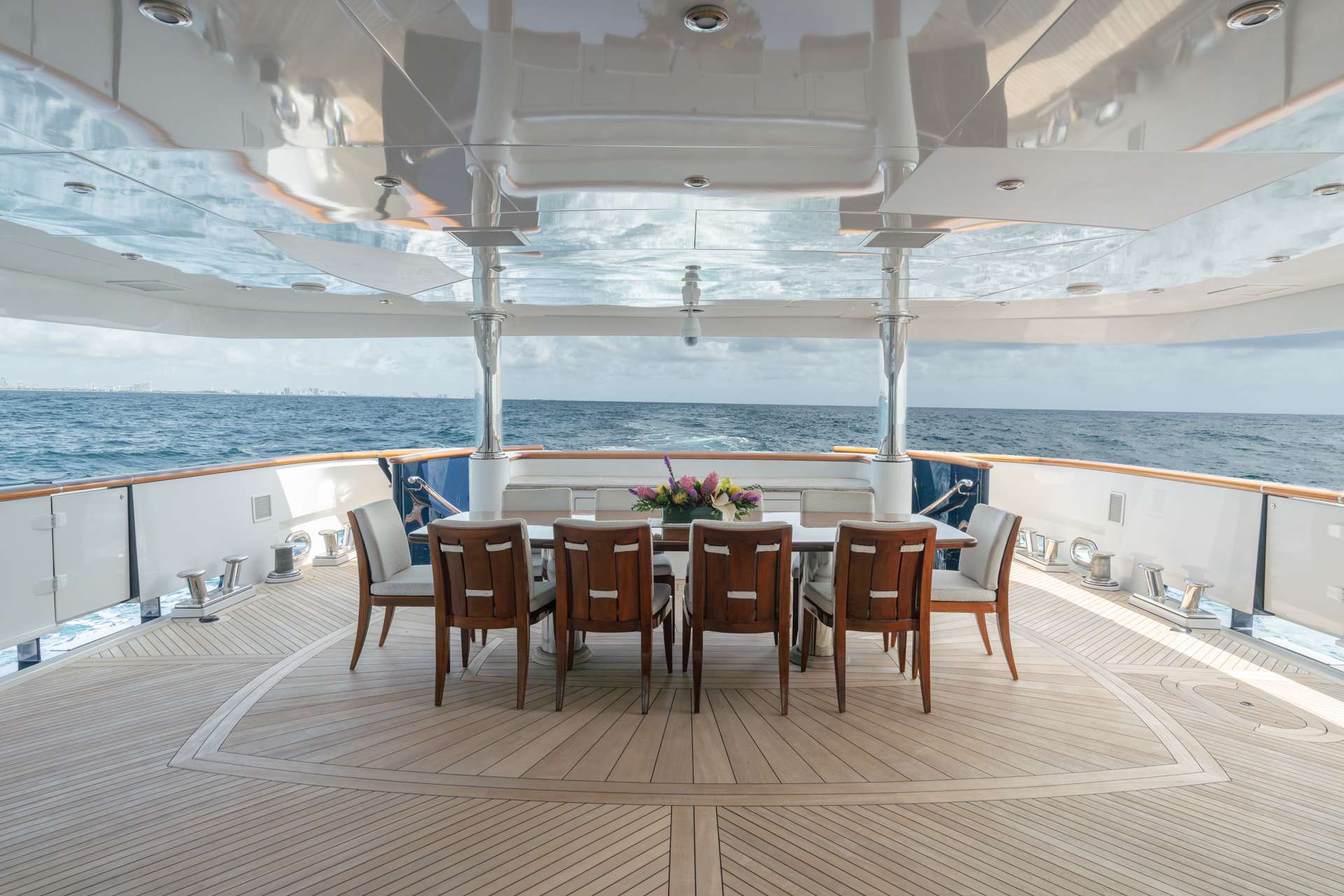 MISS CHRISTINE was christened in 2006 and built by Trinity Yachts. She has been impeccably maintained through the years and recently refit.MISS CHRISTINE features a dark cherry wood interior. Her highly customized interior features custom accents and artwork in ceiling panels of the main salon and sky lounge, a custom artwork piece in the dining salon and handpicked inlaid marble throughout her interior and master bathrooms. At 157' long and 28' wide, her interior and exterior offer guests abundant space along with luxurious surroundings. The shallow draft of 7' makes her a top pick for cruising in the Bahamas. MISS CHRISTINE is equipped with an ultra-modern stabilization system which reduces the roll motion while underway and at anchor. This ensures guests are comfortable at all times on board. The main salon offers a lounging area with entertainment system as well as formal dining forward. The sky lounge layout includes a full sit down bar, game table and comfortable living room area. The aft deck on the main salon level has a beautiful wood table for dining and access to the swim platform and all of the water toys. On the sky lounge many fun themed dinner parties happen at the enormous round table for 12 and there are also aft lounging areas and stairs to the sun deck. The Jacuzzi on the sun deck is a popular guest area and there are sun beds surrounding, a dining option, gym equipment, an assortment of water toys. MISS CHRISTINE operates with a crew of 9 who have many years of charter experience and several charter groups that have returned for multiple charters.