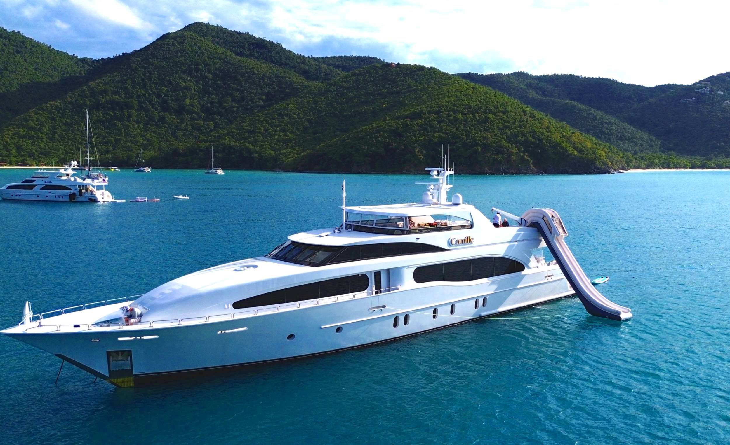 Live the dream on the 124', five stateroom CAMILLE- where timeless opulence meets modern style. Her oversized main salon windows highlight the beautiful cream and light blue interior with contrasting custom beautiful wood design. CAMILLE accommodates ten guests in five staterooms with the master full beam stateroom on deck. Forward of the master is the large master bathroom with sky lights, his and hers sides separated by a shower and full closets forward. Below midship there are four additional staterooms with various guest configurations, including a king, two queens and a twin room. CAMILLE's raised pilot house configuration leads to the best part of the yacht, the enormous fly bridge. This area provides another al fresco enjoyment spot as large as the main salon. This is the ideal enjoyment area and hangout space for everyone. Forward on the fly bridge is covered by a hard top for shade and offers seating, dining and full bar area with entertainment. Just aft there is a large Jacuzzi, sun lounges and without the normal toy storage area, the entire deck is guest enjoyment space. Aboard CAMILLE the wave runners are tucked away in the aft deck and easily accesses along with the towed tender and full list of toys. T