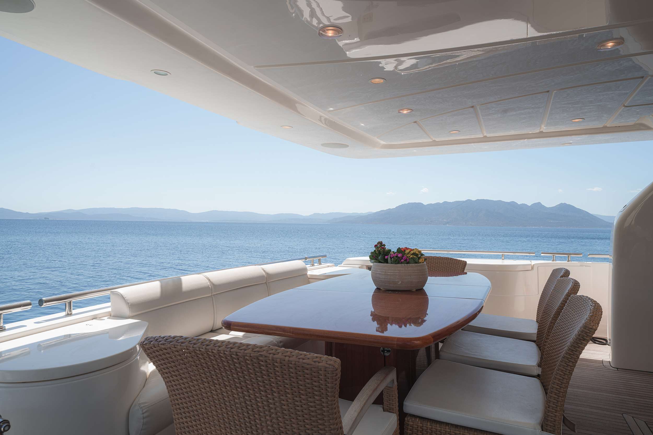Cikila is a Leopard 23 Open Yacht, built in 2000 and fully refitted in 2022. She accomodates up t 8 guests in 3 comfortable cabins: a cosy full beam master cabin and two twins with an additional pullman bed. The beautiful main salon is classically decorated and features plenty of glossy wood finishes and soft cream leather upholstery. The dining area includes an innovative descending table, allowing the space to be transformed into a lounge area where guests can watch TV or simply relax while sipping a cool cocktail. The sun deck is equipped with a TV screen, a dining area with a drop-down table and a large sofa where you can relax with a drink. Guests will also find two comfortable sundecks, one at the bow and one at the stern, both equipped with cushions.