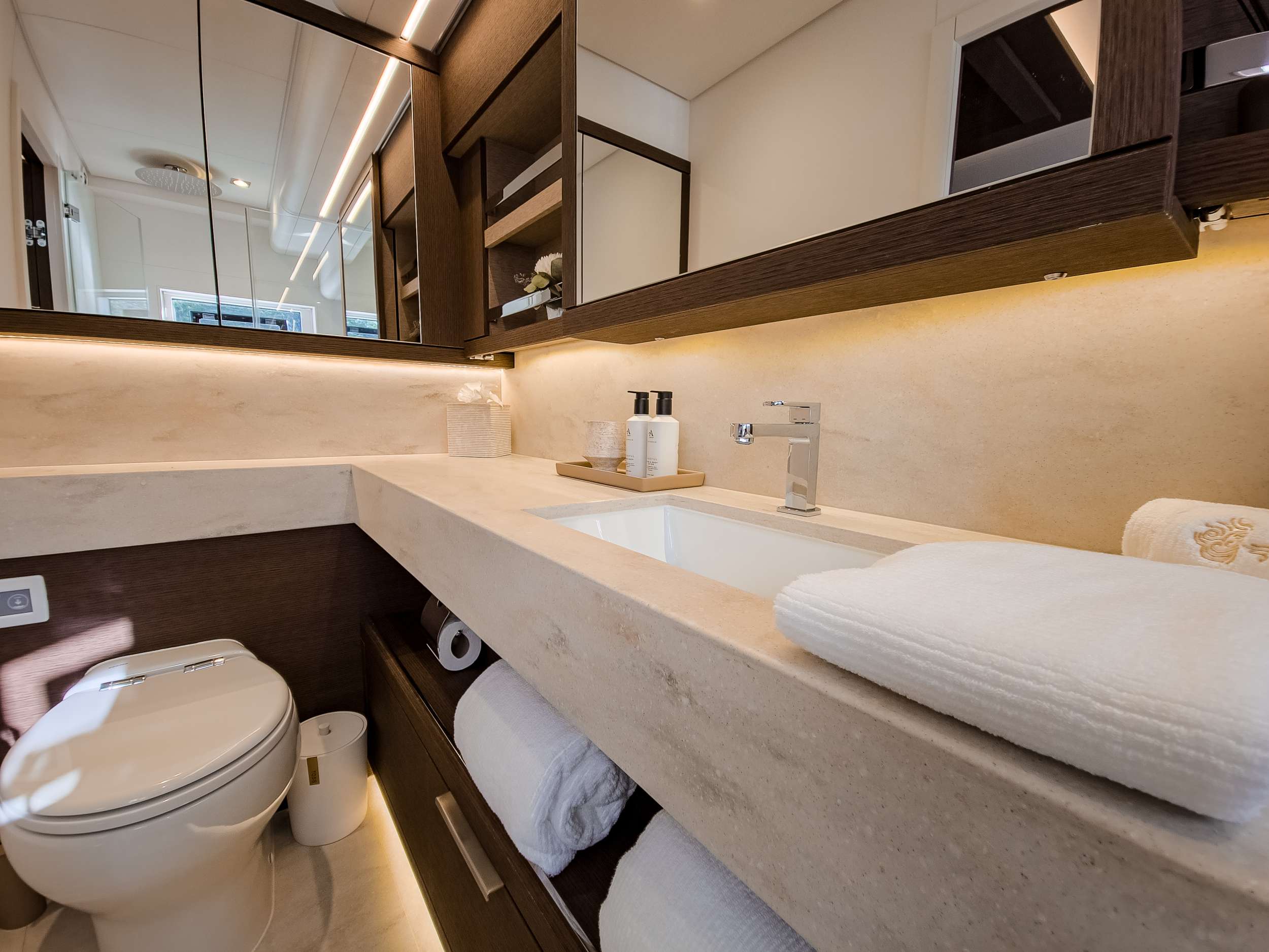 Accommodates 8 guests in 4 spacious ensuite queen "plus" size cabins including an amazing primary stateroom. plus, the port aft cabin can be either two single beds or converted to a queen "plus" berth.