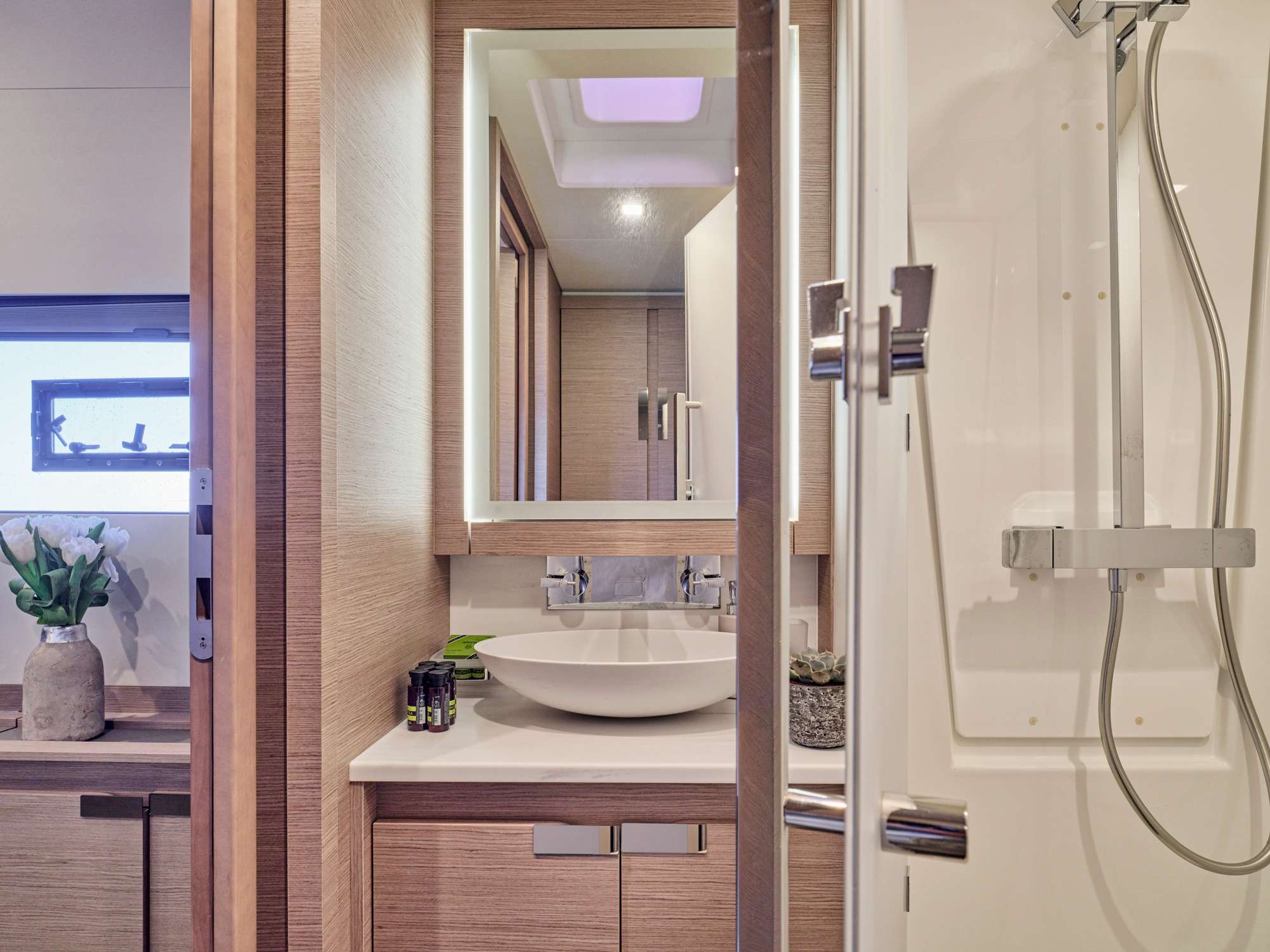 1 Owner's suite with double bed (size between queen and king bed) and private bathroom. 3 Double cabins with queen beds and 3 bathrooms.