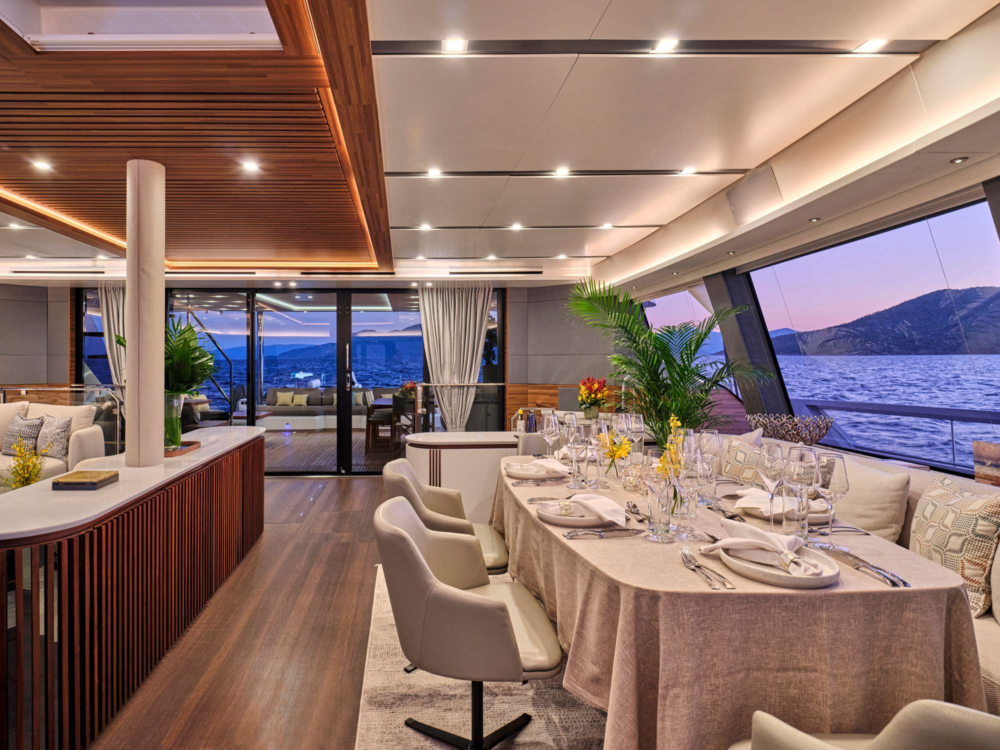 Unveil the exquisite Alina a Fountaine Pajot power 80 catamaran designed to charm and delight up to 10 guests in 5 lavish cabins, accompanied by a crew of 5 members. As the crowning jewel in Fountaine Pajot's esteemed motor yacht collection, Alina embodies unparalleled elegance and sophistication. Crafted with extended cruising in mind, Alina offers a living space of unparalleled grandeur and vast outdoor areas ready for exploration. Renowned for its exceptional design, luxurious materials, and cutting-edge technology, Alina stands as a masterpiece at sea. Prepare to be captivated by her captivating aft cockpit, featuring multiple seating areas, and her opulent foredeck complete with a deck jacuzzi, sunbathing lounges, and a convenient wet bar for sun-soaked relaxation in style. Ascend to her expansive flybridge, where a dining table awaits for unforgettable 'al fresco' dining experiences with panoramic ocean views. Indoors, the main saloon beckons with a chic galley up layout perfect for interactive culinary experiences with a top-tier chef. Indulge in the luxuriously appointed cabins, including a magnificent owner's suite and five gracious guest accommodations. Alina by Fountaine Pajot encapsulates opulence and adaptability, offering a sublime fusion of luxury, performance, and space to delight discerning clients in search of a truly extraordinary and memorable cruising experience. This is not just a voyage; it's a grand adventure awaiting your embarkation.