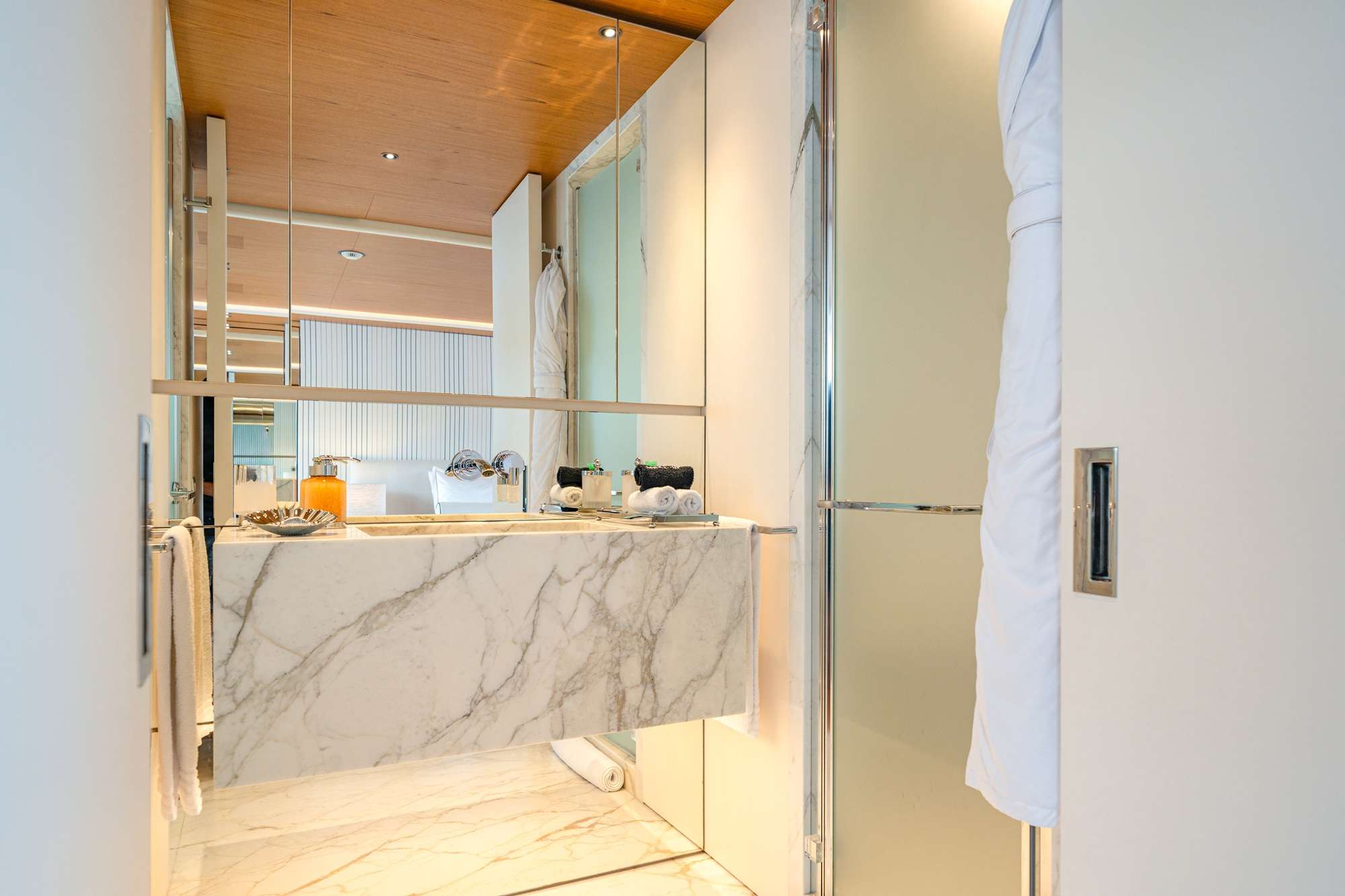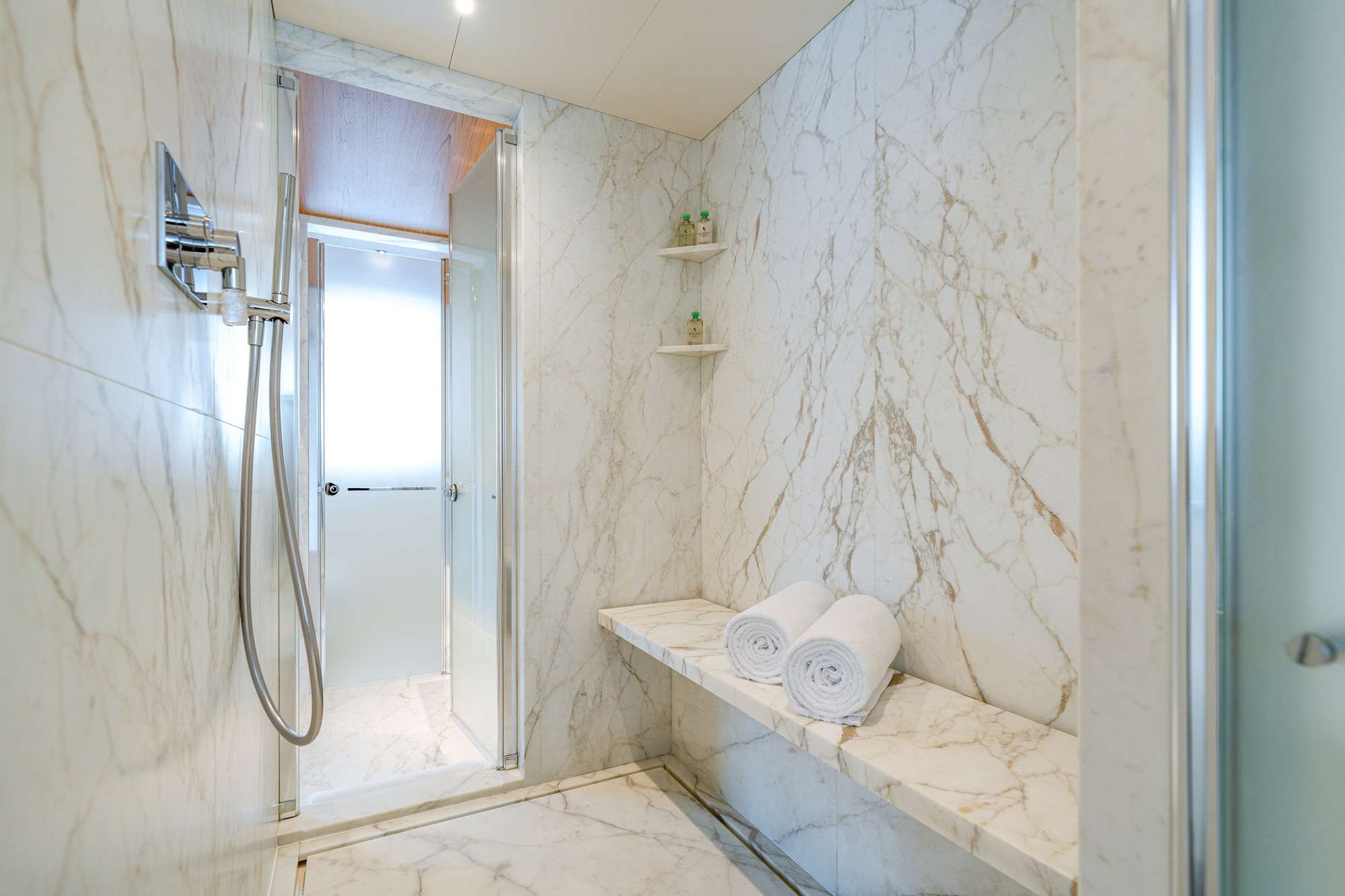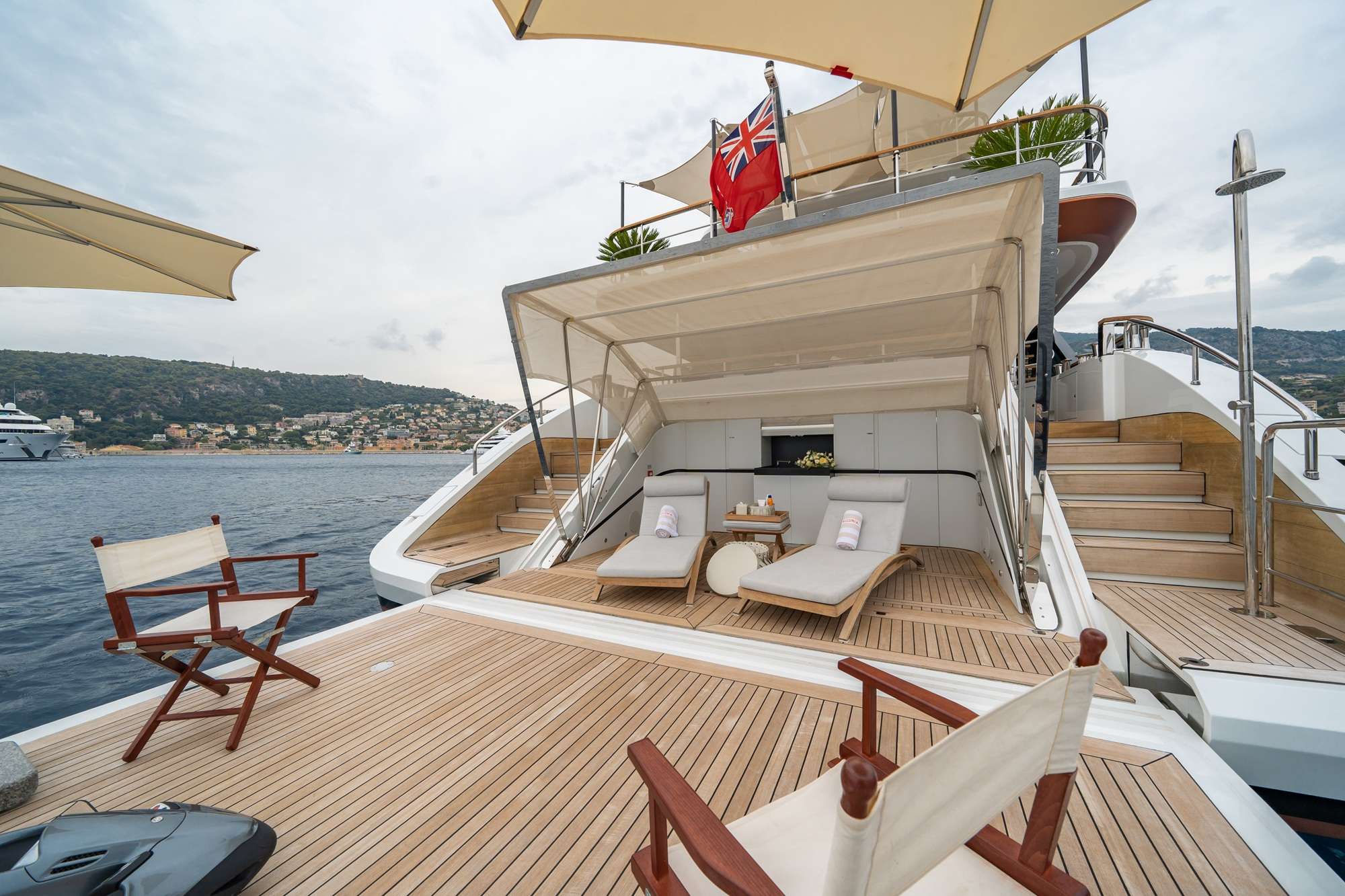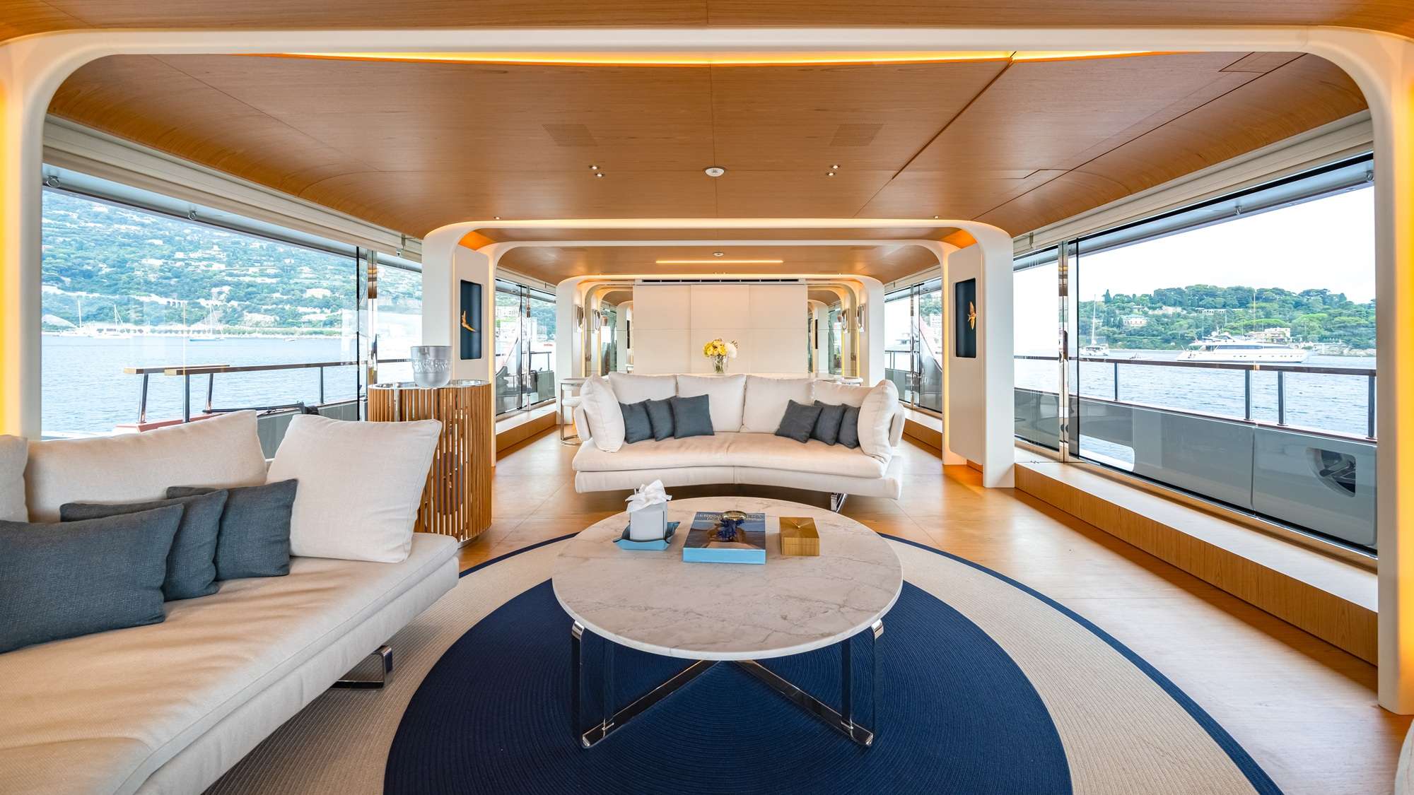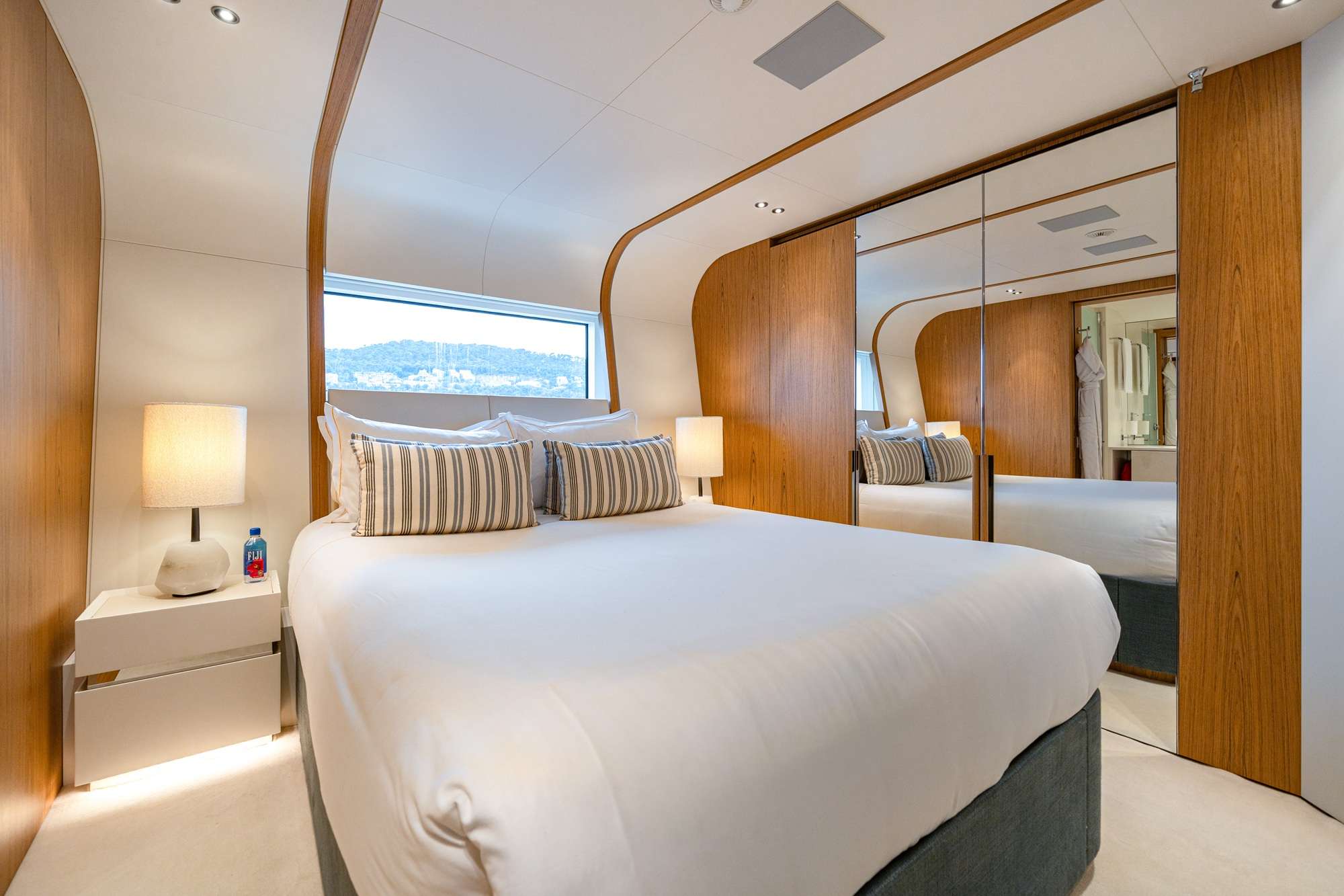 Delivered in 2023, ALLURIA's contemporary interior, light-flooded rooms, and modern features are inspired by the glamorous Motopanfilo yachts built over 50 years ago. Accommodating 10 overnight guests in five cabins, she has a multitude of communal spaces and amenities to appeal to a mixed charter group or families alike. One of her many highlights is the 'cocoon-style' observation deck that provides an intimate space to enjoy a morning coffee or evening sundowner while taking in sweeping views. The spacious Hamptons-style beach club invites guests to relax in the sun at sea-level and features a retractable fabric canopy providing ample shade when needed; as well as a platform for easy access when enjoying one of the yacht's broad selection of water toys. Her foredeck outdoor pool lounge is yet another exterior space to soak up the sun, with plush sun pads and a large swimming pool. ALLURIA's floor-to-ceiling windows, clever use of mirrors, and open-plan interior create an environment that is bright, sophisticated, and connected with the surrounding ocean. The main salon features wide-spanning windows, allowing guests to take in the incredible panoramic views even indoors, socializing on her comfortable sofa, sipping a cocktail by the cylindrical bar cabinet or enjoying a sunset dinner in her formal dining area. She provides seamless flow from the interior main salon to the main deck aft. Each of the cabins are well-appointed. The vast full-beam, on deck master suite is designed with natural light from the surrounding panoramic windows. It also features a private seating space that can be used as an office, a vanity and a generous en suite bathroom. Her four additional guest cabins are well-appointed and ideal for families, mixed groups and couples.