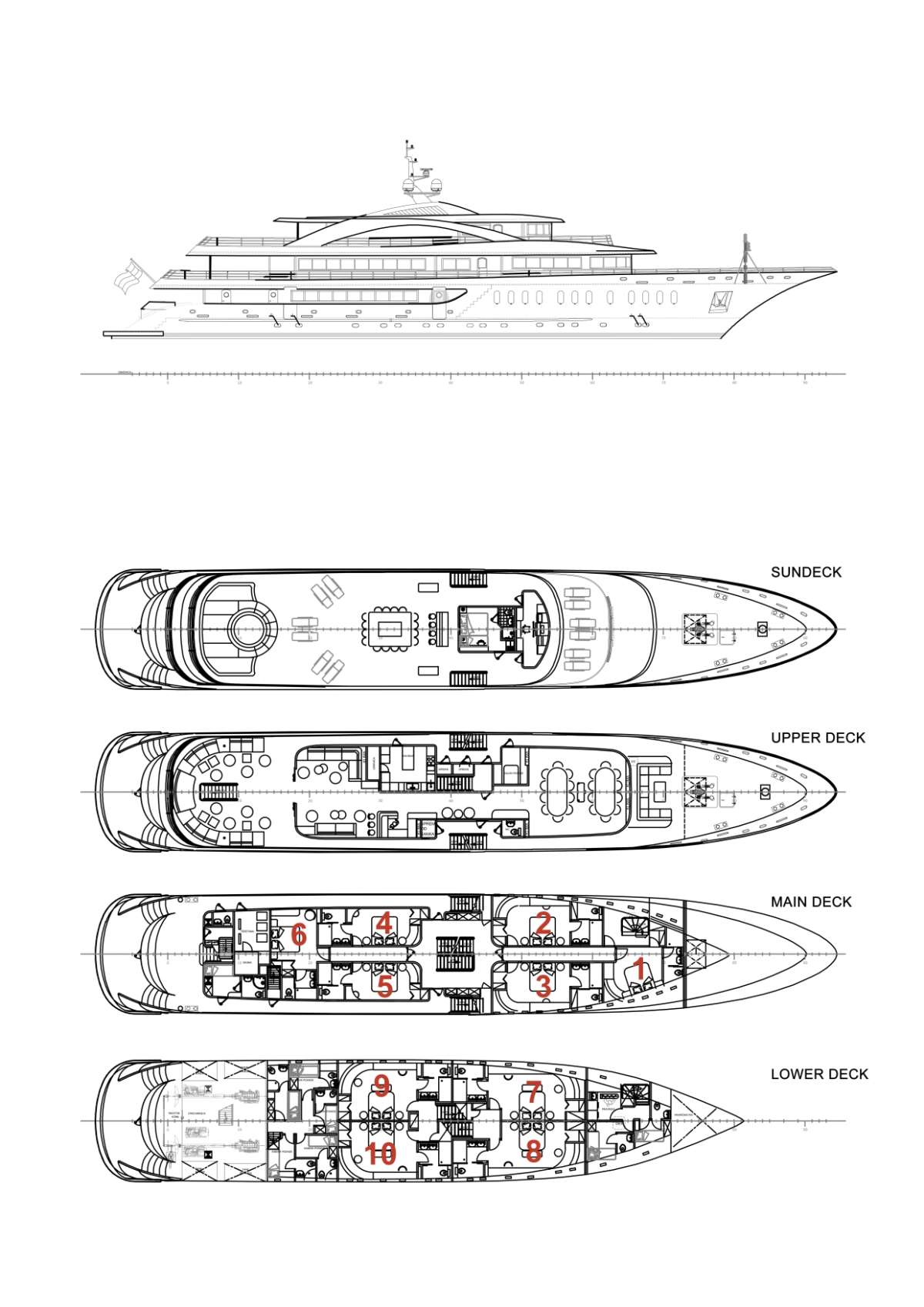 10 Luxury guest en-suite cabins: 6 guest cabins on the main deck and 4 guest cabins on the low deck: Main deck: Master cabin 25m2 with king-size double bed 3 x VIP cabins 20m2-24m2 with king-size double bed 2 x Guest cabins 19m2 with king-size double bed convertible into twin beds cabins Low deck 2 x VIP cabins 29m2 with king size double bed 2 x VIP cabins 29m2 with king size double bed convertible into twin beds cabins