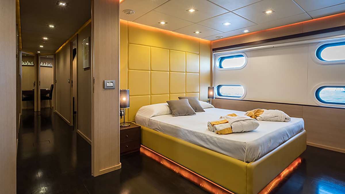 ARIA boasts spaces incomparable for a vessel of that size! 3 double bedded cabins and 2 twins. Each cabin has its own bathroom, desk, TV and safe.