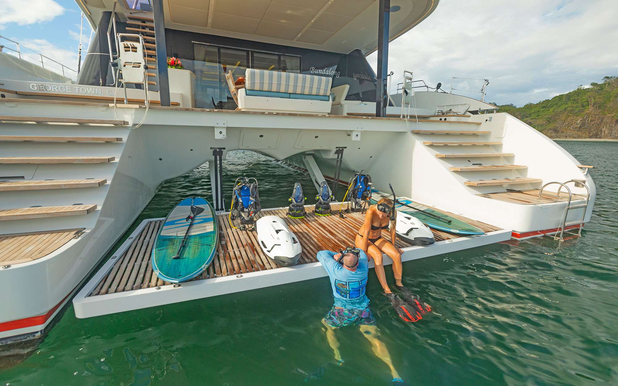 BUNDALONG has 3,700+ square feet of living space on three decks. This allows guests to be together or find a quiet spot for reading and sunbathing. The crew are very knowledgeable of French Polynesia where she is cruising for the 2025 Summer. She is a fabulous yacht for visiting the South Pacific great water toys for making the most of the lagoons. She is sure to delight and surprise guests and is an ideal yacht for family charters or four couples.