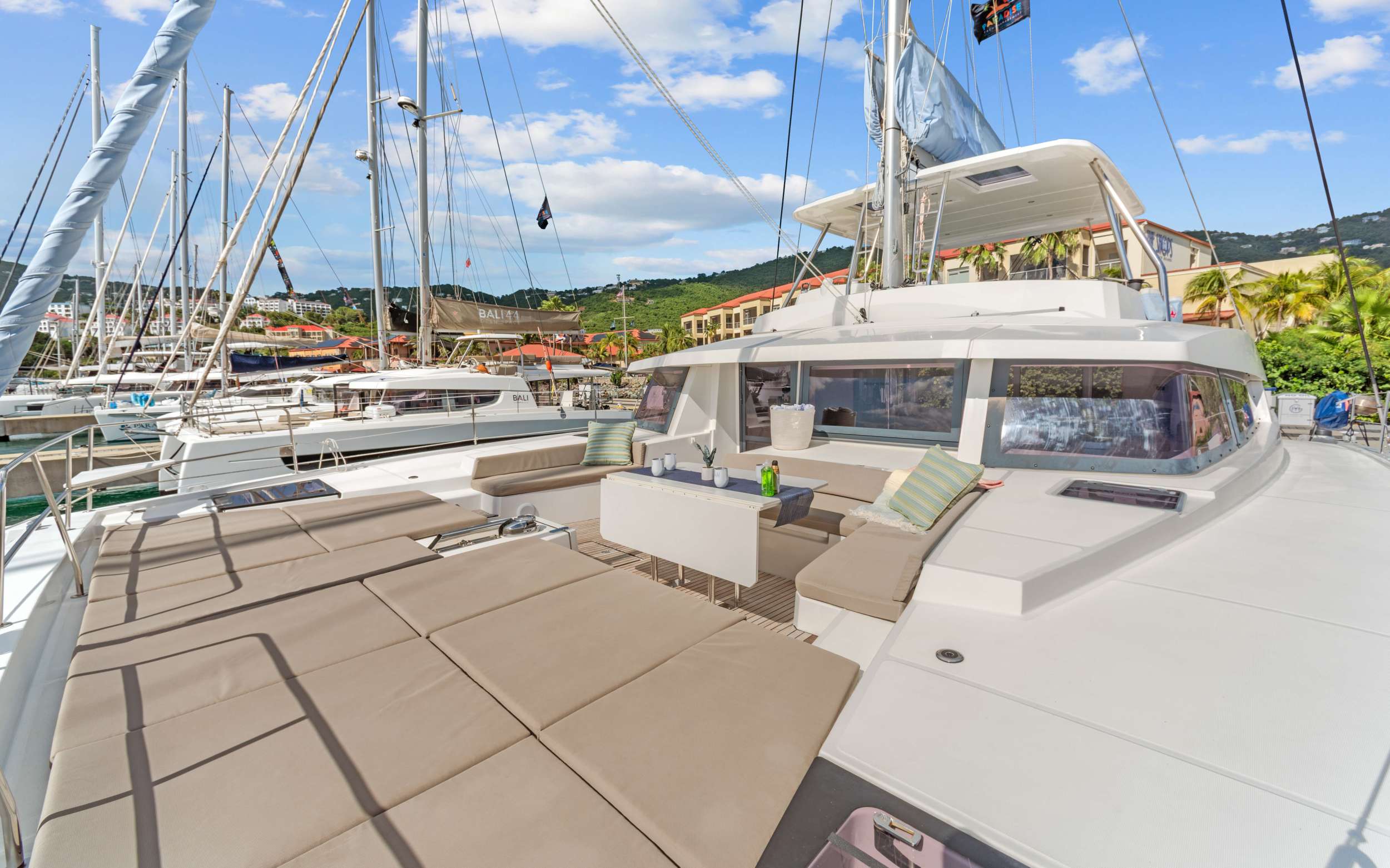 Step aboard CHILLIN' HUT, a luxurious 2025 Bali 5.4 sailing catamaran where cutting-edge performance meets elevated comfort. Launched in January 2025, this spacious and stylish yacht is built for effortless cruising and unforgettable getaways—perfect for families, couples, or groups of friends seeking an immersive charter experience. Designed with both functionality and indulgence in mind, CHILLIN' HUT features a spacious owner's suite with a walk-around bed and three additional queen cabins—each with its own ensuite freshwater electric flush toilet—plus a compact, yet thoughtfully designed, forepeak berth that's perfect for a young adult or a solo traveling friend. Altogether, the three-level layout comfortably accommodates the crew and up to 8-9 guests. Equipped with twin Yanmar 80HP engines and state-of-the-art Raymarine navigation electronics, she's as smooth underway as she is luxurious at anchor. Bali's “Open Space Concept" boasts clean modern lines, teak flooring throughout, and a welcoming saloon that blends seamlessly into the outdoors thanks to Bali's signature hydraulic tilting aft door, wide forward-opening windows, and an innovative galley-to-bow door that opens directly onto the expansive forward lounge. Chill in the flybridge's cushioned lounge areas, enjoy alfresco meals at one of two or three dining areas, or step down to the hydraulic swim platform for an easy dip into the Caribbean blue. A watermaker, freshwater purification system, and a 615-735 L fridge/freezer with chilled water and an ice maker ensure every onboard moment is as refreshing as the last. Additional standout features include air conditioning throughout, 8 solar panels, Bluetooth speakers in every zone, LED-lit plexiglass hardtop, gas and charcoal grills, outdoor cockpit shower, flybridge drink fridge and wet sink, and plenty of shaded and sun-kissed spaces to relax. Aboard CHILLIN' HUT, luxury and sustainability sail hand in hand. Designed to minimize environmental impact without compromising comfort, the yacht harnesses the power of the wind whenever possible, supported by solar energy and high-efficiency lithium batteries for silent, fuel-conscious cruising. A modern watermaker and refillable bottles eliminate the need for plastic, while reef-safe toiletries, biodegradable cleaning products, and locally sourced provisions help keep her footprint light. Guests enjoy a seamless “sail-green" experience—from fresh island-to-table cuisine to peaceful anchorages powered by Caribbean sunshine and trade winds. The crew proudly follows responsible anchoring practices, uses moorings whenever possible, and briefs every guest on reef preservation and marine etiquette. It's their way of ensuring the same turquoise waters and coral gardens we explore today remain vibrant for generations to come. Whether you're stargazing on the flybridge, snorkeling off the stern, or toasting sunset cocktails with 360° views, CHILLIN' HUT invites you to settle into island time—in style.