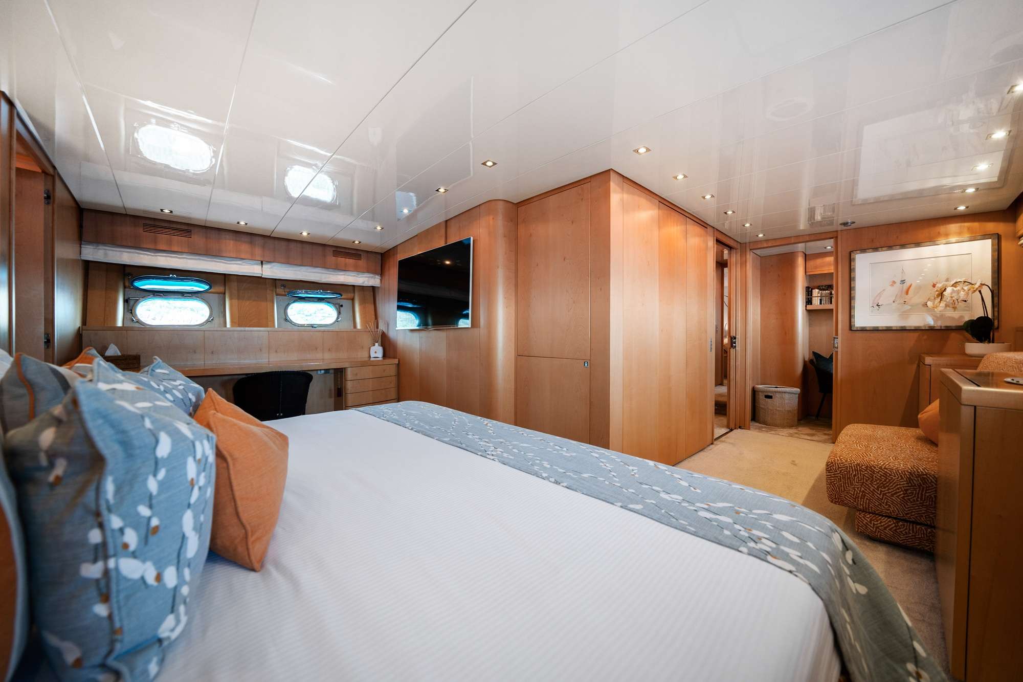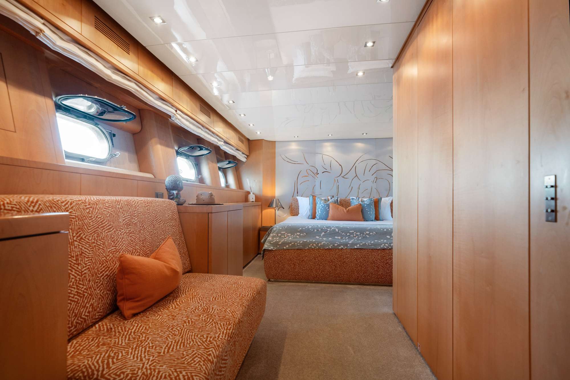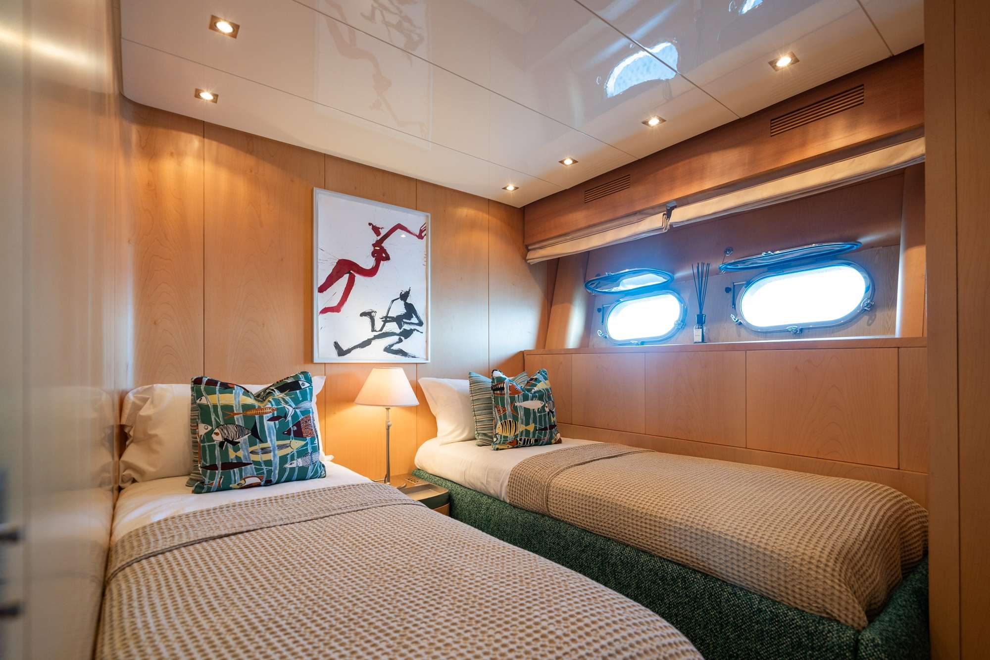 ►► MAIN DECK ■ Salon • 2 x 3-seat sofa • Table for up to 4 guests ■ Day head (between the salon and the bridge) • WC • Sink ►► LOWER DECK ■ Master suite • King size bed (2x2m), Tempur mattress (new 2025), safe • Ensuite bathroom ■ VIP stateroom • Double size bed (1,60m x 2m), Epeda mattress (new 2025), safe • Ensuite bathroom ■ Twin cabin • Two single beds, Epeda mattresses (new 2025) • Ensuite bathroom