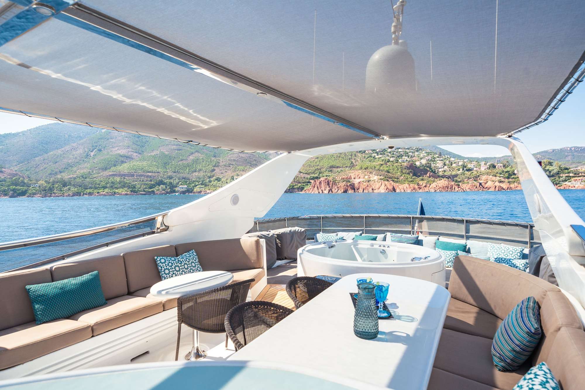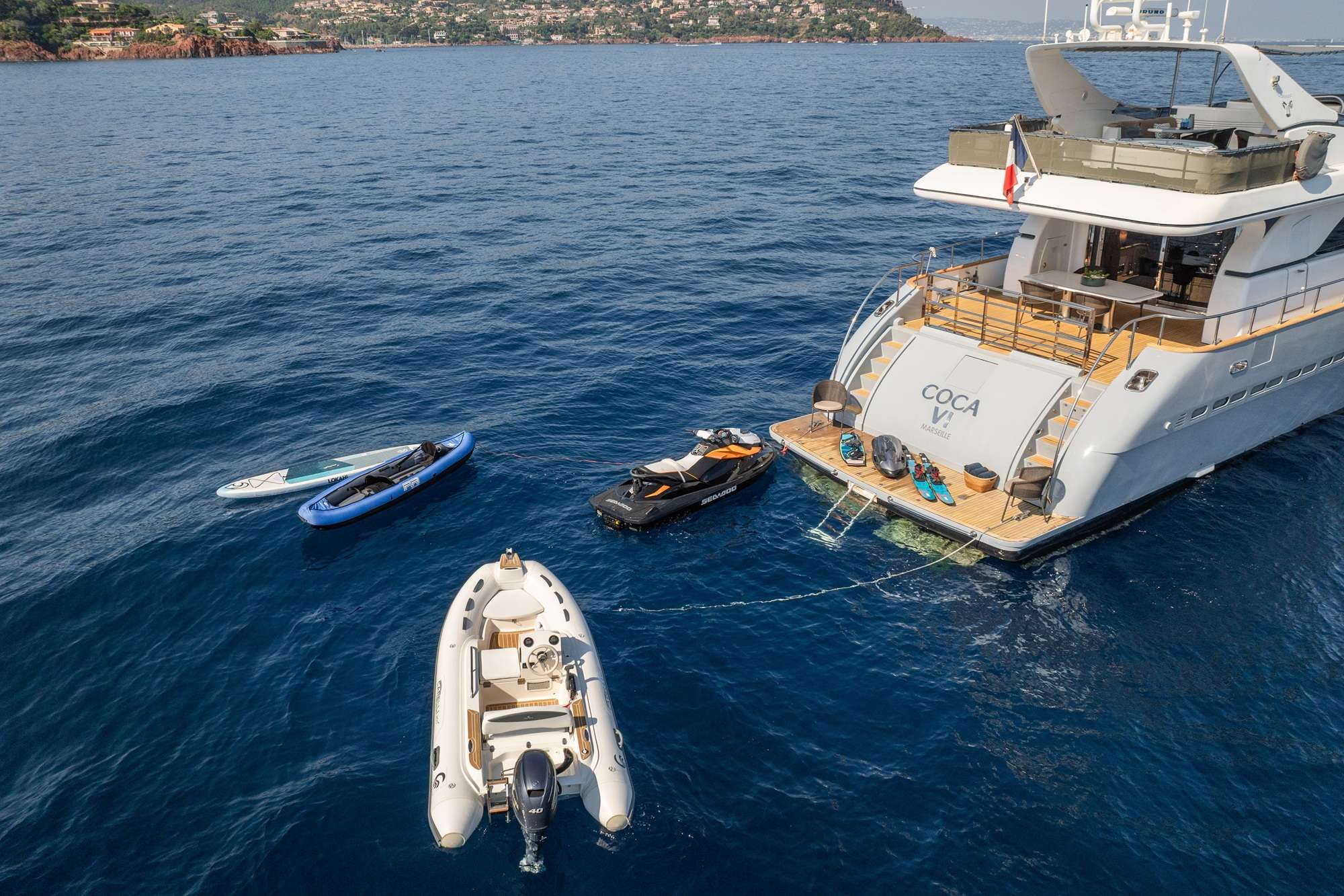 COCA VI is a 27m Leopard built by Arno in 2000 and has been meticulously maintained by her owner who sends her to the shipyard every winter for maintenance and refit work. There are many yachts available for charter in the South of France, but COCA VI dominates the market with her modern and fresh interior, her high-tech features and her excellent reputation in the charter industry. Her sexy shape along with her high cruising speed is the perfect pairing for those who want to enjoy the Côte d'Azur in style. Stepping onboard COCA VI, you will first discover her aft deck, with a new lacquered white table for 8 guests. This aft deck looks very glamorous and is always remarked upon by passers-by when the yacht is in the harbour. Upon entering the yacht, you will discover a vast saloon with 2 silver sofas, a dining area made with a transparent table and chairs and a surprising decoration. You will never believe that this yacht was built in 2000! COCA VI can accommodate up to 6 guests and offers 3 staterooms on the lower deck: a master with a king size bed, a VIP with a queen size bed and a twin with two single beds. Each stateroom has en-suite facilities. The sundeck is probably the part of the yacht that you will love the most; wet bar, hot plate, fridges, sound system, lounge areas, sun pads and spa pool: there is absolutely everything you need to enjoy the South of France as it should be! From breakfast to a late-night cocktail, the sundeck is the perfect picture for your next holiday. This dream holiday will also be possible thanks to the professional crew of COCA VI. You will have at your service a Captain, a Cook / Stewardess and a Deckhand, always ready to bring you to new places, to introduce you to the fine Mediterranean cuisine and to make sure that you don't forget to enjoy a turn on the wave runner and all the other water toys, from the snorkeling equipment to the water skis. Coca VI has a 3.2m Capelli tender and is well equipped with toys with a jet ski, canoe, water-skis and wakeboard as well as diving and snorkelling gear, and two bicycles for land excursions. In 2014, the Owner decided to change the colour of the hull of COCA VI to light grey to give her a more modern feel.