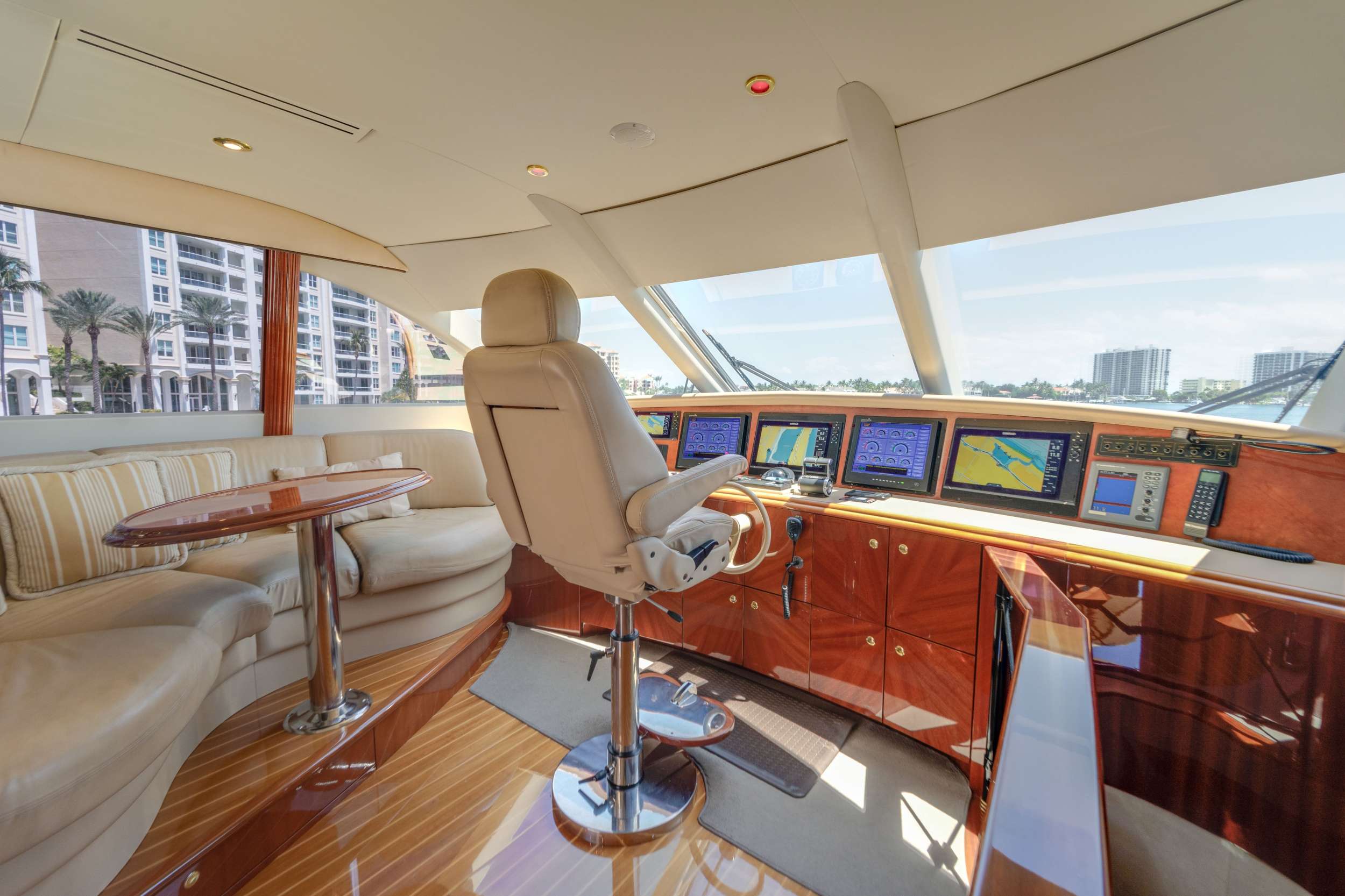 The overnight accommodation sleeps a total of 6 guests over 3 en-suite cabins: 1 Master suite, 2 double cabins. ~ The Master suite is situated amidships on the lower deck to make use of the full beam. Within, there is a king-sized bed with a widescreen TV opposite, a sofa against a one wall and a desk/vanity along the other, plenty of storage and an en-suite bathroom with two sinks, a toilet and a bathtub with showerhead. ~ The double cabins on the lower deck both have a queen-sized bed with a widescreen TV opposite, plenty of storage and an en-suite bathroom with a sink, toilet and shower. ~ The professional crew of 3 will ensure that every guest has fast and discreet service throughout their stay.