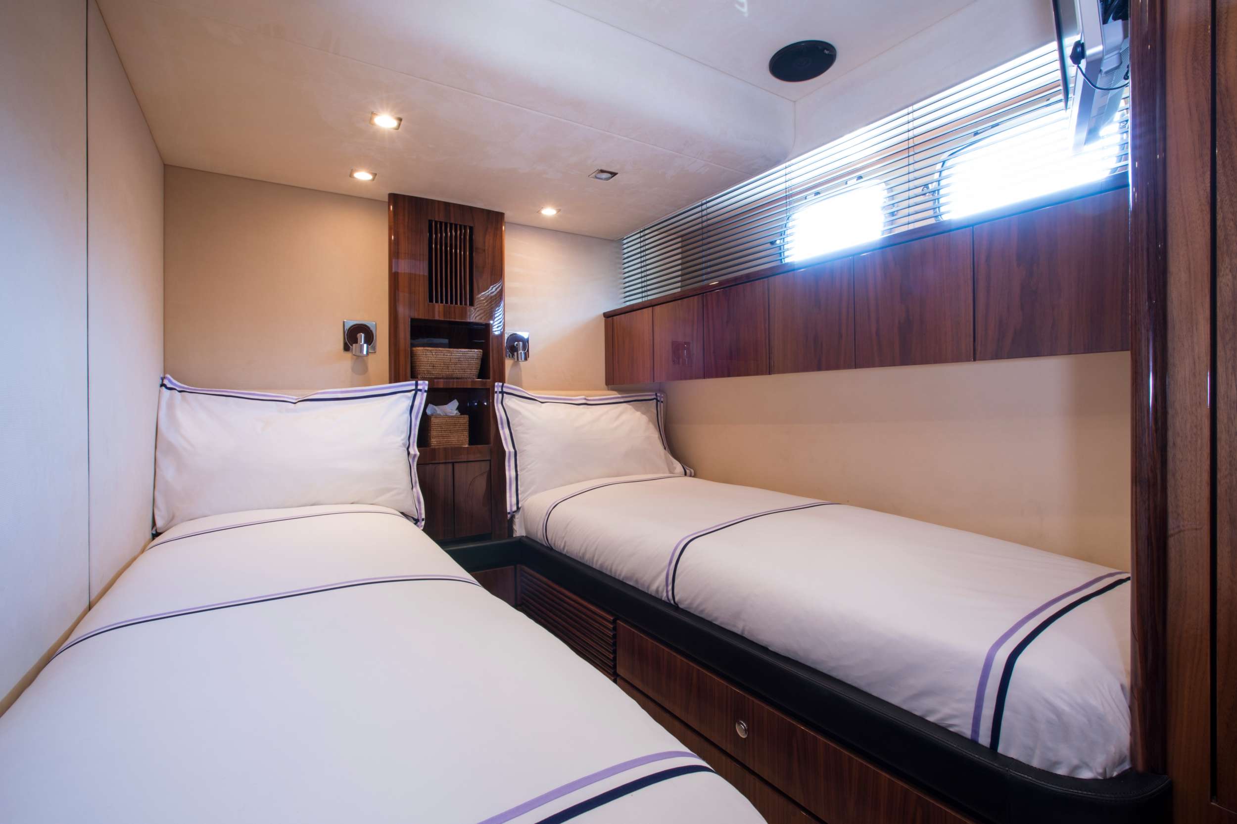 • MASTER STATEROOM - Lower deck King size bed Ensuite bathroom • VIP STATEROOM - Lower deck King size double bed Ensuite bathroom • 2 x TWIN GUEST CABINS - Lower deck Both with twin full length berths. Shared bathroom with sink, toilet and large walk in shower accessed directly from the port cabin or as a day head from the lobby.