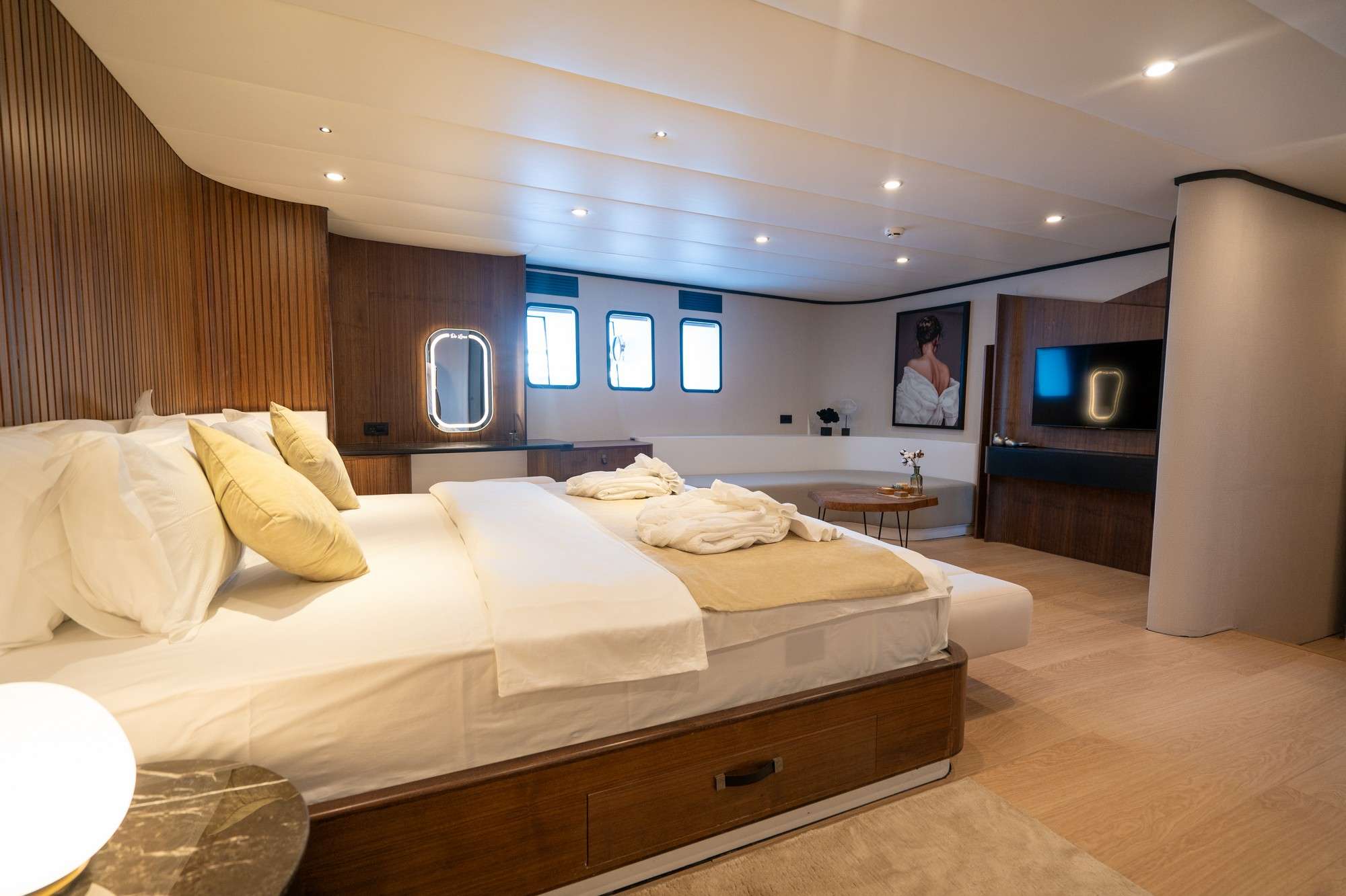 De Love is the sister ship of the 10 cabin King of the Sea, but offering larger accomodation. It is the new concept of the luxury yacht for big groups. The new design is closer to the motor yacht concept than the gulet one: big flybridge with jacuzzi, confortable sea platform at sea level, open space saloon/cokpit at the same level. - She'll be ready for charter from July 1st 2024.