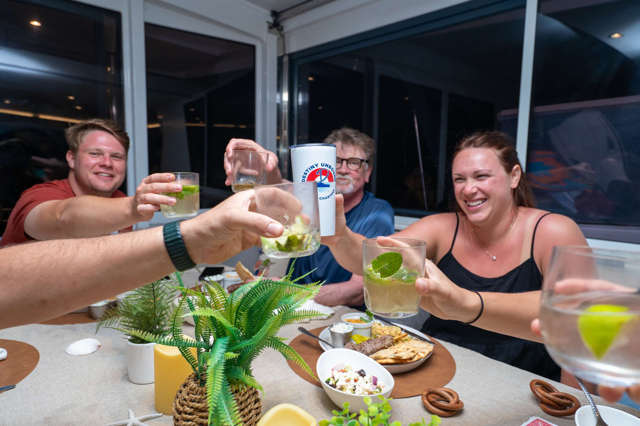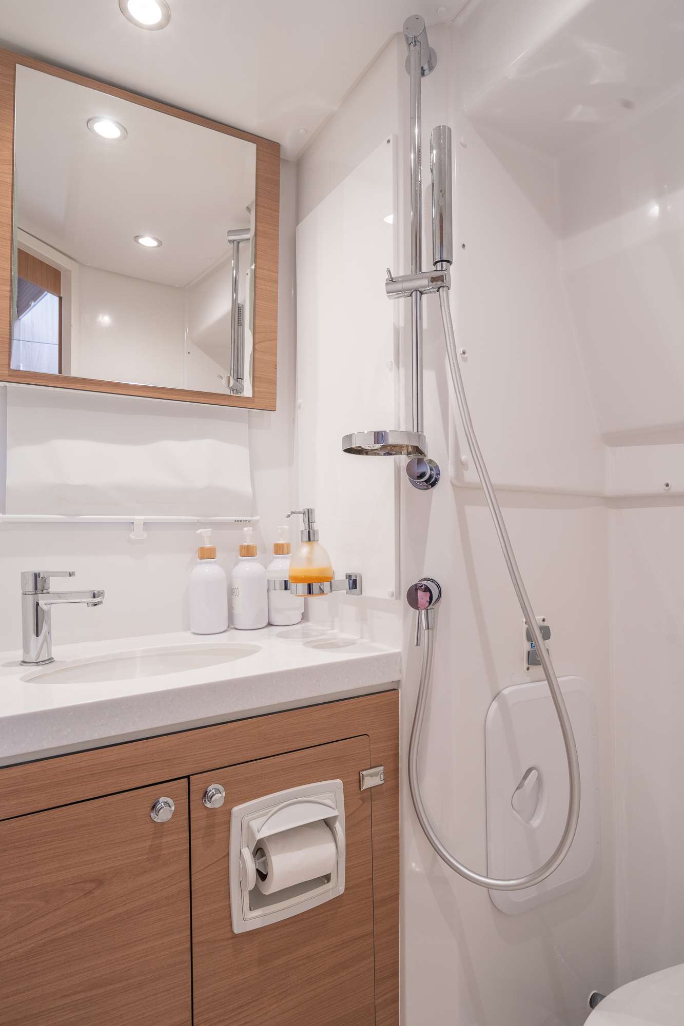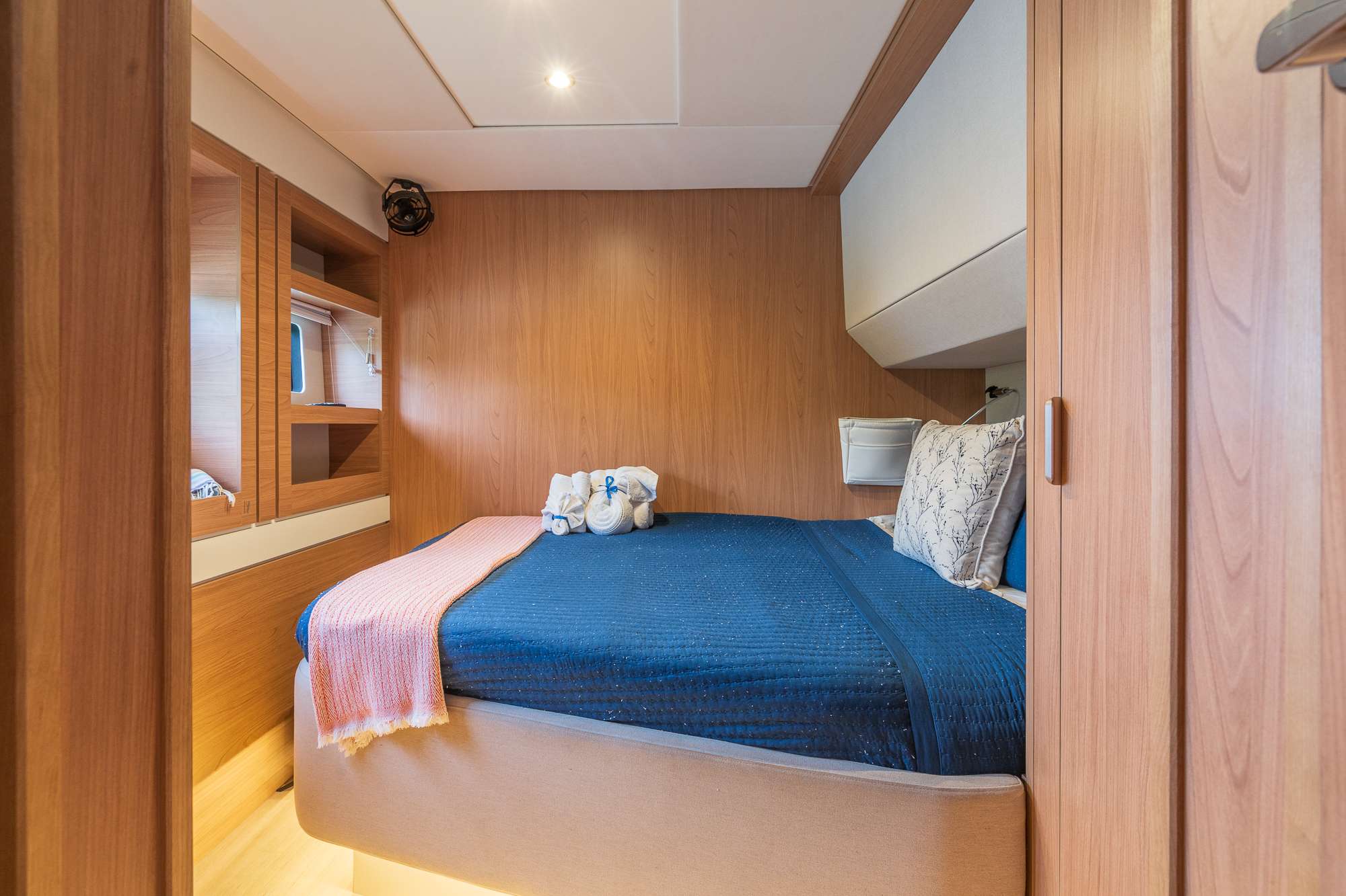 5 queen cabins for 10 guests. An additional queen is available but requires the crew to swap to the forepeaks.