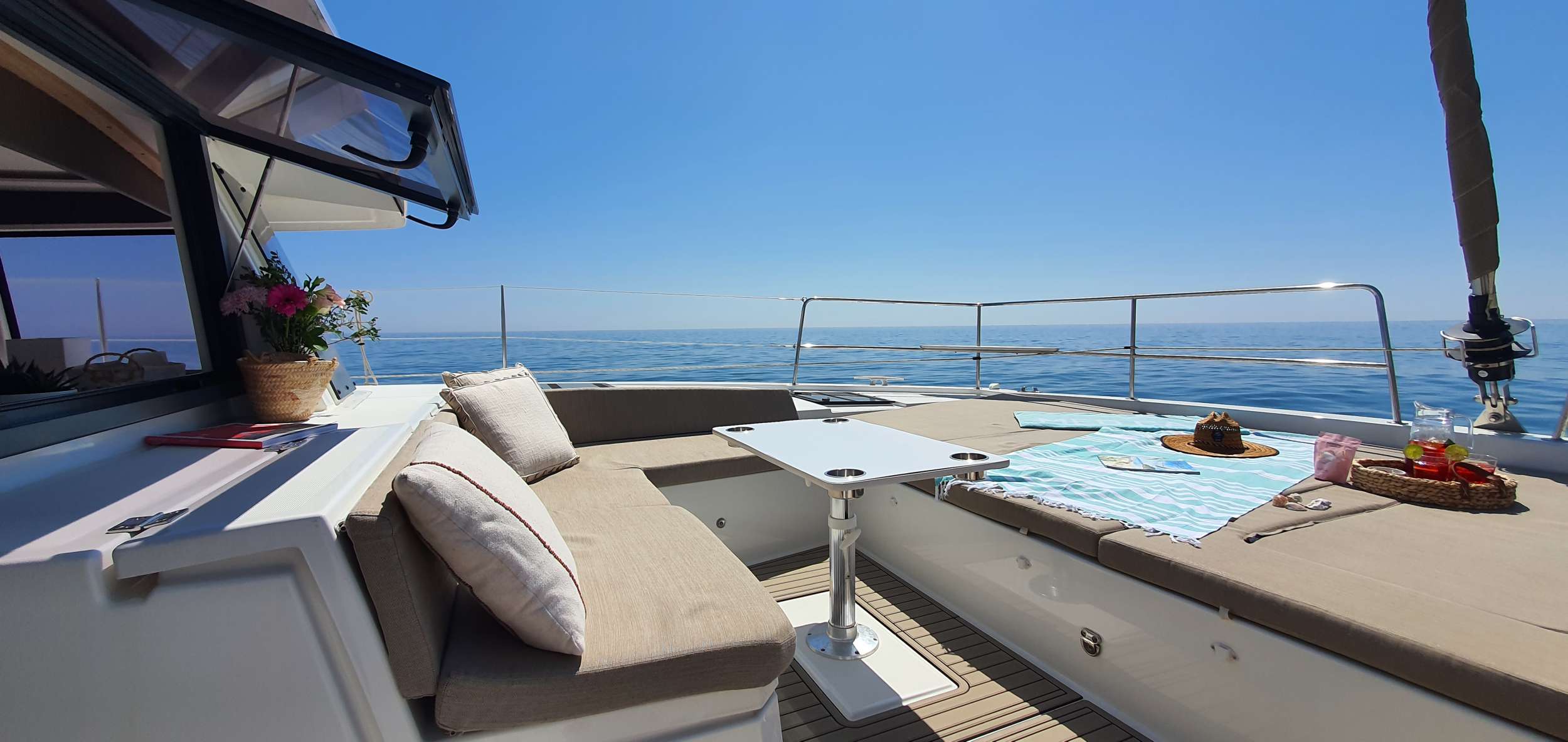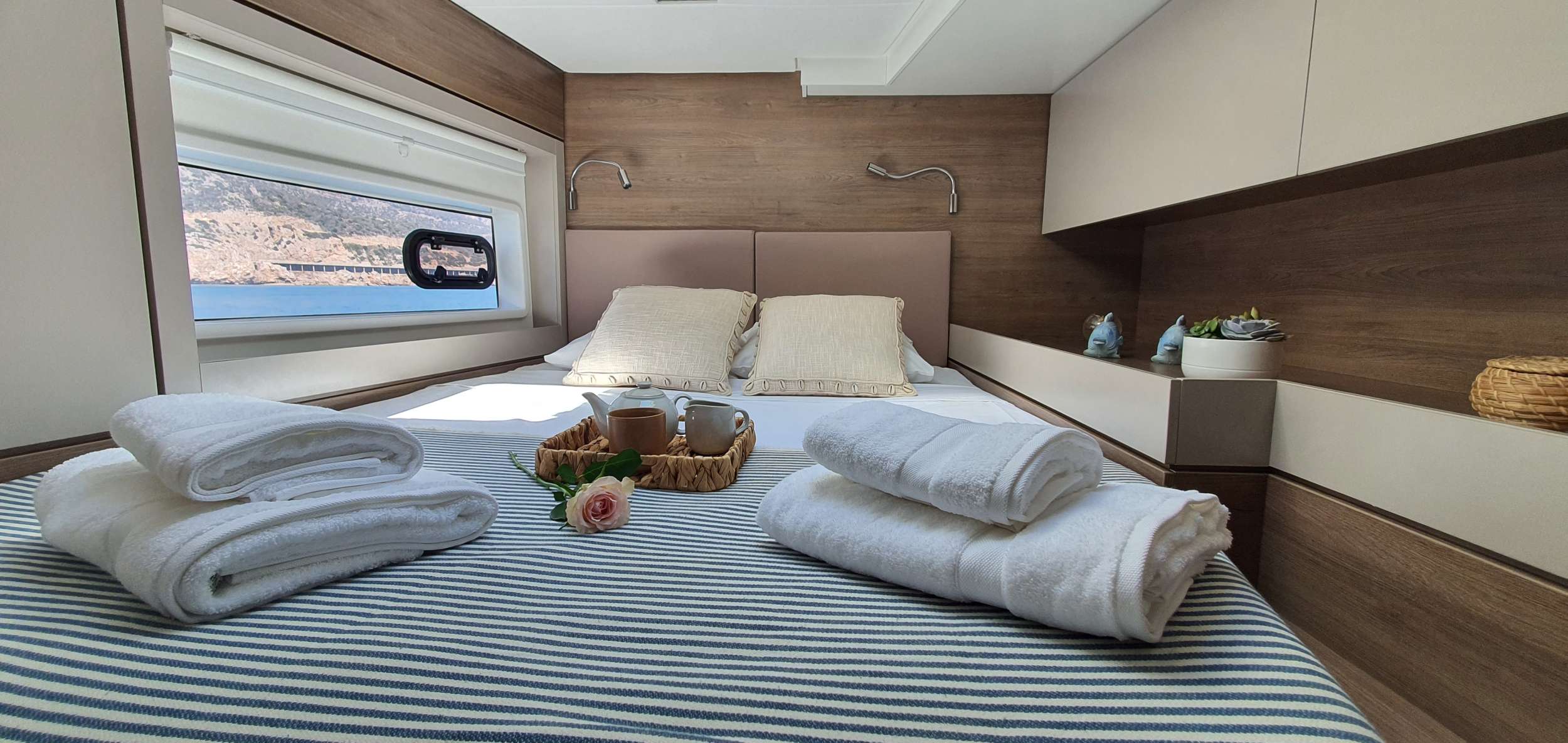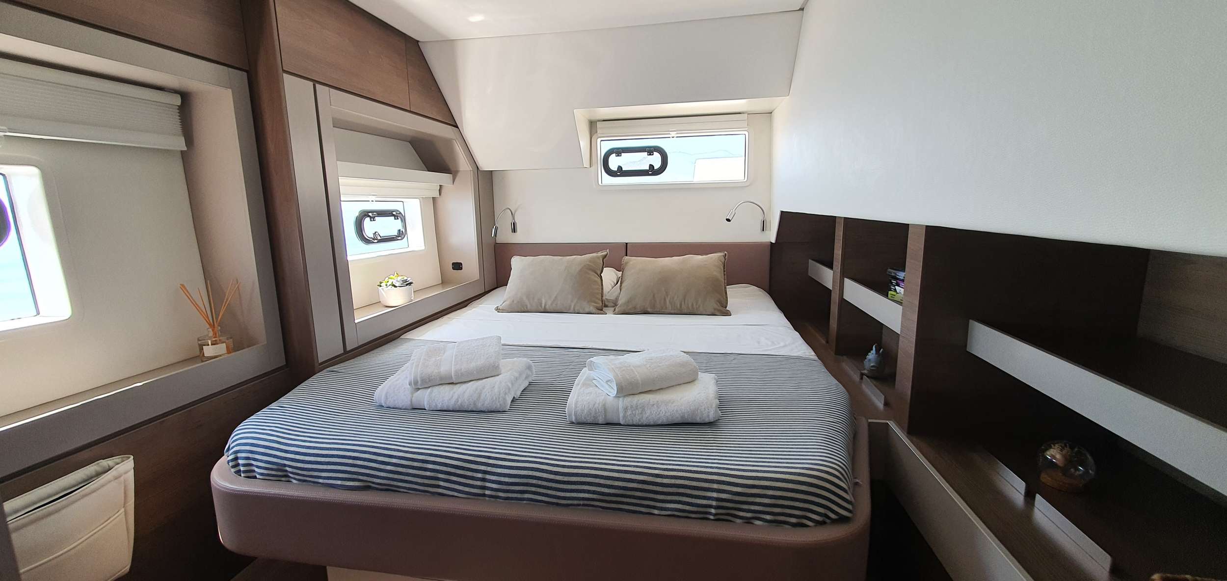 Guests: 4 Queen cabins + 1 bunk beds cabin + 4 WCs with showers (3 ensuite, 1 shared). Crew: 2 front peak cabins + WC to share with clients.