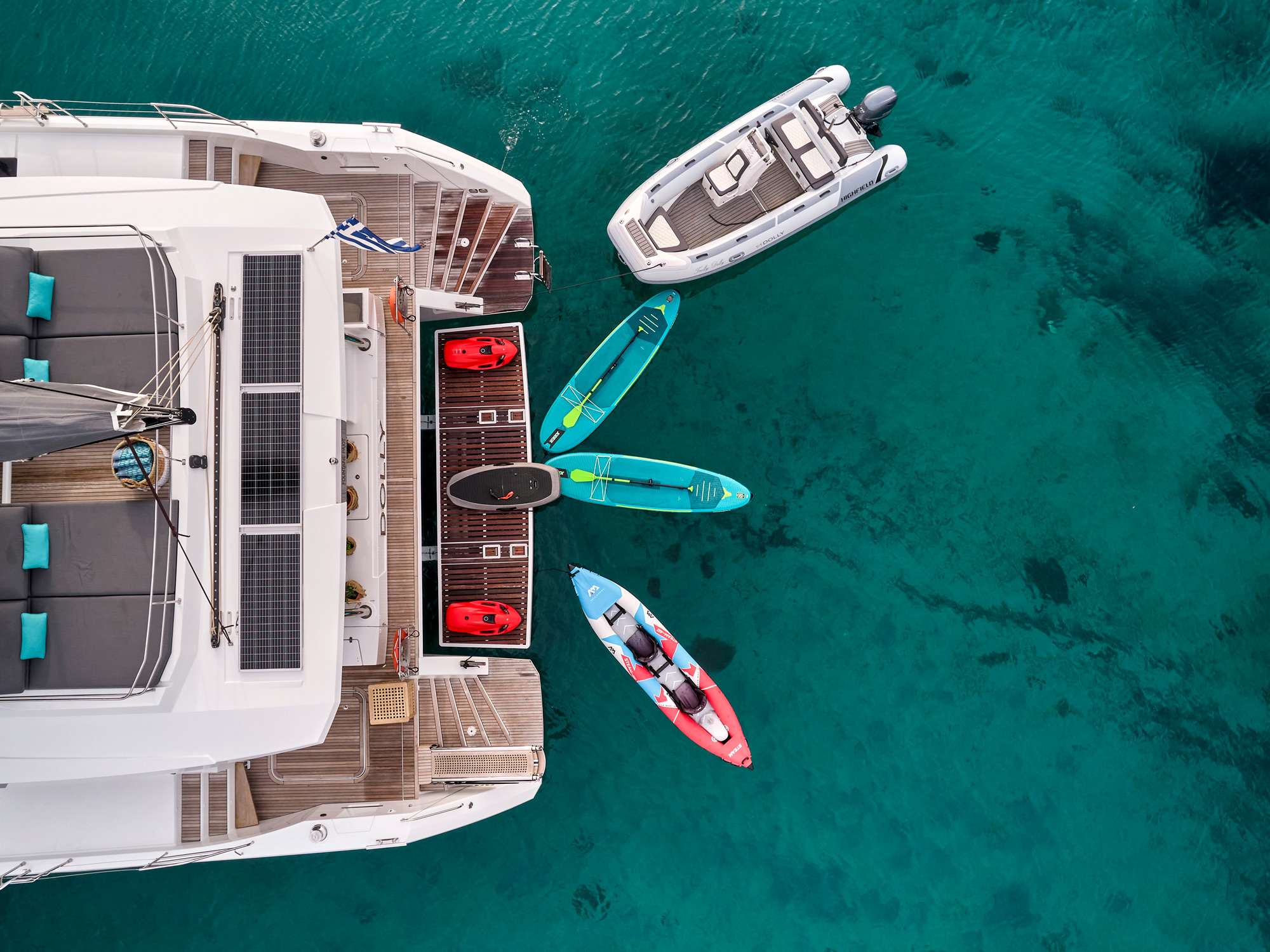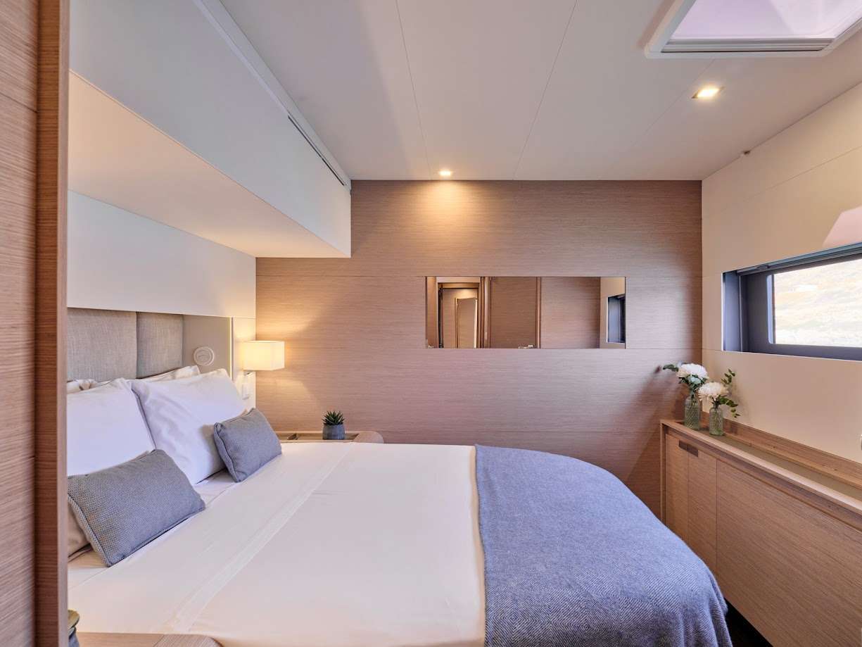 S/Y DOLLY is the ultimate example of luxury in a catamaran, with an expansive flybridge with an authentic ocean terrace and a forward cockpit with ample seating. Enjoy the thrill of sailing or simply unwind on the decadent lounges and sunbathing beds. Her interior is strikingly modern and incredibly spacious, providing the ultimate in comfort and luxury. She accommodates 10 guests in five cabins, including one owner's suite and four queen-sized cabins with private bathrooms and galley up. The flybridge and forward deck provide plenty of space for sunbathing and relaxing, while the aft cockpit is ideal for socializing and alfresco dining. Our crew, which includes a captain, deck/stew, and chef, is looking forward to spoiling guests on board and fulfilling every wish. S/Y DOLLY is dedicated to providing a relaxing and luxurious environment for all of our distinguished guests.