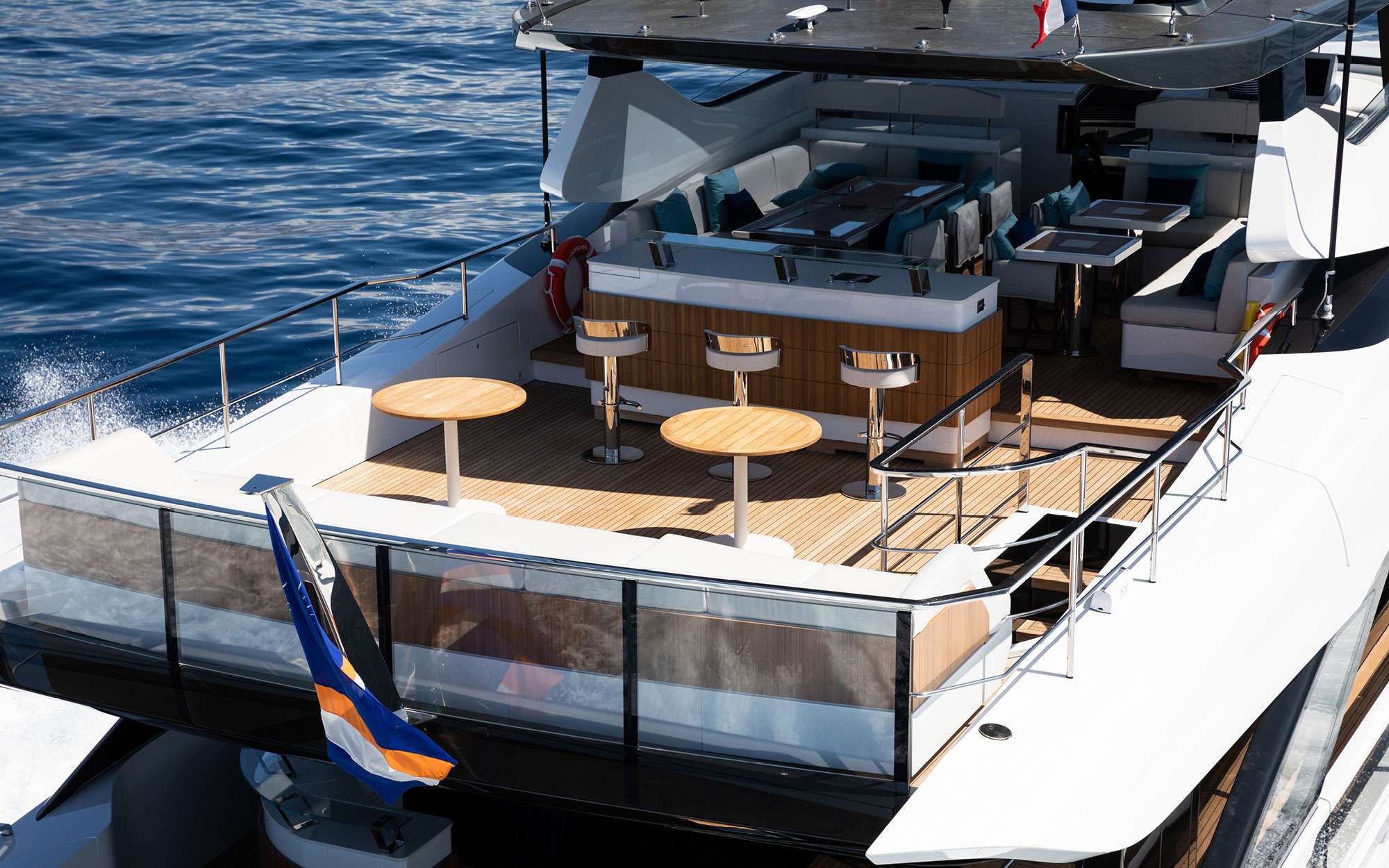 Guests have a choice of four out of five staterooms including Master (King), on deck and 4 below, all en suite. Floor to ceiling windows and doors surround the main deck salon allowing guests to feel as if they are outside while protected indoors when needed. The formal dining seats 8 guests while the aft and flybridge dining, in true al fresco style will seat more, especially lending shade cover overhead as well. In addition to the lounge area on the flybrdge aft combined with high top bar, guests have an equally as large al fresco dining, sunning and Jacuzzi area forward with shade option. On deck Master Stateroom forward with a large walk in shower with steam feature. Long concealed hanging closets for guests. Below deck are 4 guests staterooms, 3 of which guests may choose. There are two Queen and two Twin. Each Twin stateroom converts if desired to Queen/ custom double beds for 5 couples. All are en suite with showers. Sealux easy touch controls for all lighting in each cabin. Easy access to the water and toys from the swim platform with beautiful step entrance escalading down.