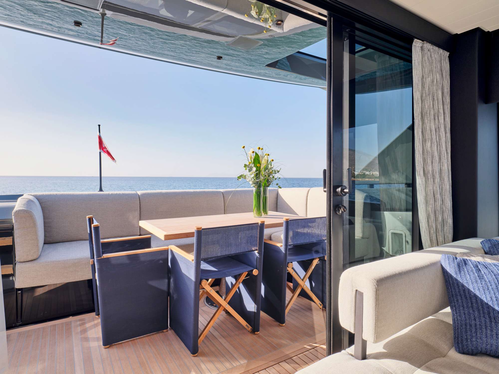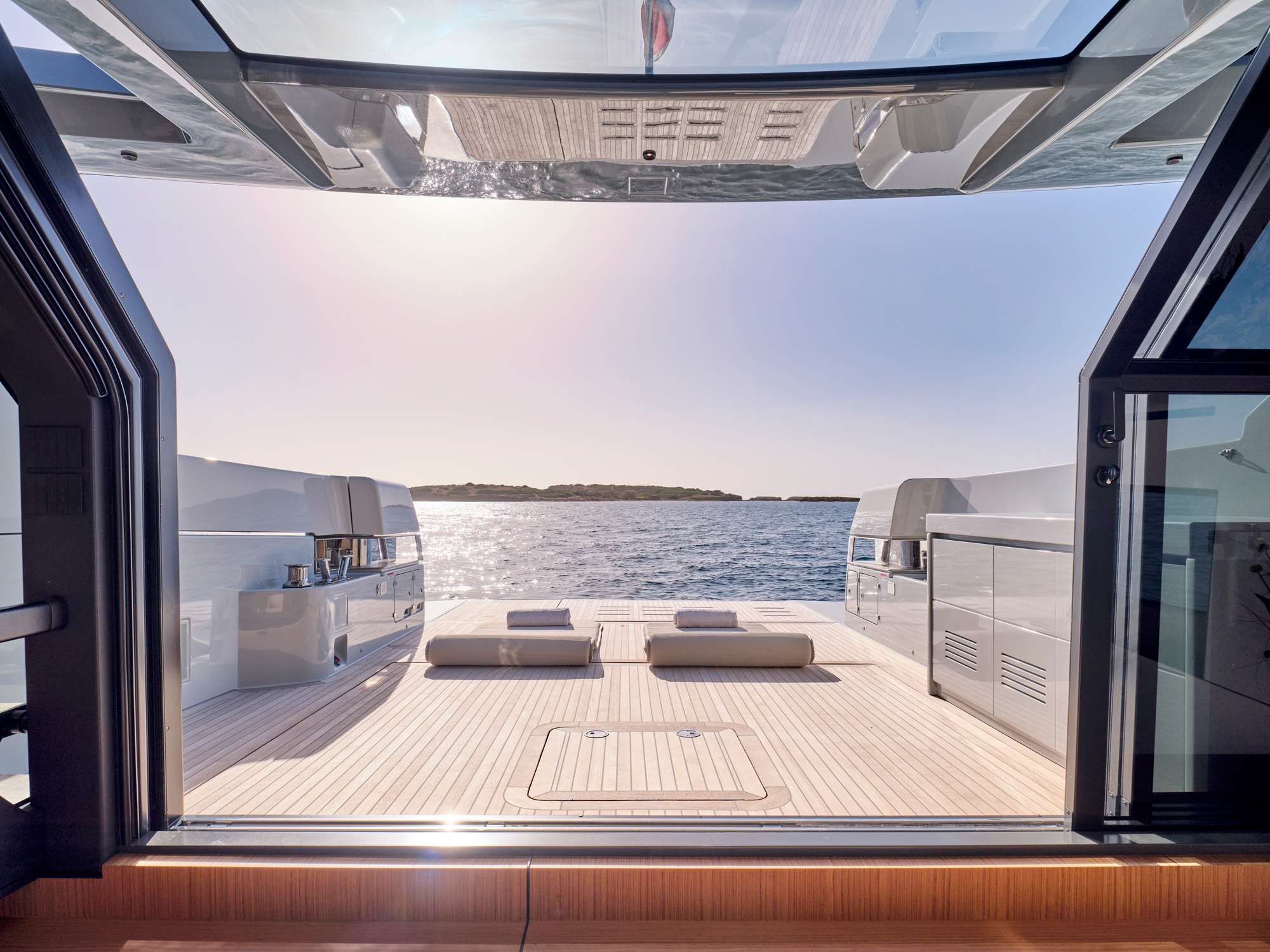 Conceived for those who pursue a profound closeness with the sea, this surprising power Bluegame BGX63 will make you experience the infinite blue even when inside your yacht. Two salons for maximum privacy, one on platform level and second on the main deck. Four exterior areas including a huge beach platform, a more private bow area along with a main deck dining area and sundeck matress area.