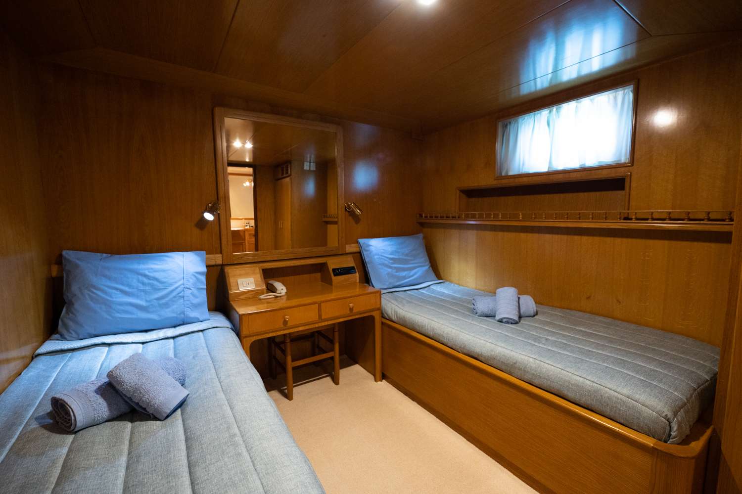 M/Y Elena was launched in 1992 and was one of the first yachts to enter the Greek charter market. She was built in Perama Shipyard in Greece. She has a steel hull which offers steady cruising and her entire interior is constructed from oak and mahogany wood. M/Y Elena is a classic displacement yacht featuring ample deck space and a lavish interior. In 2008 her stern was extended and a new swim platform was added for easy access to the sea. In 2016 she was refitted with new upholstery in the saloon, VIP cabin and Master Cabin and had a second sun deck installed. MY Elena can accommodate 12-13 guests in 6 cabins. Her main deck features the saloon and dining area, the galley and the VIP cabin. Her mid lower deck features the Master cabin which also has a sofa and her two twin cabins. Two more twin cabins are located in the stern lower deck. All cabins have ensuite facilities and are fully air-conditioned. The crew quarters are located on the lower deck and have a completely separate entrance. M/Y Elena has a warm feel to her and all her guests feel at home when on board. She has a 4.60mt tender with a 70hp outboard engine, water skis, tubes, rings, snorkeling and fishing equipment are also available on board. Her lovely crew of 5 are always ready to cater to guests needs. M/Y Elena has undergone a refit in 2023 as follows - REFIT 2023: -New carpets in salon and all cabins -New bed spreads for all the beds -New upholstery on sofas in salon -New sofa in the master cabin -New exterior sofa on upper deck exterior saloon -New teak deck chairs for exterior table on the lower deck -New sundbeds for upper deck -Newly restored tender with 70hp outboard -New blutooth and usb music stations installed in 5 cabins