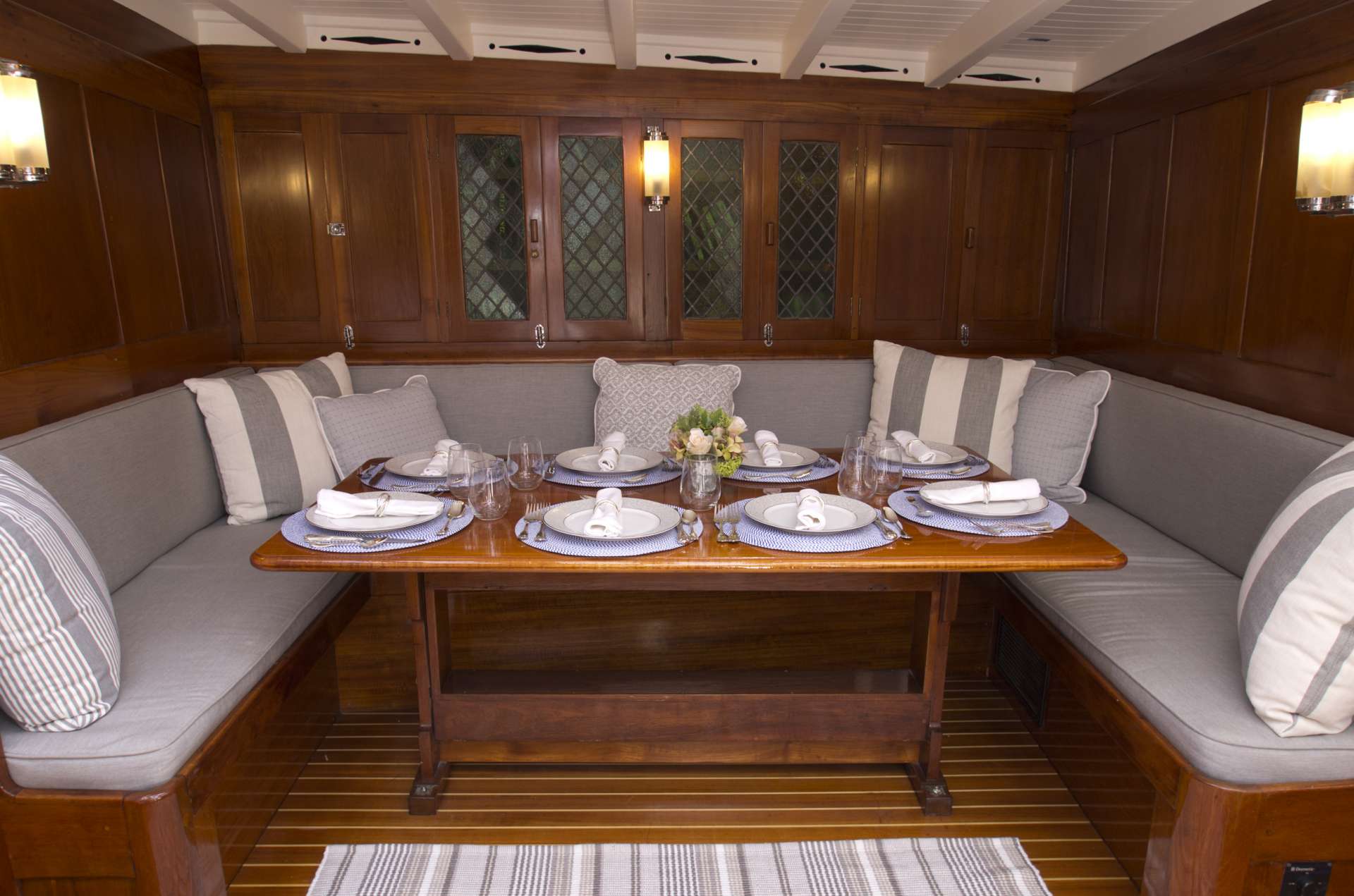 EROS comfortably accommodates ten to twelve guests. -Master cabin features a queen size bed with en suite facilities including a jacuzzi tub and shower. -VIP cabin features a double size bed with en suite facilities (head and shower). -Two twin cabins with upper and lower single beds (facilities for twin cabins are shared) -The updated saloon features a new couch that can accommodate two guests. -The deck house features two long couches for lounging, happy hour, etc., and are also very comfortable beds. All cabins have individual air conditioning, and functioning hatches for natural ventilation. All heads are electric. The crew quarters are separate, forward of the galley, and have six bunks and two more heads and showers. The deck house features two long couches for lounging, happy hour, etc., and are also very comfortable beds. All cabins have individual air conditioning, and functioning hatches for natural ventilation. The crew quarters are separate, forward of the galley, and have six bunks and two more heads and showers.