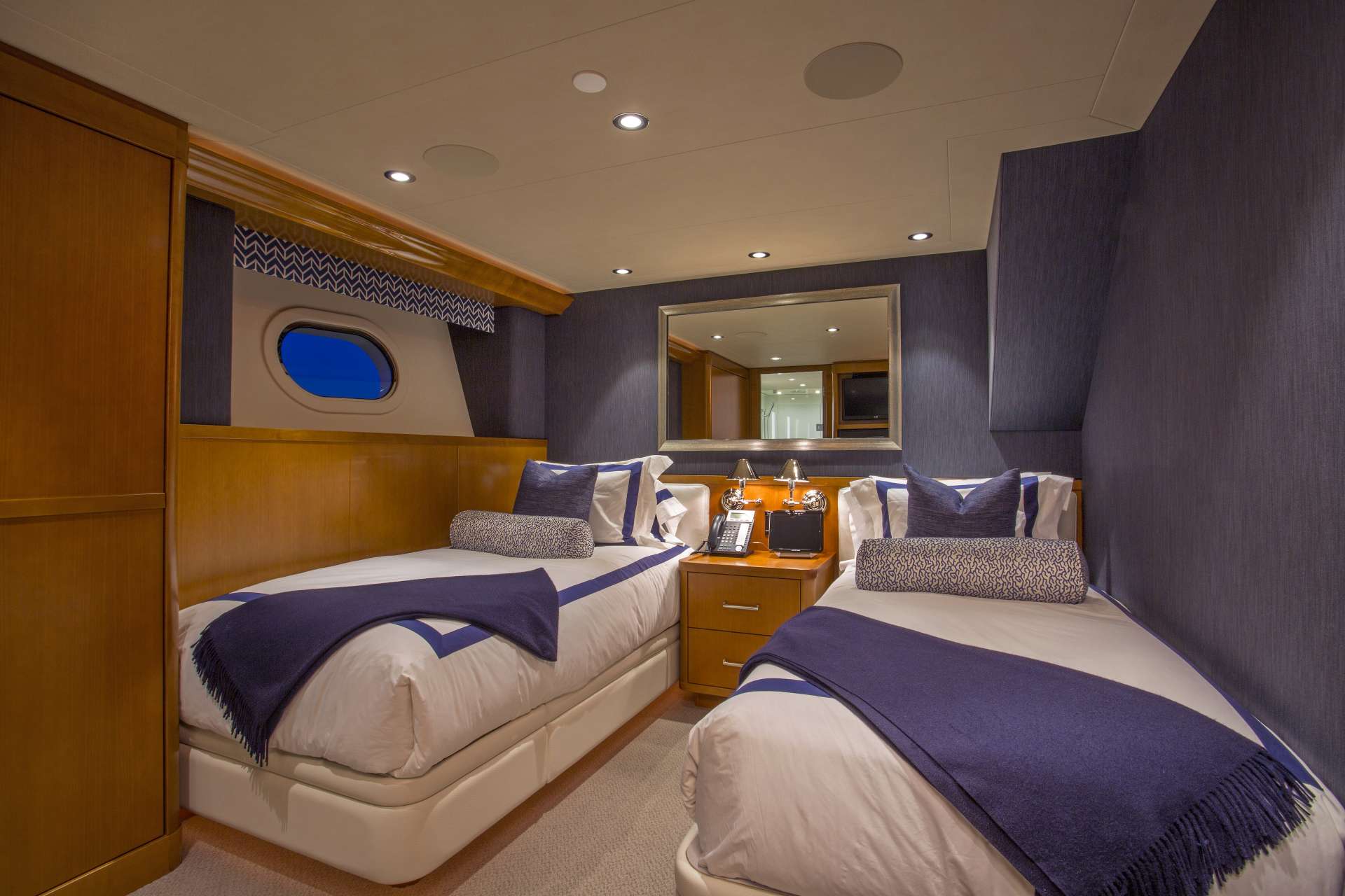 Master Stateroom: Main Deck, forward: Centerline king bed facing aft with two nightstands, dresser, vanity with mirror, safe, and his-and her-walk-in closets. The ensuite features a private head and bidet locker, a spacious shower, and twin sinks. Entertainment center with 42" Blu-ray TV, DVD/CD, iPod dock, and surround sound. There is a study adjacent to the Master Stateroom. VIP Stateroom (1): Midships, lower deck to port: Centerline king bed with two night stands, dresser, safe, and closet. The en-suite features a head and bidet, twin sinks and a shower. The entertainment center has a 32" Blu-ray TV, DVD/CD, iPod dock, and surround sound. VIP Stateroom (2): Midships, lower deck to starboard: Centerline king bed with two night stands, dresser, safe, and closet. The en-suite features a head and bidet, twin sinks and a shower. The entertainment center has a 32" Blu-ray TV, DVD/CD, iPod dock, and surround sound. Twin Guest Stateroom (1): Midships, lower deck to port: Two single beds with night stand, dresser, and closet. The ensuite features a head, sink and a shower. The entertainment center has a 26" Blu-ray TV, DVD/CD, iPod dock, and surround sound. Twin Guest Stateroom (2): Midships, lower deck to starboard: two single beds with night stand, dresser, and closet. The ensuite features a head, sink and a shower. The entertainment center has a 26" Blu-ray TV, DVD/CD, iPod dock, and surround sound. One of the twin guest staterooms can convert to a 4th King if so desired.