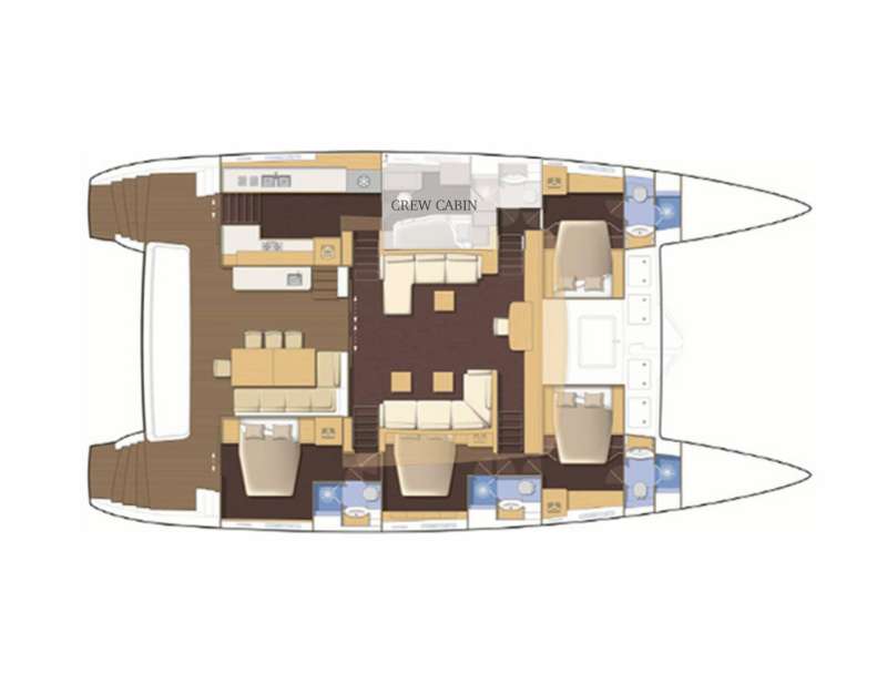 _____________ FOXY LADY accommodates 8 guests in 4 cabins, ALL en suite with stall showers and electric toilets. The Owner"s Cabin offers a walk around, queen sized bed, flat screen television and the private en suite. The 3 Guest Cabins all offer walk around, queen sized beds and private en suites. FOXY LADY is fully air conditioned through out and rotates between 2 generators to ensure a peaceful nights sleep. The Crew have separate accommodations and separate shower and restroom facilities. The fully equipped galley is located in the port aft hull away from guest accommodations. This allows for a spacious and modern interior lounge area with a large flat screen television and inside dining for 8 guests. The cockpit features a fully stocked bar area, al fresco dining for 8 guests and ample sunning areas and shaded lounge facilities. The modern Sky Lounge offers comfortable couches and sun beds forward of the dual helm station, including built in exterior speakers, wine fridge and optional shade cloth. The forward bow area offers additional sun beds, trampolines with large bean bags and seating on the point of each bow. _____________