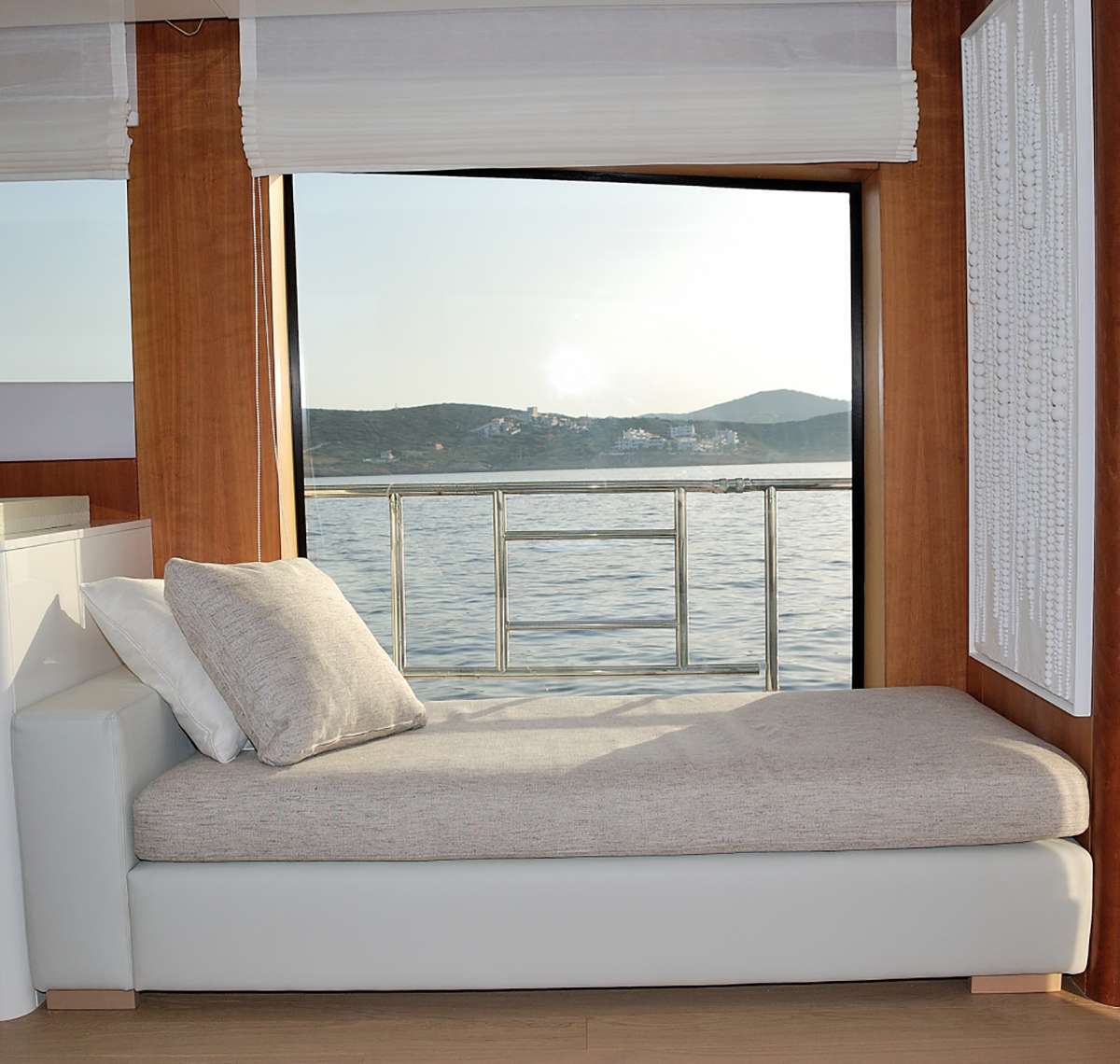 FUNSEA is offered either with a 4 cabins version or with a 5 cabins version*: In the 4 cabins version, the spacious full beam amidships Master cabin has 2 en suite bathrooms and a King bed. In the 5 cabins version, the Master cabin is divided to 2 Double cabins or to 2 Single cabins or to 1 Single + 1 Double cabin. Each cabin has an en suite bathroom and independent entrance. All other cabins remain the same in both versions: • One VIP cabin, with en suite bathroom • Two Twin cabins, which can be converted to Doubles with King beds. Each of the Twin cabins has one Pullman berth and an en suite bathroom. - Separate Crew quarters with Crew galley & independent entrance (bow) - Day head on main deck Bed Dimensions 4 cabins version: Master Cabin 180 X 200 cm VIP Cabin 180 X 200 cm Twin Cabin A': Bed A' : 78 X 194 cm / Bed B' : 75 X 194 cm Twin cabin when converted to double: 214 X 194 cm Twin Cabin B' Bed A': 81 X 194 cm / Bed B' : 72 X 194 cm Twin cabin when converted to double: 206 X 194 cm ——- 5 cabins version: Double Cabin Portside: 160 X 200 cm Double cabin starboard side: 158 x 200 cm VIP Cabin 180 X 200 cm Twin Cabin A': Bed A' : 78 X 194 cm / Bed B' : 75 X 194 cm Twin cabin when converted to double: 214 X 194 cm Twin Cabin B' Bed A': 81 X 194 cm / Bed B' : 72 X 1954 cm Twin cabin when converted to double: 206 X 194 cm * The number of cabins and guests has to be agreed BEFORE booking