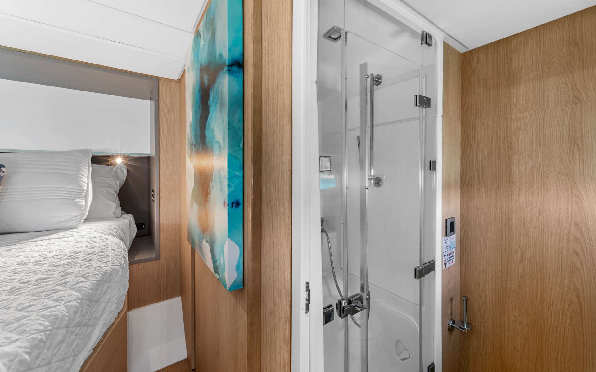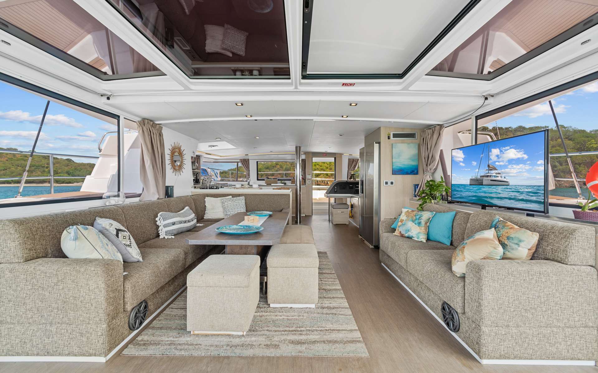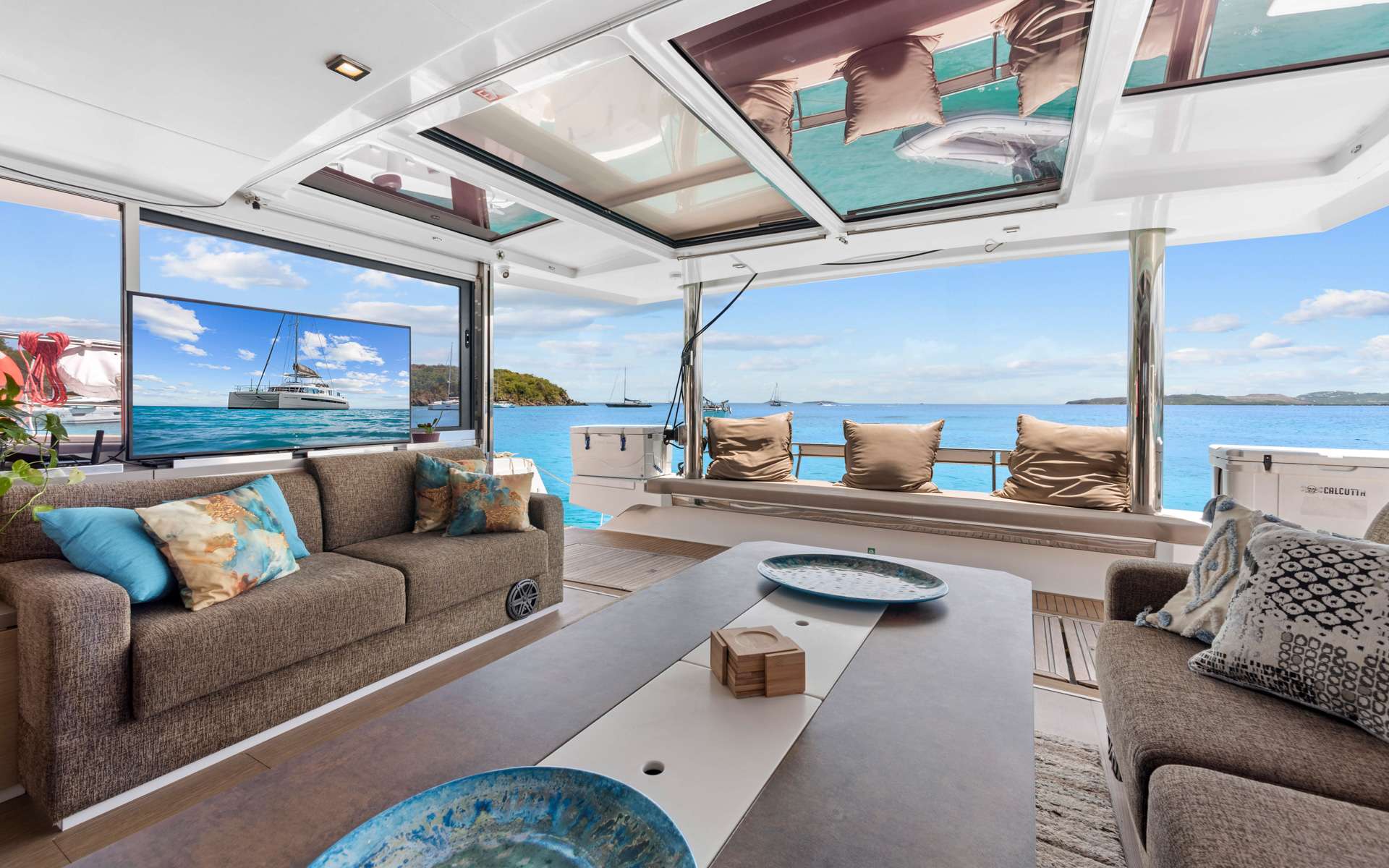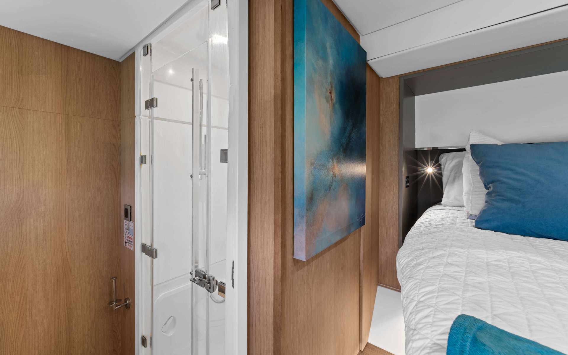 Step aboard GalaxSea, a stunning Bali 5.4 that redefines luxury with her bold design, open-concept living, and endless panoramic views. Built for the modern adventurer, GalaxSea blends high-performance sailing with the comforts of a floating five-star resort. Accommodating up to 8 guests, GalaxSea features a spacious owner's suite and three beautifully appointed queen staterooms—each with its own private ensuite—offering the perfect blend of privacy and indulgence for families, couples, or groups of friends. Her signature feature—a massive tilting aft door—transforms the saloon and aft deck into a single sweeping space, inviting the sea breeze and sunlight to flood in. Wide sliding windows, a forward cockpit with lounge area, and an expansive flybridge create a seamless indoor-outdoor lifestyle, perfect for soaking in 360° views from sunrise to starry night. The interior is a sophisticated blend of clean lines, warm finishes, and modern flair—elevated by original artwork curated throughout the yacht, adding a touch of personality and creative spirit to every space. Whether you're gathering in the spacious galley-saloon, dining alfresco under the stars, or lounging with cocktails on the flybridge, GalaxSea is designed for unforgettable moments shared in style. With its sleek profile and generous social spaces, GalaxSea offers a luxurious charter experience that feels effortless, immersive, and entirely your own.