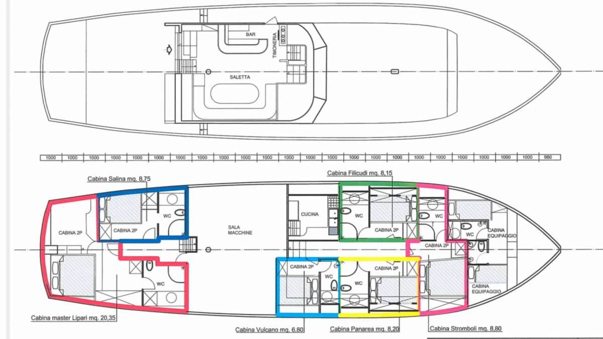 1 master + 5 Double 1 master cabin of 20 mq 2 double cabins of 8.80 mq 3 double cabin of 8.15 - 8.20 mq