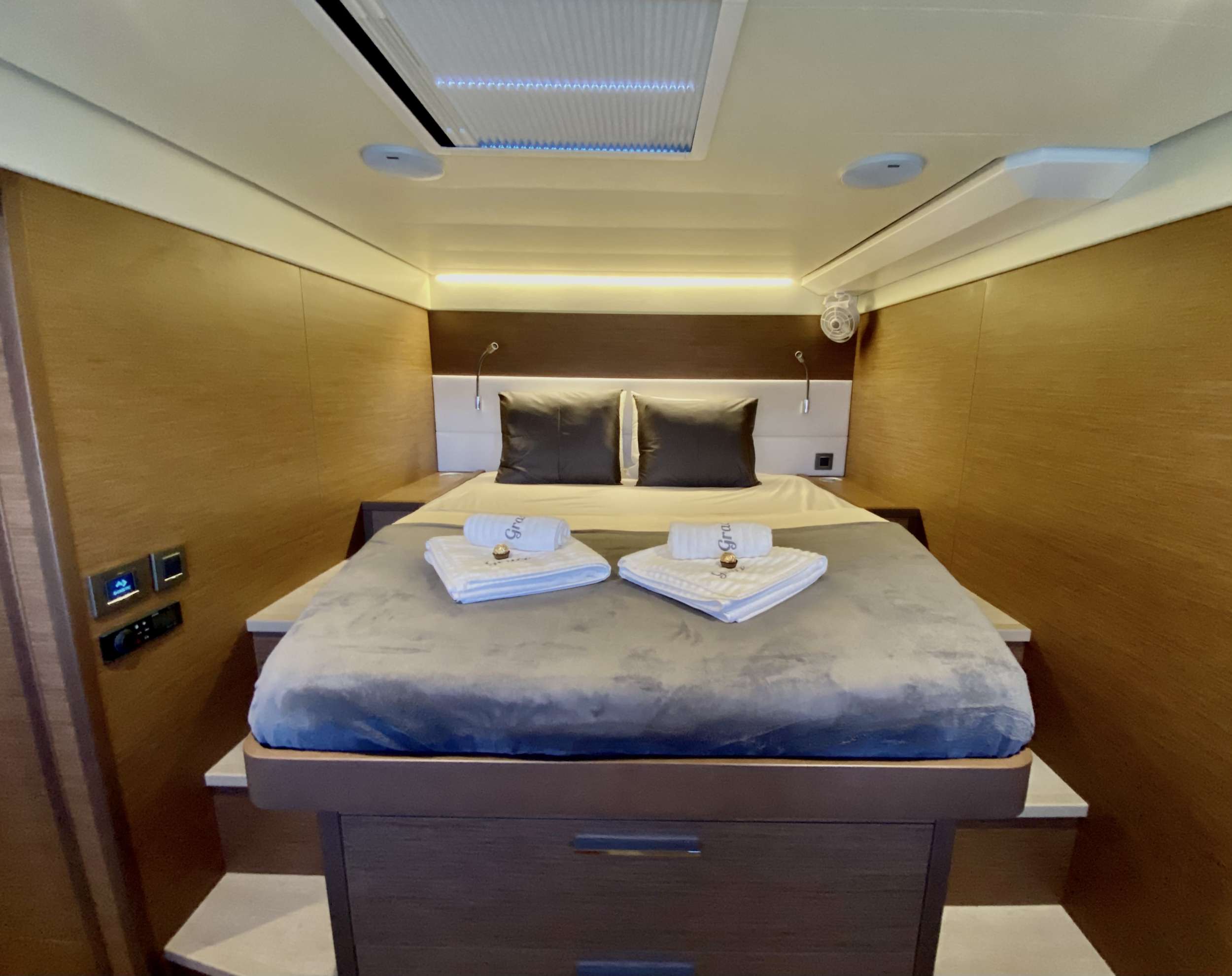 S/Y Grace is a Lagoon 620 Essence and she is based in Preveza Marina, right in the heart of the Ionian Sea. She accommodates 8 guests in 4 large en-suite cabins. One master cabin with direct access to aft deck, one VIP cabin with direct access to aft deck and two queen bed quest cabins all with private bathrooms. She has a spacious cockpit for dining al-fresco and fly bridge for 360 degree views and perfect area for cocktail hour. She is equipped with a hydraulic platform - ideal for direct access to the sea. Her saloon has wide panoramic windows - the galley is located in the upper level where the chef prepares wonderful dishes for her guests. Grace is equipped to the highest standards including all the luxuries: Air-con, water maker, generator, Inverter, Quiet Flush Toilets and a lot more. Grace's fantastic design allows for maximum comfort and space onboard. Crew accommodation is located in a separate area on the boat.