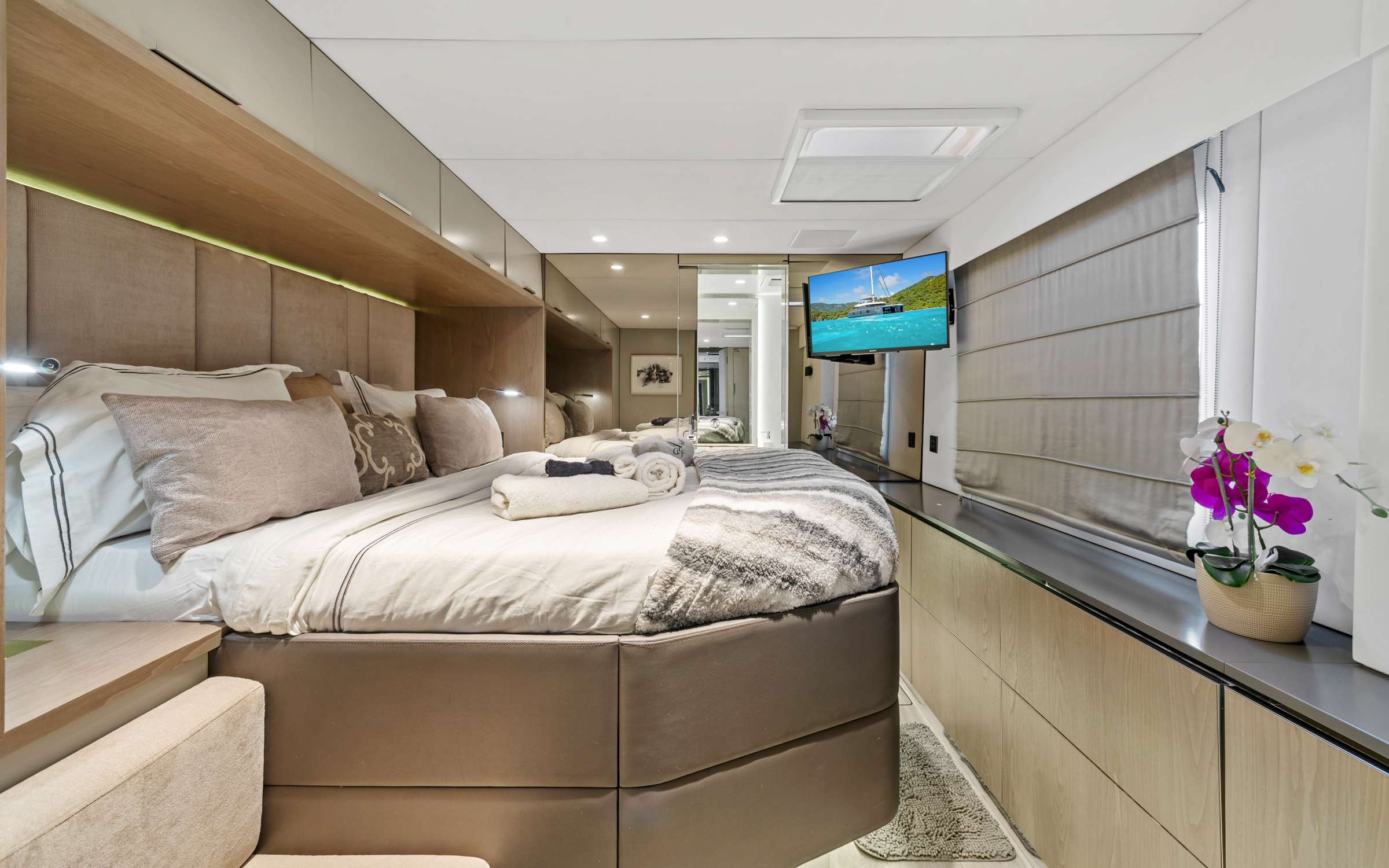 Five beautifully appointed en suite cabins feature plush queen beds and a serene white-and-grey color palette, creating a calm and restful atmosphere. Each cabin is equipped with USB charging ports, and thoughtfully provided yacht toiletries.