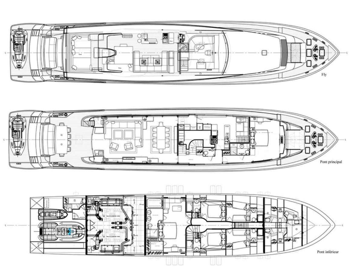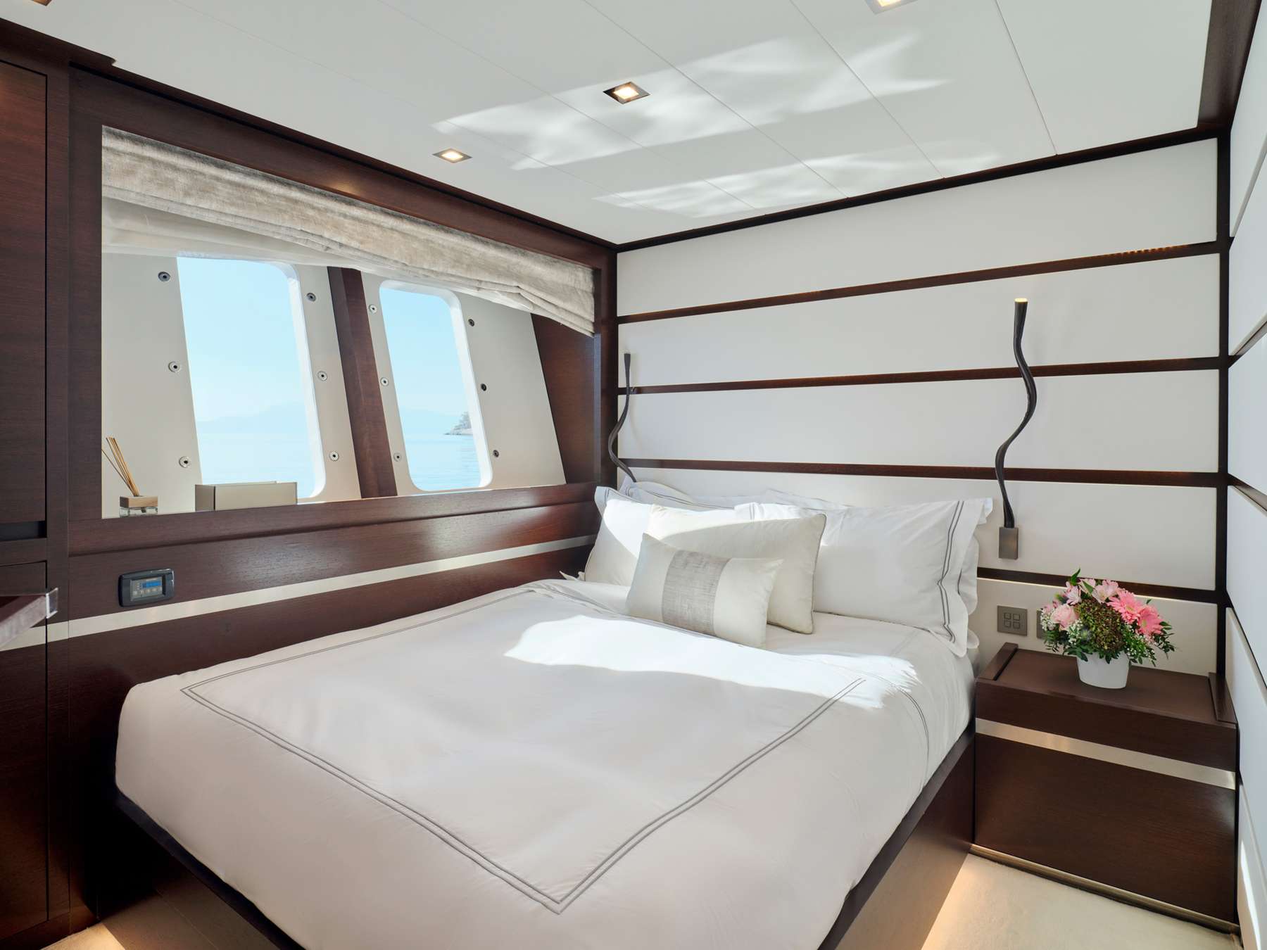 1 Master Suite on main deck 1 Master Suite on lower deck 2 VIP Suites on lower deck 2 Twin cabins with 1 pullman berth each on lower deck Master Cabins Bed Sizes: 2 x 2.20m Double Cabin Bed Sizes: 1.75 x 2m Single Bed Sizes: Twin 1.75 x 0.95m Pullman Berth sizes: 95 x 1.75m