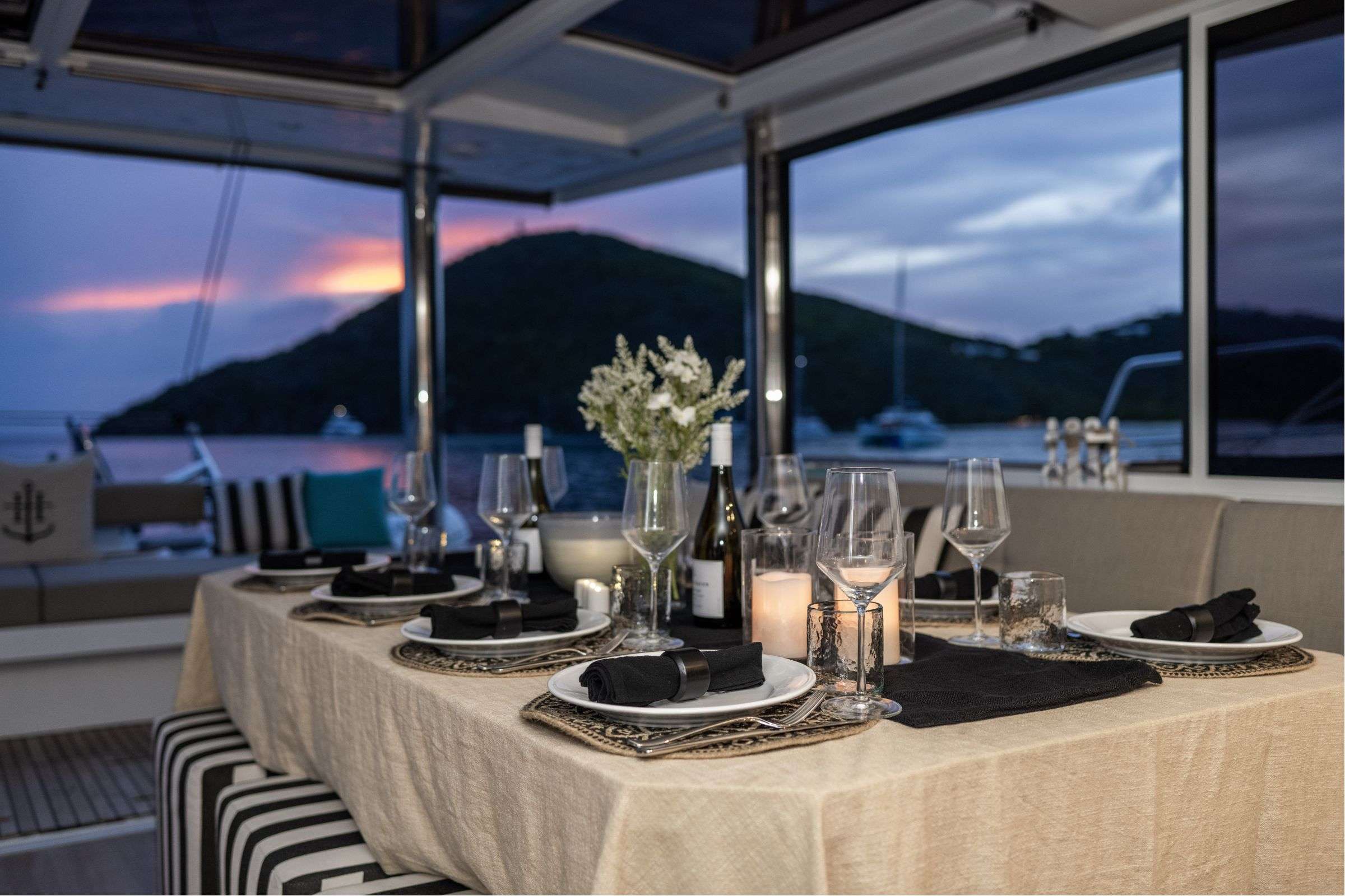 The Bali 5.4 is a “Multihull of the Year" award-winning catamaran. The design was new to the market in 2019 and provided a fresh approach to sailing. It is revolutionary in how space is accessed, with deliberate attention to flow and open space and it succeeds in producing a scale that feels less like a boat, and more like an upscale floating condominium. Bali catamarans are known and appreciated for their unparalleled success in blending luxury, space, and performance; producing a sailing experience that is unparalleled. This new design further capitalizes on that reputation with the advent of the “Bali garage door" that is the centerpiece of the yacht. It allows for the aft wall of the yacht to simply disappear, opening up the back of the yacht to an unobstructed view of paradise. This also affords indoor/outdoor dining options and gives the ever-present Caribbean breeze ample opportunity to make its way through the yacht with ease. With her solid foredeck gone are the forward trampolines, replaced by a large relaxing lounge area complete with cushions for sunbathing. A full-sized door provides access directly from the lounge area into the salon, allowing free movement through the yacht. A walk up to the flybridge unveils a seating area perfect for cocktails and taking in sunsets. There is also another area for sunbathing on the flybridge where you can take in the sights of the islands from the highest vantage point on the yacht. The Bali open space design is further complemented by the superior outfit and aftermarket items available on Hydrotherapy. No detail has been left unnoticed from the fine linens, pillows and throws to the wine glasses, serving and flatware that make every day feel luxurious. She has been stocked full with every appliance and kitchen accessory to allow the chef to fully showcase the mastery of their art. And the water toys abound, allowing guests to fully experience all the Caribbean has to offer, both in and out of the water. Hydrotherapy will accommodate 8 charter guests in 3 spacious queen cabins and 1 sprawling master cabin for those who desire more space. She is a brand new 2023 sailing catamaran with full teak spanning the entire the yacht, wine fridge, solar panels, air conditioning, water maker, ice maker, full sized refrigerator, a fully customizable menu, Caribbean made ecofriendly and reef safe toiletries, a bar stocked to guest preference, coffee/espresso machine, rendezvous scuba diving, snorkeling gear, underwater scooters, wake surfboard, 2 stand up paddle boards, 10 ft. floating dock, pool noodles, fishing gear, games, television in the salon, Fusion 3 Bluetooth enabled sound system and Hydrotherapy giveaways.