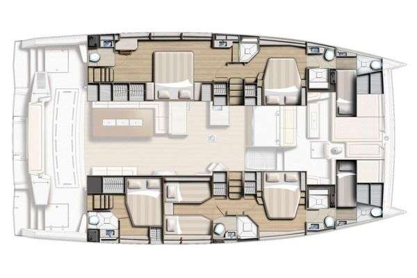 3 queen guest cabins and a twin bunk guest cabin, each with a private en-suite electric head, stall shower and sink/vanity. All cabins with exception of the starboard aft cabin are dry heads. All cabins have individual contract air-conditioning for each cabins comfort. Top desk fly-bridge with lounging and seating with a 360 degree view. Forward cockpit and lounge and dining area. Aft cockpit with seating and dining accommodations. Main deck has a bright and airy main salon (fully air-conditioned) as the galley direct access to the forward cockpit lounge area. **The forepeaks are available for a 9th and 10th guest, this arrangement is suitable for families with kids that are ok with sleeping in the forepeak cabins. Forepeaks have A/C and individual sink & head. ****Crew will be in the STBD Aft cabin.**** ***Please inquire if you would like the crew to move to the twin bunk cabin instead for a fee of $400*** BERTH SIZES: All queen berths are 5'w X 6'6"L