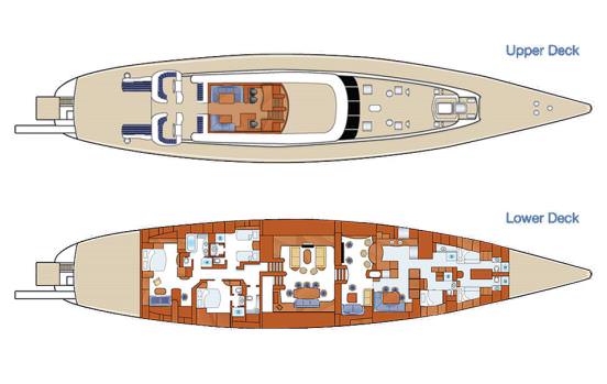 Full beamowner's cabin located aft with king-sized bed, study area and bathroom en-suite. Double cabin starboard side aft with queen size bed, shower room en-suite. Twin cabin on port side aft with two single beds and shower room en-suite.