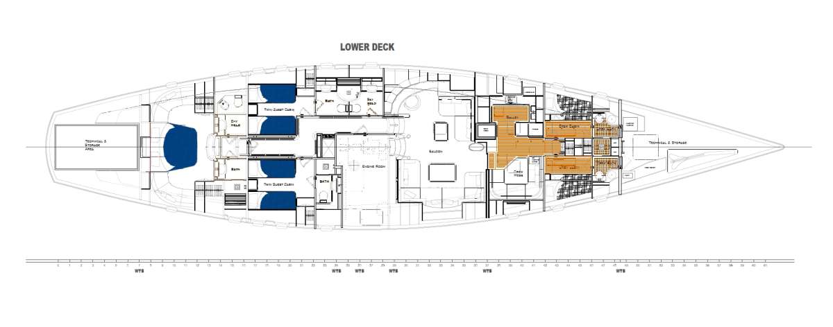 1 Master cabin and 2 twin cabins. Twins can be converted into queens.