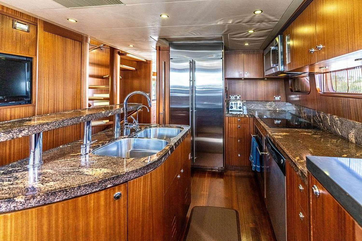 The vessel accommodates up to 4 guests across 2 private cabins, each with its own bathroom: a Master suite and a VIP stateroom. Located midship on the lower deck, the Master suite features a double bed facing a large TV screen. A desk/vanity area is positioned to the right, while a sofa sits to the left. Extensive wardrobe space flanks both sides of the bed. The en-suite bathroom, situated aft, includes a sink, toilet, and shower. The VIP stateroom also offers a double bed with an adjacent widescreen TV. It provides ample closet space and a private bathroom equipped with a sink, toilet, and shower. A professional crew of 3 ensures top-notch service throughout your journey.