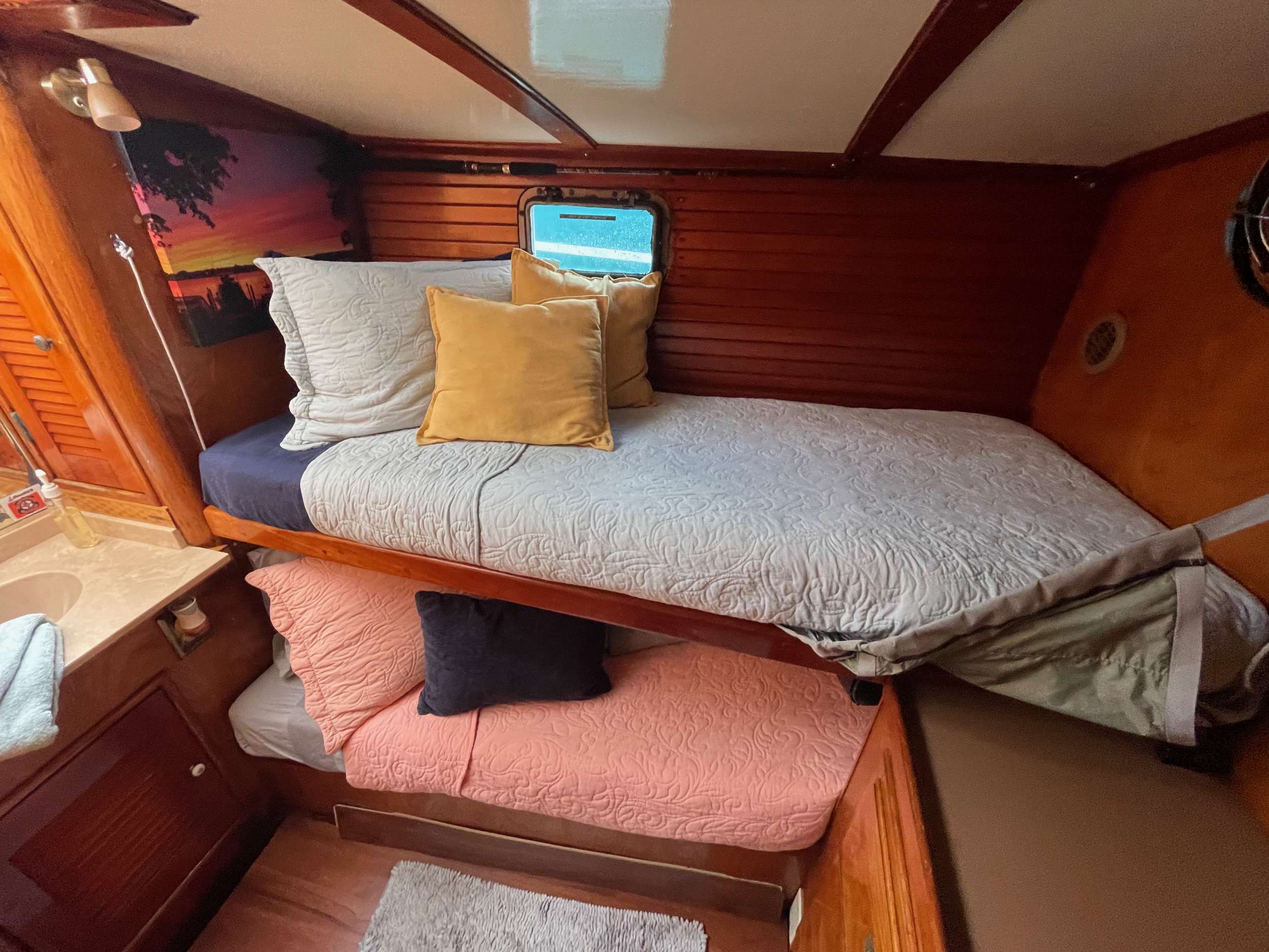 (2) Queen master cabins have a private ensuite head and stall shower. (1) Bunk Bed Room (1) Queen forward V-berth has ensuite vanity and shares head with twin bunk cabin below. (1) Twin cabin with upper lower berths. This cabin also has an ensuite vanity and shares head with Queen V-berth cabin above however it does have it's own vanity and sink in the cabin. Crew have separate aft crew cabin with head and storage area. Yacht is fully air conditioned upon request, added $10/hr A/C fee. Yacht has hydraulic swim platform which lowers from the deck into the water for easy access for guests.