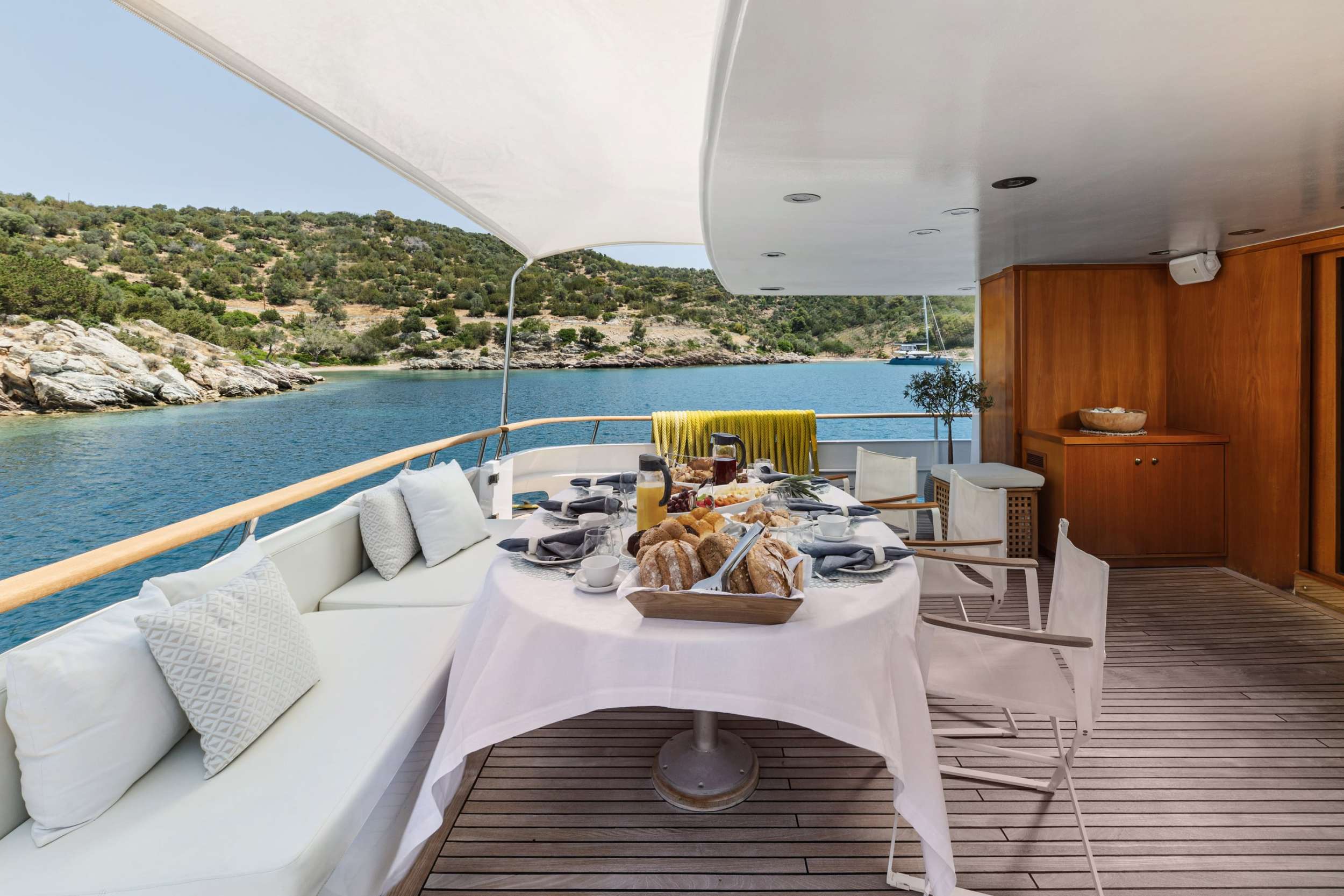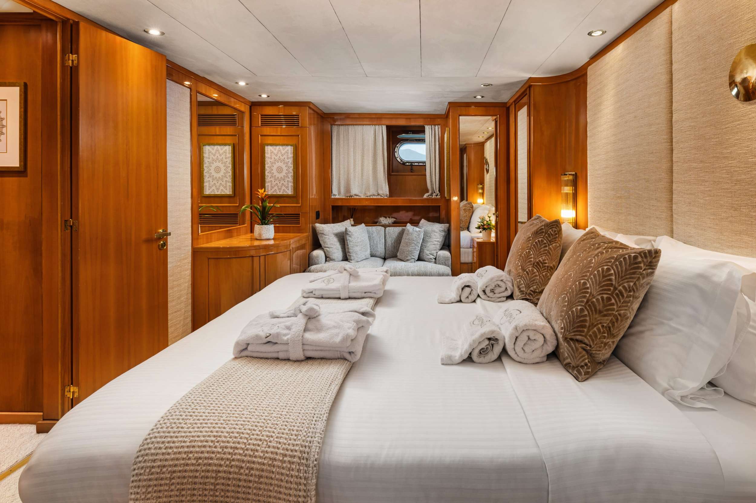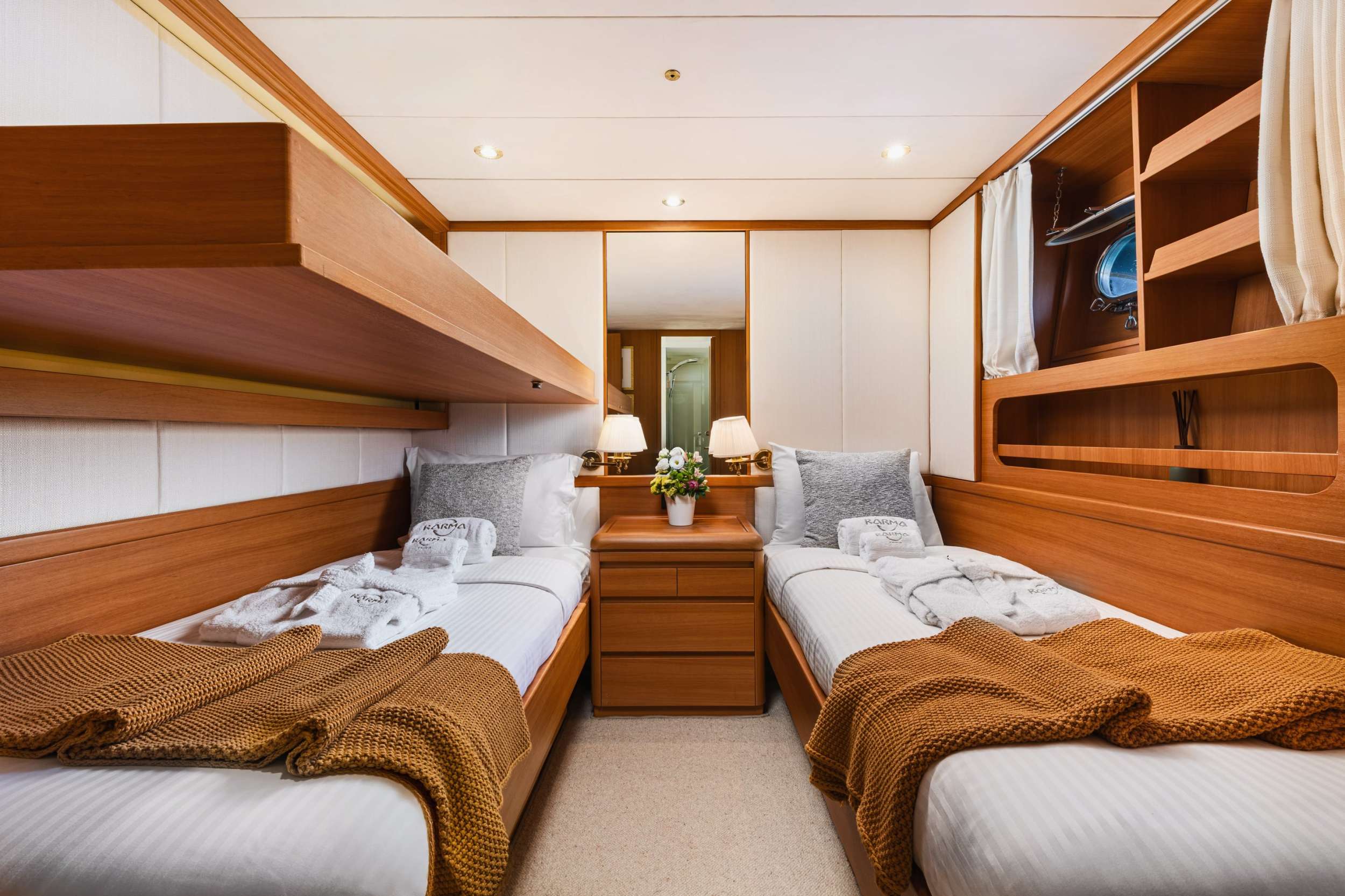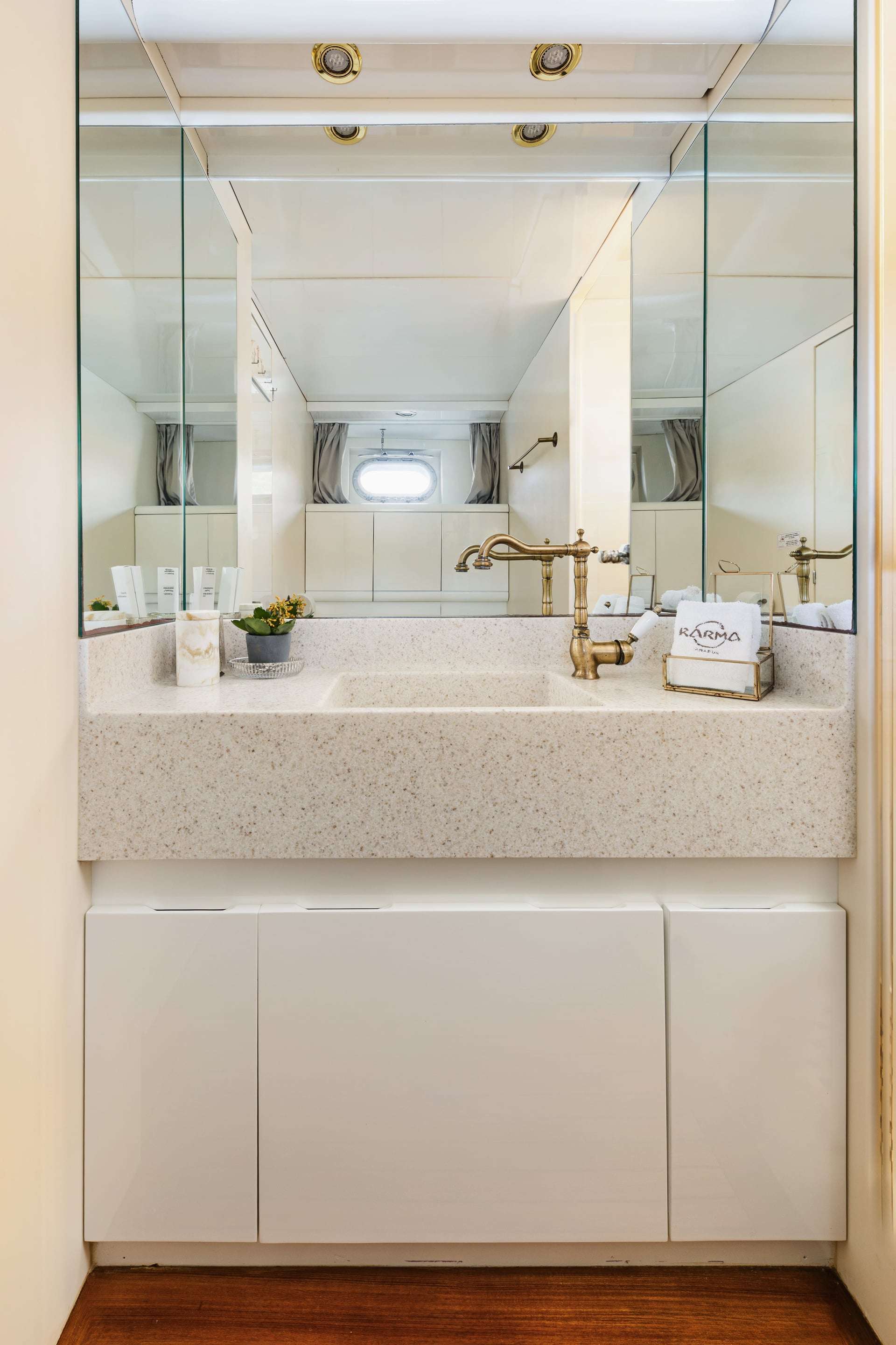 KARMA offers has 4 cabins below deck with ensuite bathrooms + 1 convertible lounge on main deck with ensuite WC 1 Master cabin, with double his and hers ensuite with shower and tub 1 VIP cabin, with ensuite bathroom 2 Twin Cabins with 2 single beds each. One of the Twin cabins has a pullman bed. Each Twin cabin has ensuite bathroom. 1 Lounge/Play Room-Cabin on the main deck , convertible to a Double, Twin or Single cabin (sofa converts to a double or into a single bed, or 2 single beds).This lounge benefits of the main deck day head as its ensuite WC. Crew cabins in separate quarters with ensuite facilities.