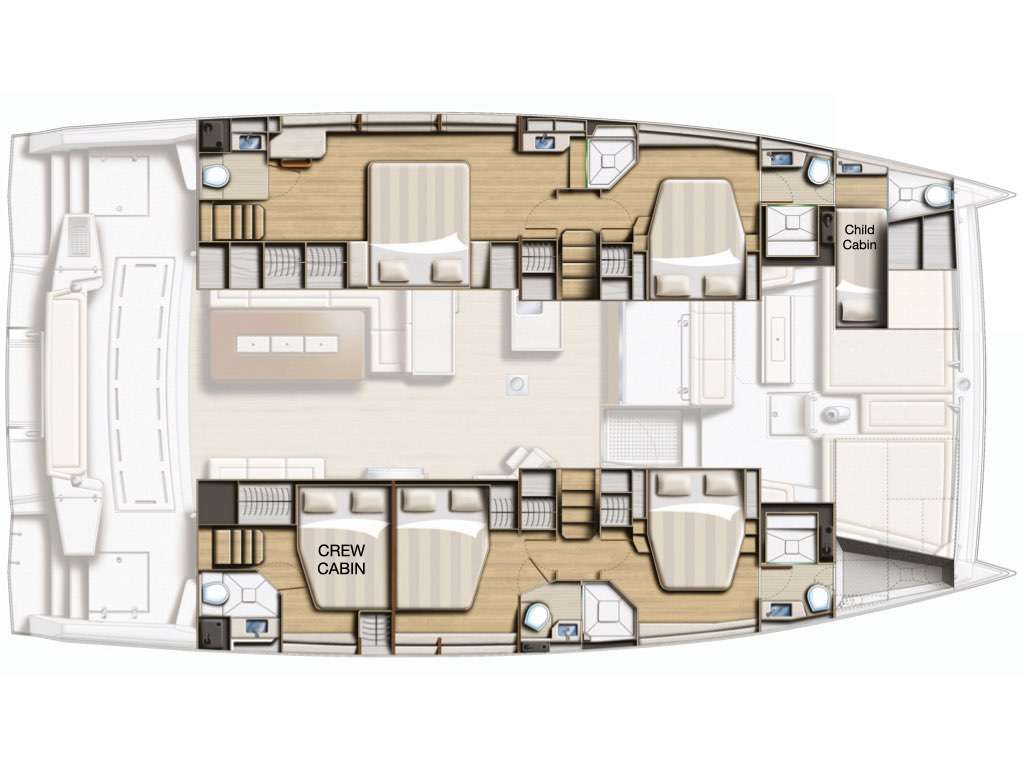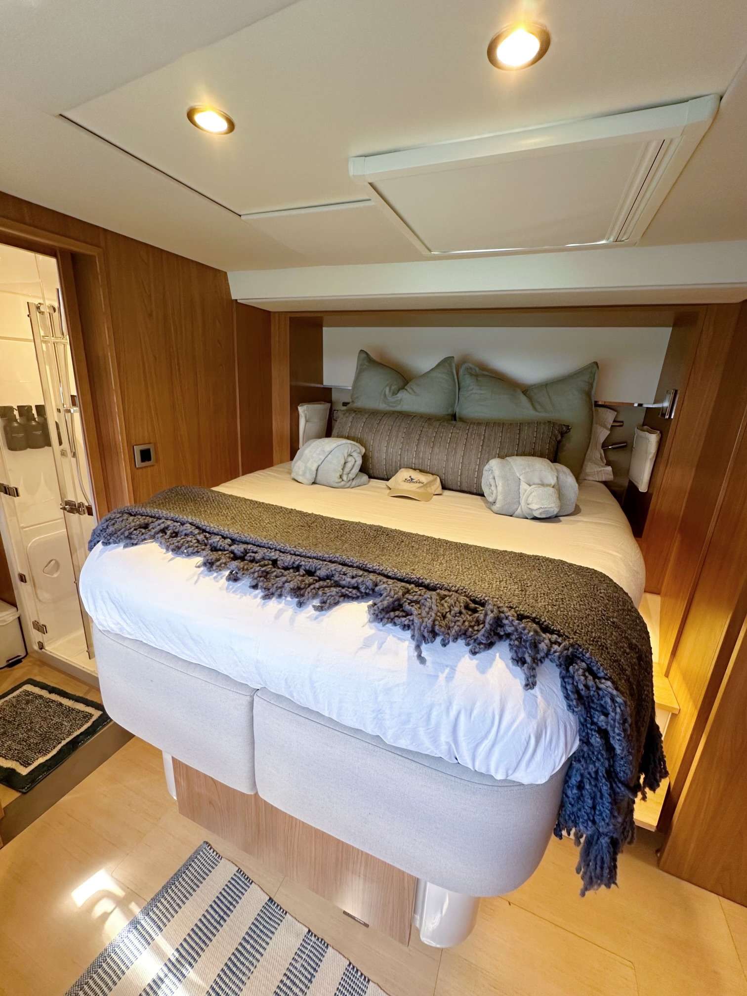 1 master cabin with dual entrances, one to the saloon and one to the aft deck, jump straight into the Ocean from there! The other 3 double cabins are all roomy and spacious, with full bathrooms and separate showers. No wet heads to be seen. All main cabins have full A/C and the temperature of each room is individually controlled. Small single cabin available on request, entrance is through Port fwd cabin. Great for children or teenagers.