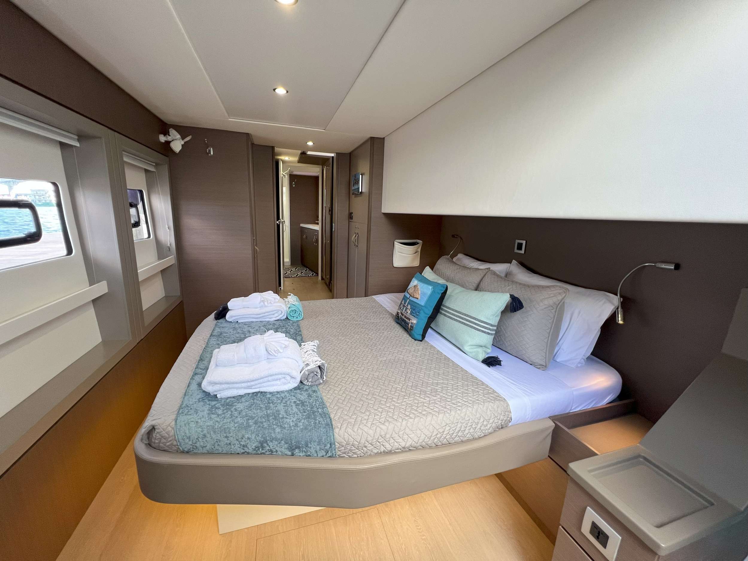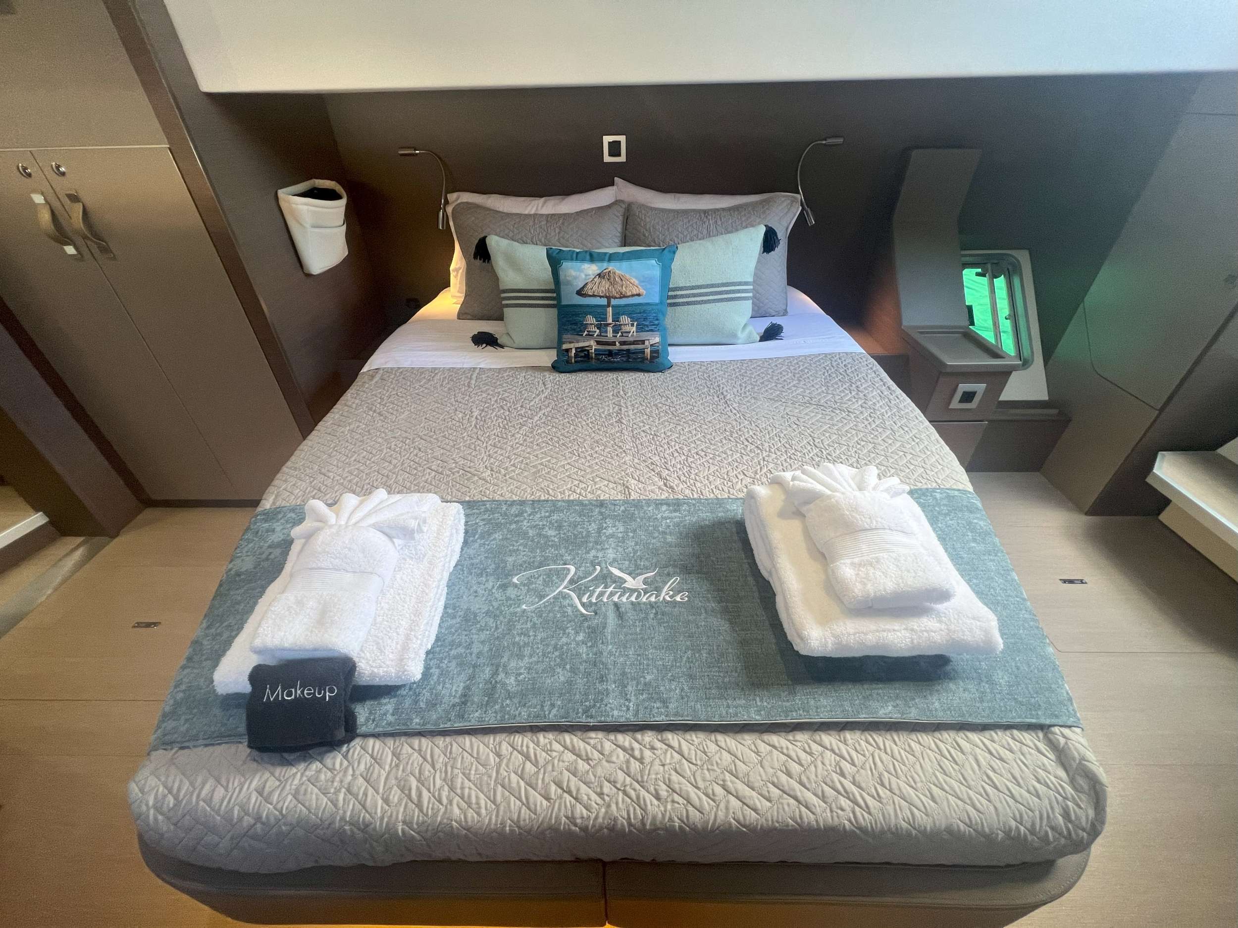 Kittiwake has several expansive living areas ideal for charter vacation, the perfect setting to entertain and soak up the sun. Kittiwake has three spacious and bright staterooms each with a private ensuite. The master cabin encompasses the entire port hull, with multiple large windows to enjoy the view. The starboard side consists of two queen cabins, with walk around beds, and one midship twin bunk cabin (crew cabin), and one queen aft cabin. The crew will vacate their twin bunk cabin for the aft queen should the twins be requested for charter.