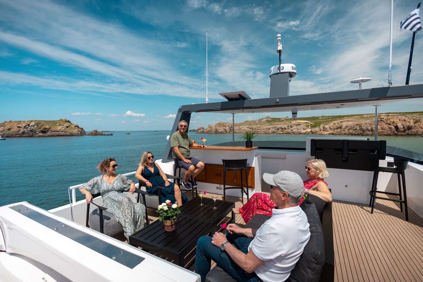 The spirit of L'INEDCIS has been placed on space, comfort and well-being on board. The equipment chosen for the yacht is of the highest quality, as is the nautical equipment. There is also a system for treating the water discharged by the yacht to avoid polluting the environment. L'Indécis offers three double cabins, one of which is on the same level, with an extraordinary sea view from your bed. You will also enjoy an incredible flybridge, undoubtedly one of the largest for a boat of this size. The two crew members have also been carefully selected to offer you an incredible stay aboard L'Indécis. Why a power trimaran? Quite simply for the incredible space, comfort and stability it offers, and for its incredibly low fuel consumption thanks to its three slim hulls and two additional electric engines, allowing you to arrive silently at idyllic anchorages. Welcome aboard for an incredible experience.