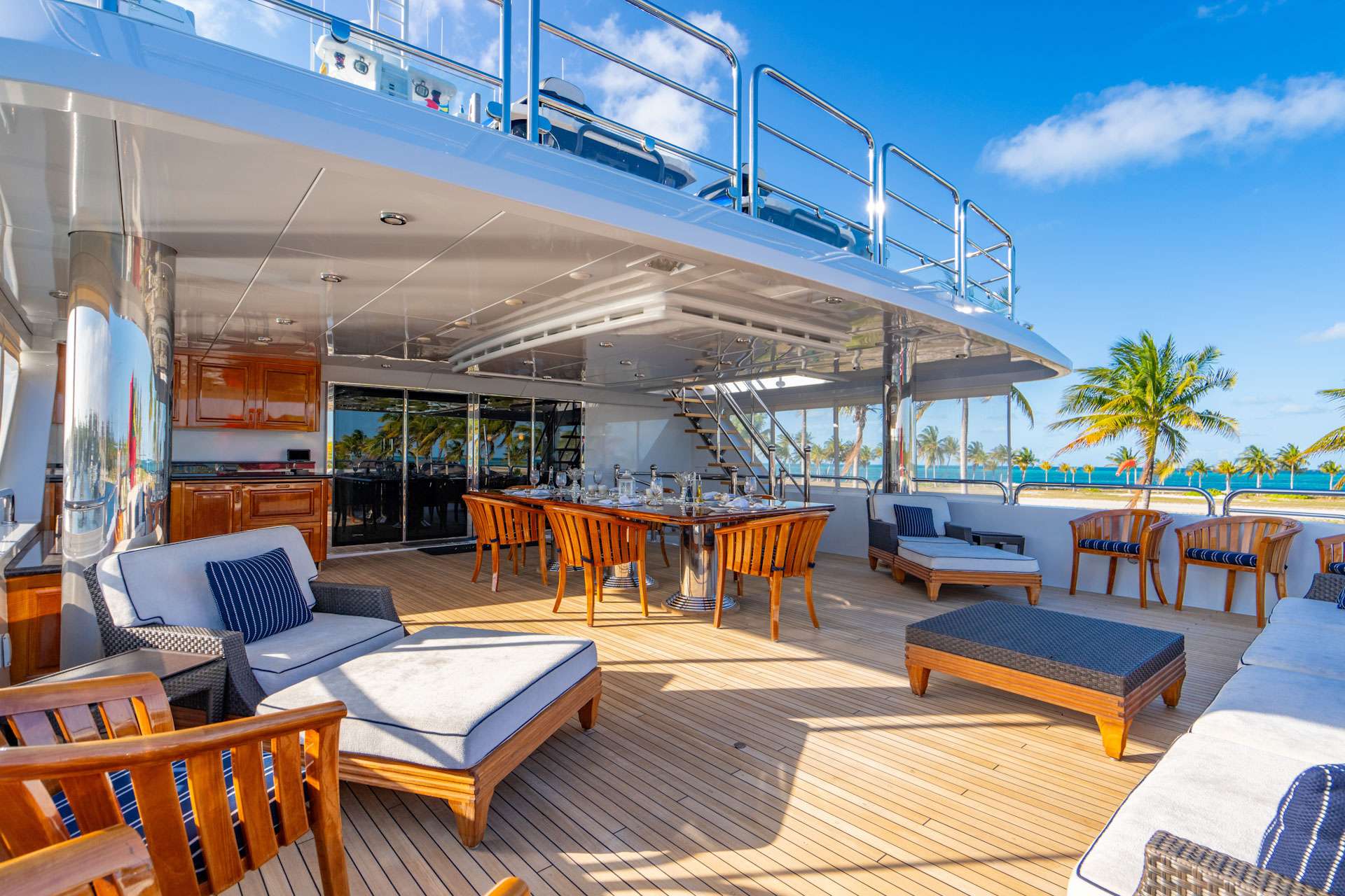 6 staterooms accommodating up to 12 guests, complimented by a professional crew of 9. All accommodations are equipped with an en suite, individual climate control, individual satellite receivers, Kaleidescape Entertainment System, complete blackout drapes, iPod docking stations, Crestron controls, reading lights, robes, slippers, hair-dryers, telephone, intercom, and Wi-Fi access. #1 - MASTER STATEROOM SUITE - Situated on the Main Deck. - Features an Owner's Office with desk with a chair, a 50" flatscreen TV, individual satellite receiver, computer, printer, and Wi-Fi access. - King bed faces aft - Features a 60" flat screen TV (hidden behind artwork), surround sound, vanity to port and couch to starboard. - Forward access to en-suite bath - Over sized Jacuzzi Tub (TV over tub) and heated floors - Separate shower, twin sinks, and toilet & bidet. - The entire Master suite features 6 very large oval windows offering stunning views and plenty of natural light. - Safe. iPod docking station. BELOW DECK Access to the 5 below guest staterooms are lead by a spectacular sculpted spiral stairwell with railings on either side. The guest foyer below also features a mini-bar. #2 - VIP GUEST STATEROOM: This FULL BEAM stateroom features a walk around King size bed, vanity/desk, and 50" flat screen TV. En-suite bath features an over-sized Jacuzzi tub, heated floors, shower, sink & toilet. Safe. iPod docking station. #3 - KING GUEST STATEROOM: This stateroom features a walk around King size bed, vanity/desk, and 36" flat screen TV. En-suite bath features a shower, sink & toilet. iPod docking station. #4 - KING GUEST STATEROOM: This stateroom features a walk around King size bed, vanity/desk, and 36" flat screen TV. En-suite bath features a shower, sink & toilet. iPod docking station. #5 - TWIN GUEST STATEROOM: This stateroom features a double bed, and a single bed, vanity/desk, and 36" flat screen TV. En-suite bath features a shower, sink & toilet. iPod docking station. #6 - TWIN GUEST STATEROOM: This stateroom features a double bed, and a single bed, vanity/desk, and 36" flat screen TV. En-suite bath features a shower, sink & toilet. iPod docking station. All staterooms have Molton Brown bath products, individual climate control, robes, slippers and hairdryers.