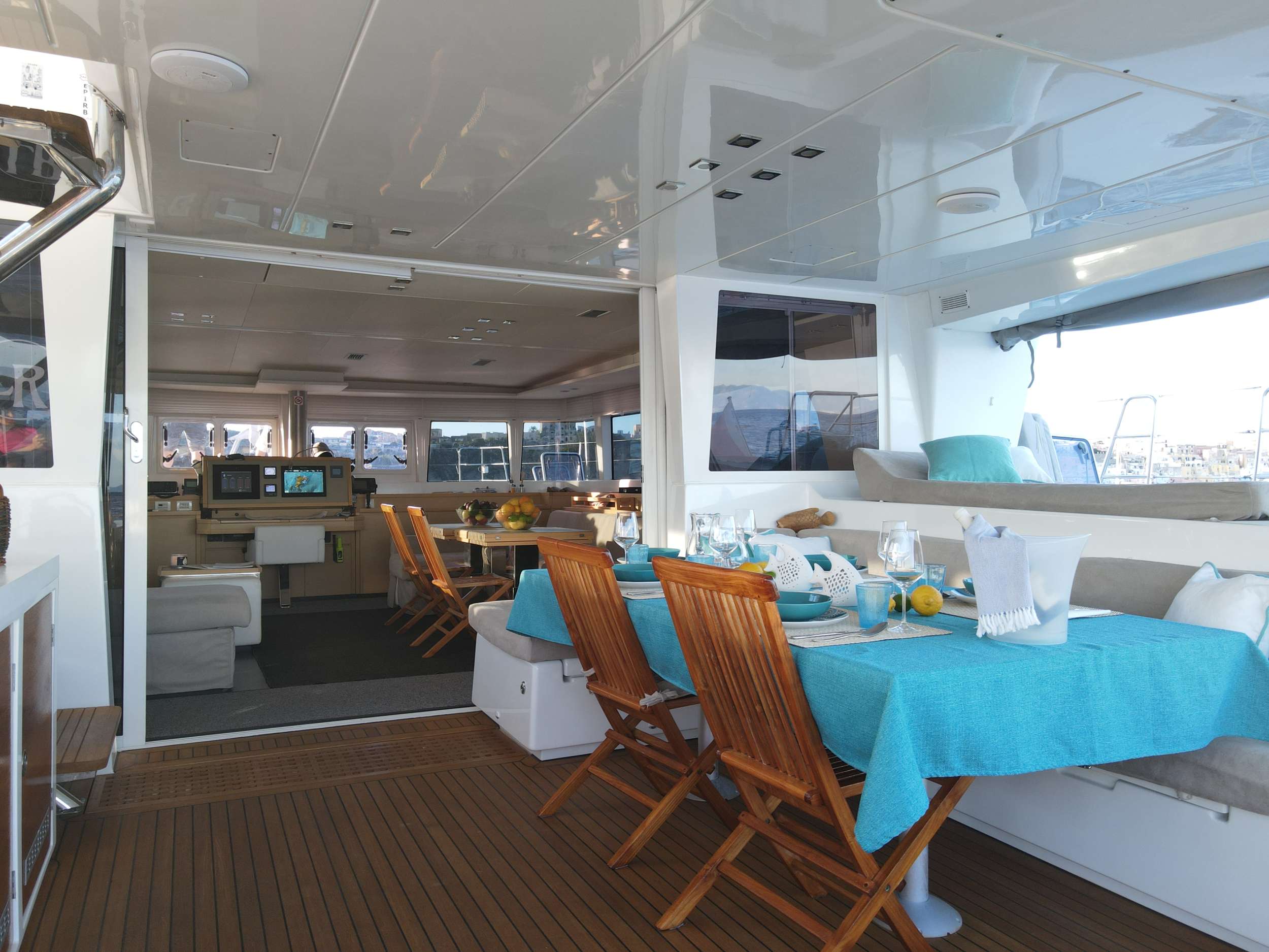 Interior: � Cabins: 4 bedroom suites (each with its own bathroom) � Sleeps: 8 (guests) + 3 crew � Bathrooms: 4 + 2 � Beds crew 2 + 2 bathrooms � dinette � kitchen on the hull of sx