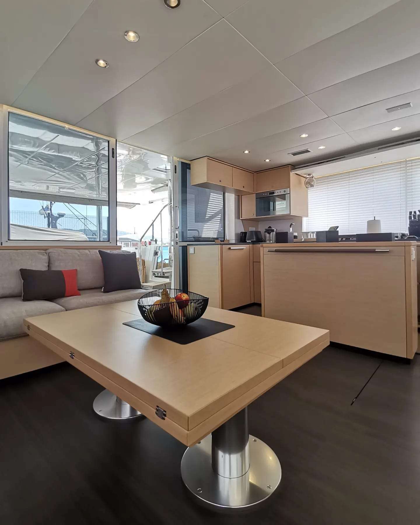 Featuring 5 spacious double cabins plus 2 separate crew cabins, the Lagoon 560 “Balthazar" is fully equipped with all the luxury extras for an unparalleled onboard experience: Air conditioning, generator, watermaker, teak wood finishes, electric toilets, TV entertainment system, sunbathing solarium, inverter, and professional-grade electronics to ensure comfort and safety throughout your voyage.