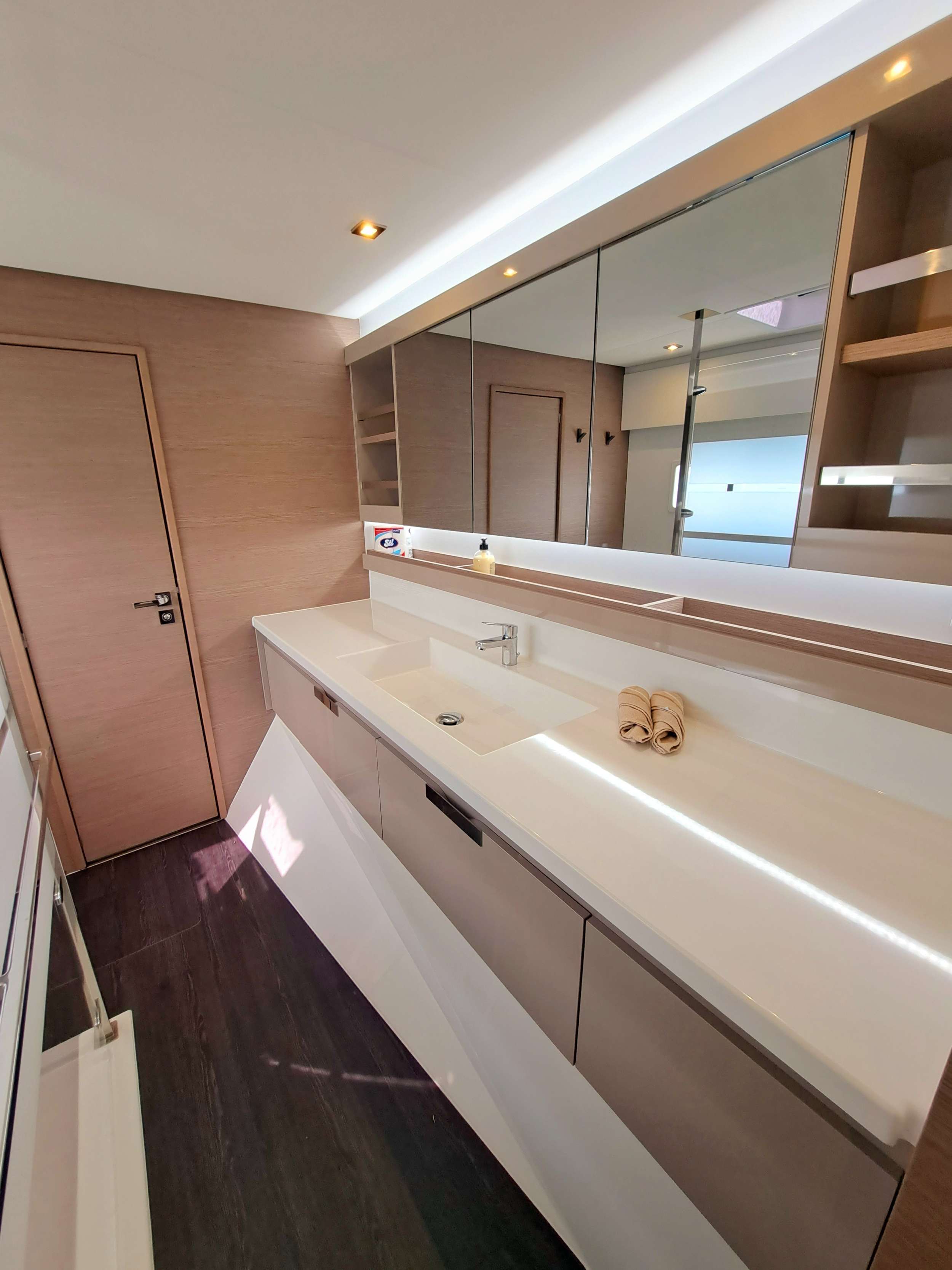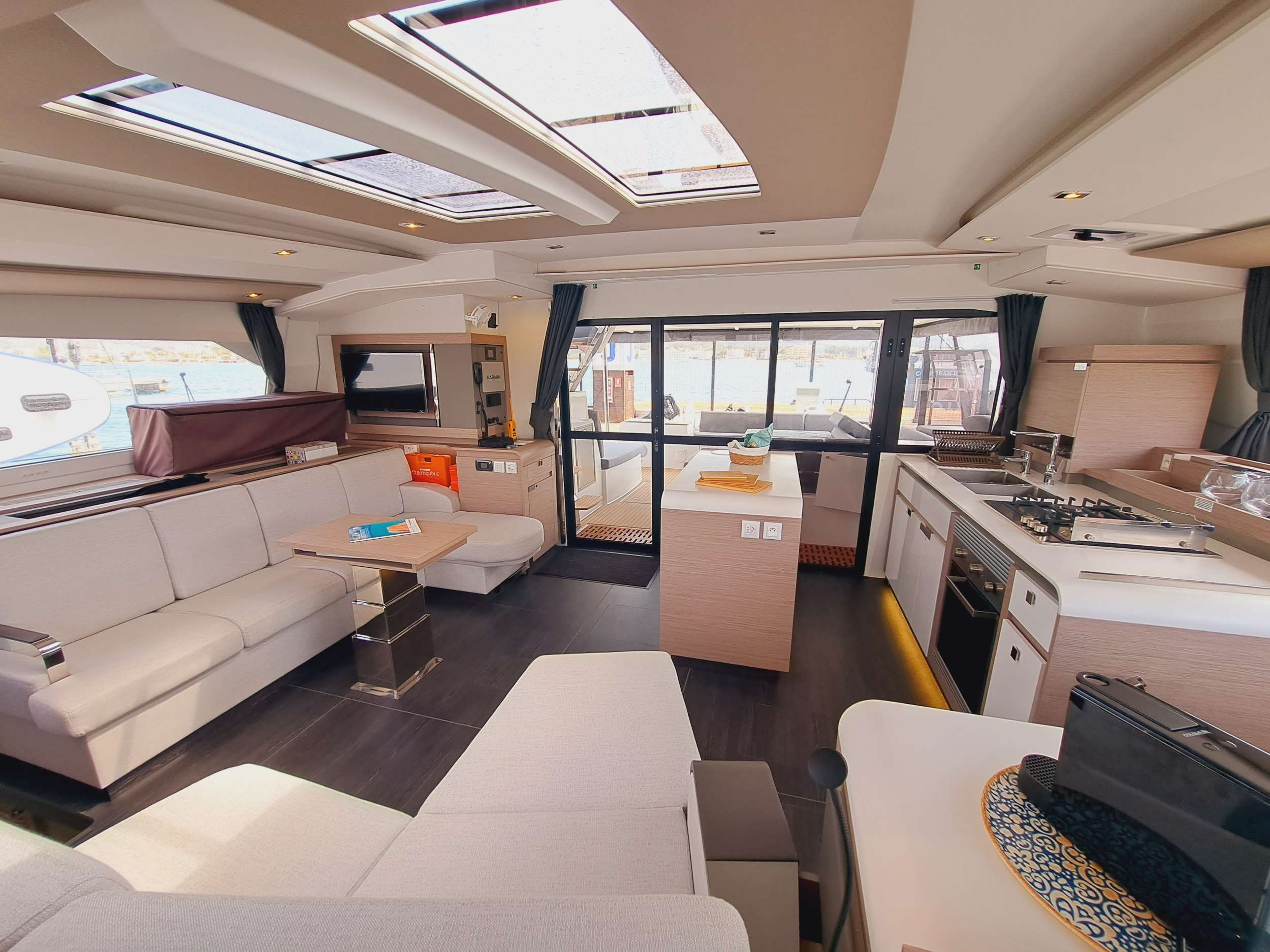 BOW AND AFT COCKPITS Semi-rigid bow cockpit with two large practicable nets. Teka bench and cushioned sundeck. Direct access to the aft cabins. Stern cockpit with gas barbecue. Hot and cold water on deck.. Sound system and beach platform. Underwater lights. Cockpit with teak floor Cockpit fridge with freezer SALOON AND FLYBRIDGE-COCKPIT Large sitting sofa with table. Multifunction electric table. Sliding door to aft cockpit Large storage capacity. Sun shield for the cockpit. Fully padded sundeck. Command post and cushioned armchair Console with engine panels, Plotter and navigation electronics displays.