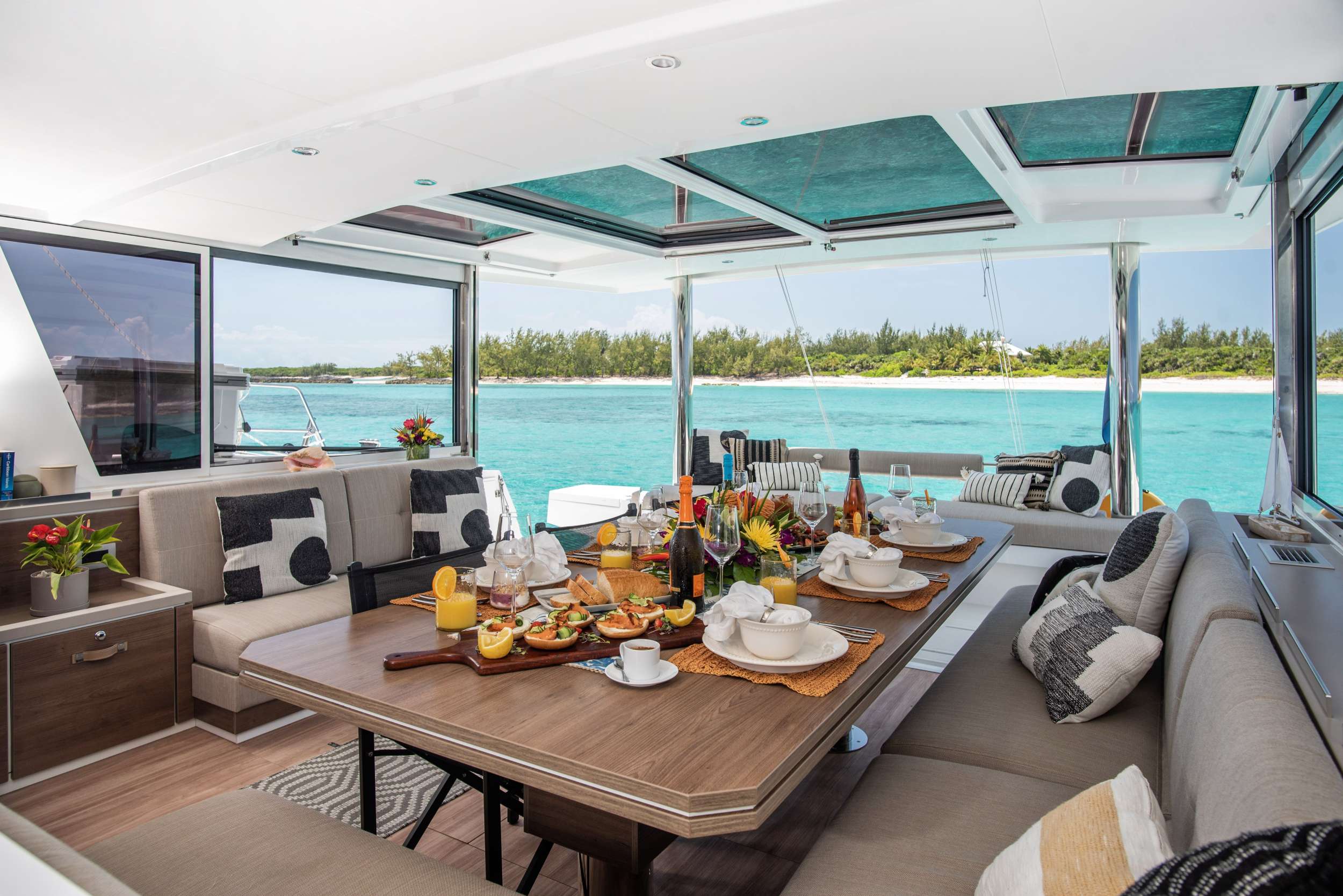 The luxurious sailing catamaran, LOCATION, is a superb example of what Bali can design. As you step on board in to a beautifully appointed cockpit, complete with teak floors and dining table for ten and a comfortable lounging bench, you immediately realize what a unique charter experience you are about to have. As you make your way up to the flybridge you'll be blown away by the amazing turquoise water with 360° views and enjoy the up-close view of the sails. It's also a great place to read your favorite book or a favorite spot for appetizers and cocktails at sundown. The main salon is comfortable and luxurious with open spaces and natural light fed by all the windows surrounding you. All guest cabins are spacious with large windows and offer plenty of natural light. For your comfort, every cabin offers queen sized beds and private baths with dedicated shower stalls as well as individual cabin A/C control. The high level of finishing throughout every cabin reflects the luxury that you would expect from a yacht of this caliber. With all the different areas, LOCATION is show-stopper and has enough amenities for everyone to enjoy!