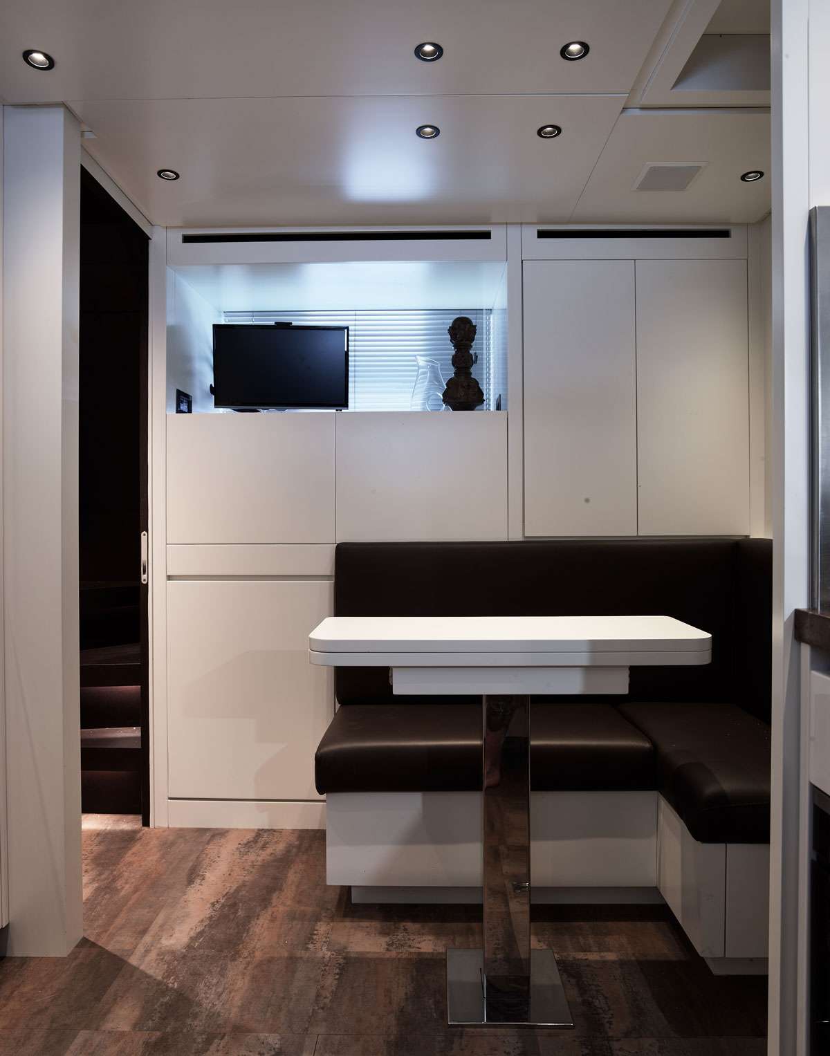 The Sanlorenzo SX 88 Luar offers accommodation to up to 8 (+1)* guests in 4 ensuite guest staterooms. The owner stateroom in the main deck forward, Two VIP cabins and a twin cabin with sliding beds convertible into one double bed in the lower deck. * If possibile, an extra single cabin connected to the adiacent VIP cabin offers accommodation for one guest, preferrably a child.