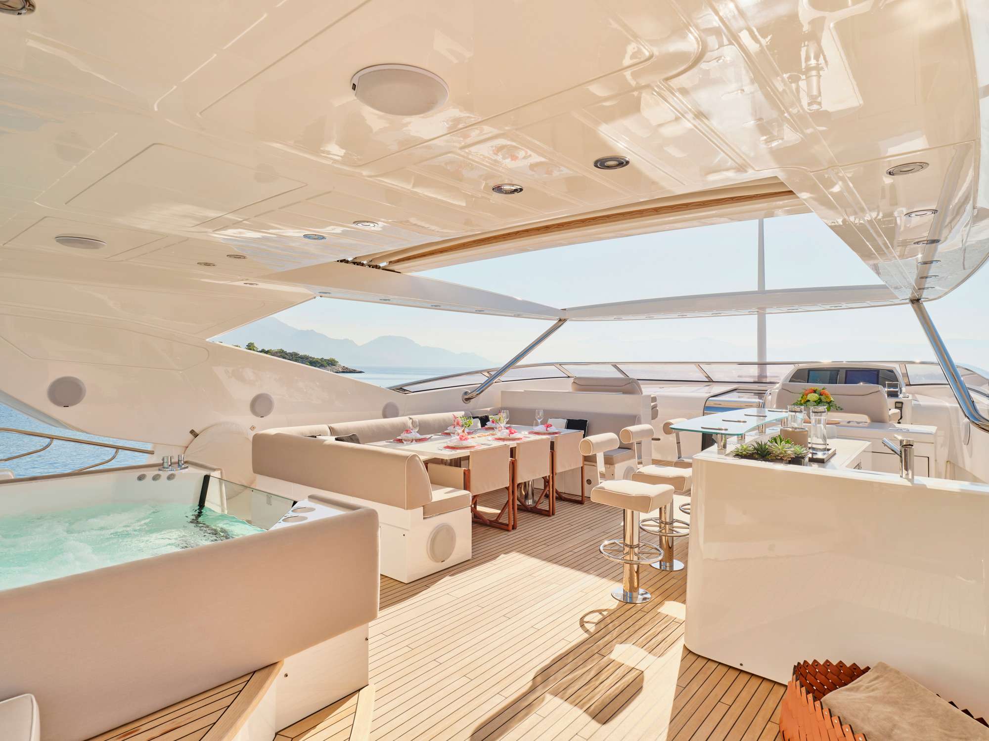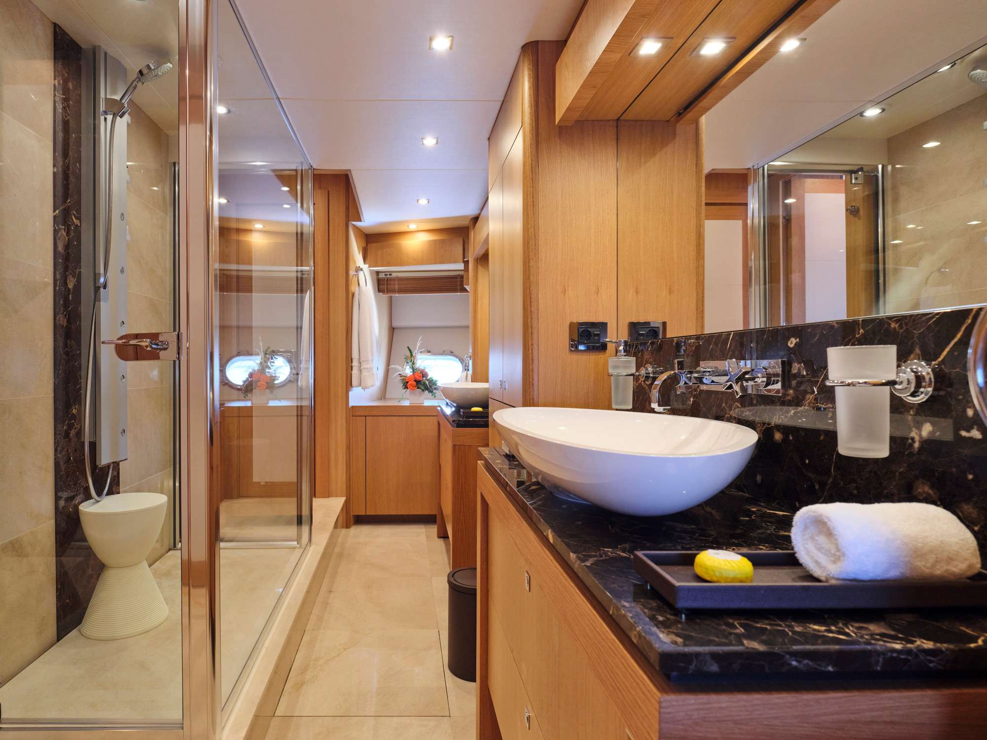 Master Cabin on Main Deck with with king size bed dual-entry en-suite facilities in marble. Two sinks, shower and walk-in closet in bathroom. Second Walk-in closet, safe, desk, sofa and TV in cabin. Two more double Cabins on the lower deck, both with queen size bed, safe, walk-in closet and en-suite facilities. Two twin cabins with extra pullman bed on the lower deck. Safe in both cabins.